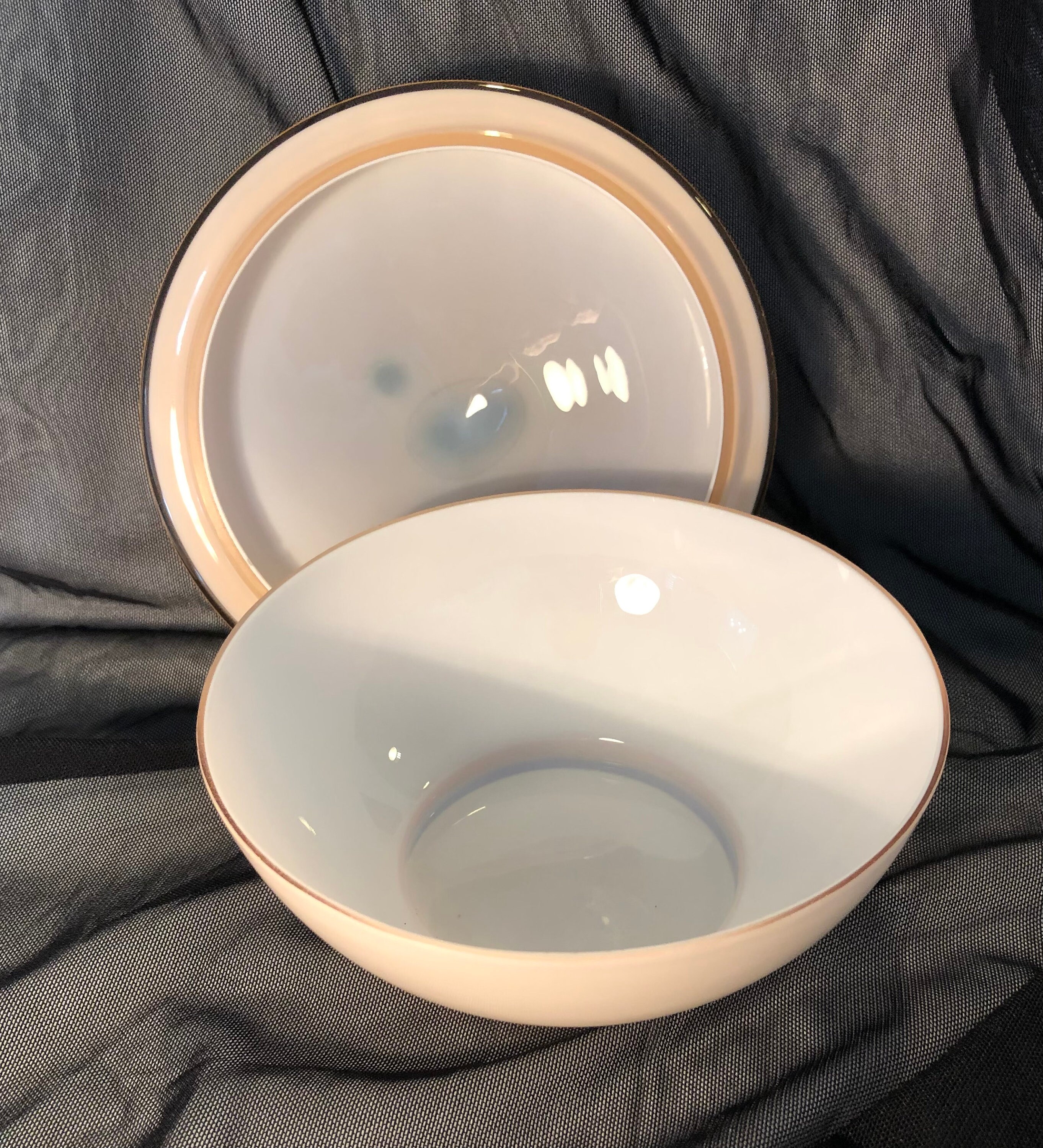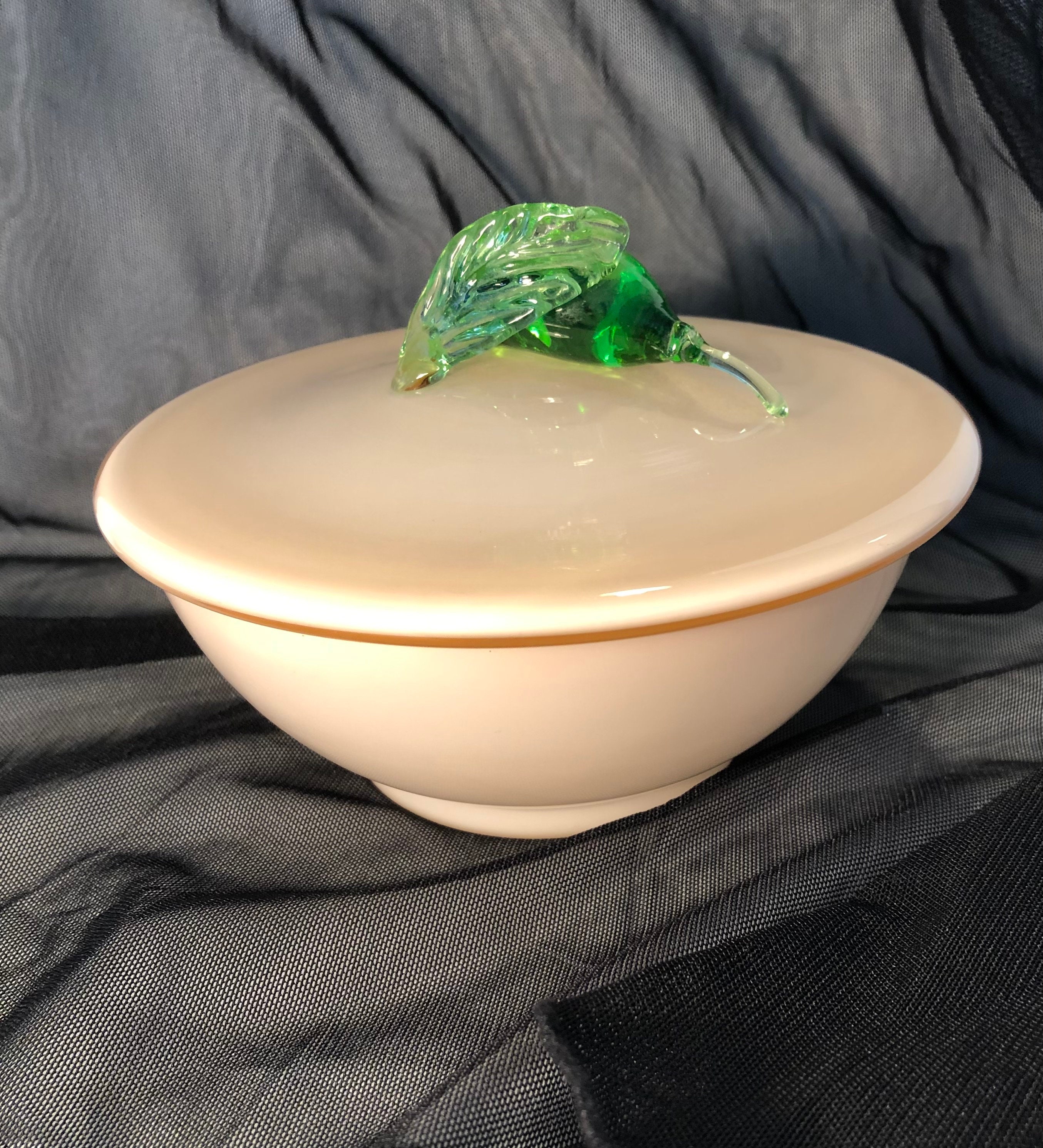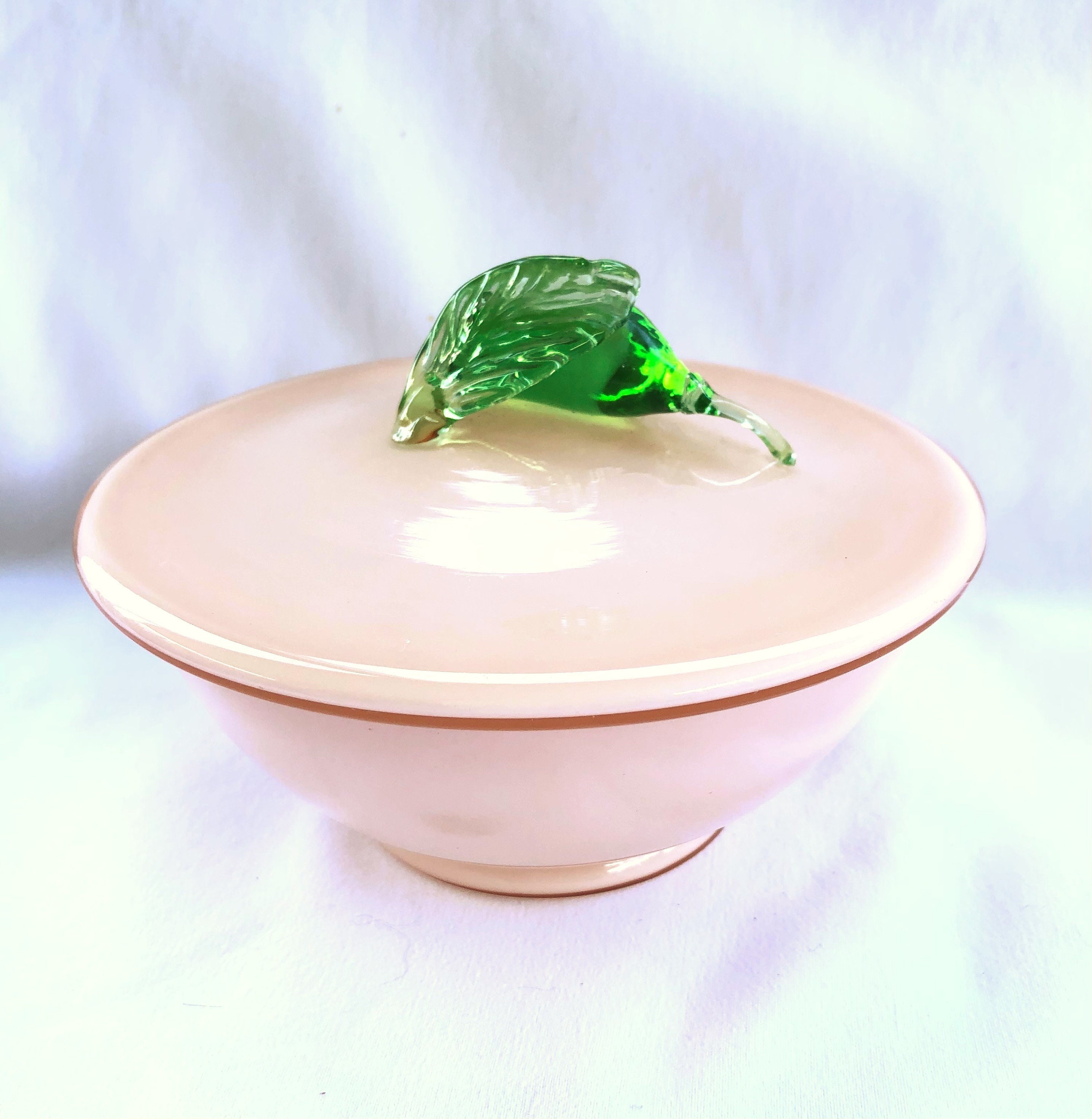 Beautifully cased Pink over White Covered Bowl with a green pear with leaf applied finial, speaks of elegance and exquisitely designed art glass. No chip, crack or scratches. It measure 5" in diameter (mouth of the bowl) and 3" high. This piece has been a part of my personal art glass collection since 1970. “Experts” have suggested all of the above, but I have not been able to find conclusive evidence regarding the maker. It is beautifully and exquisitely executed!