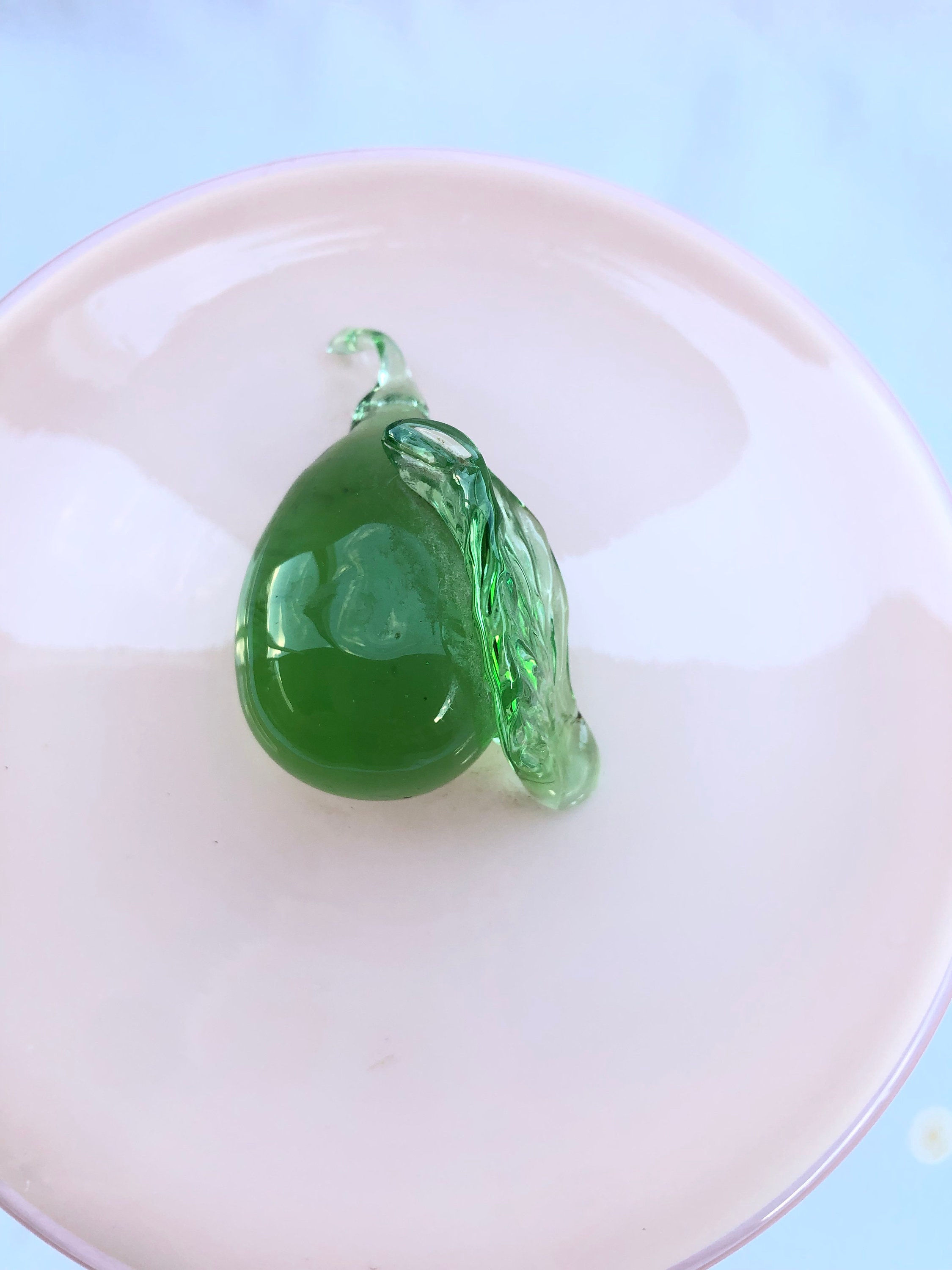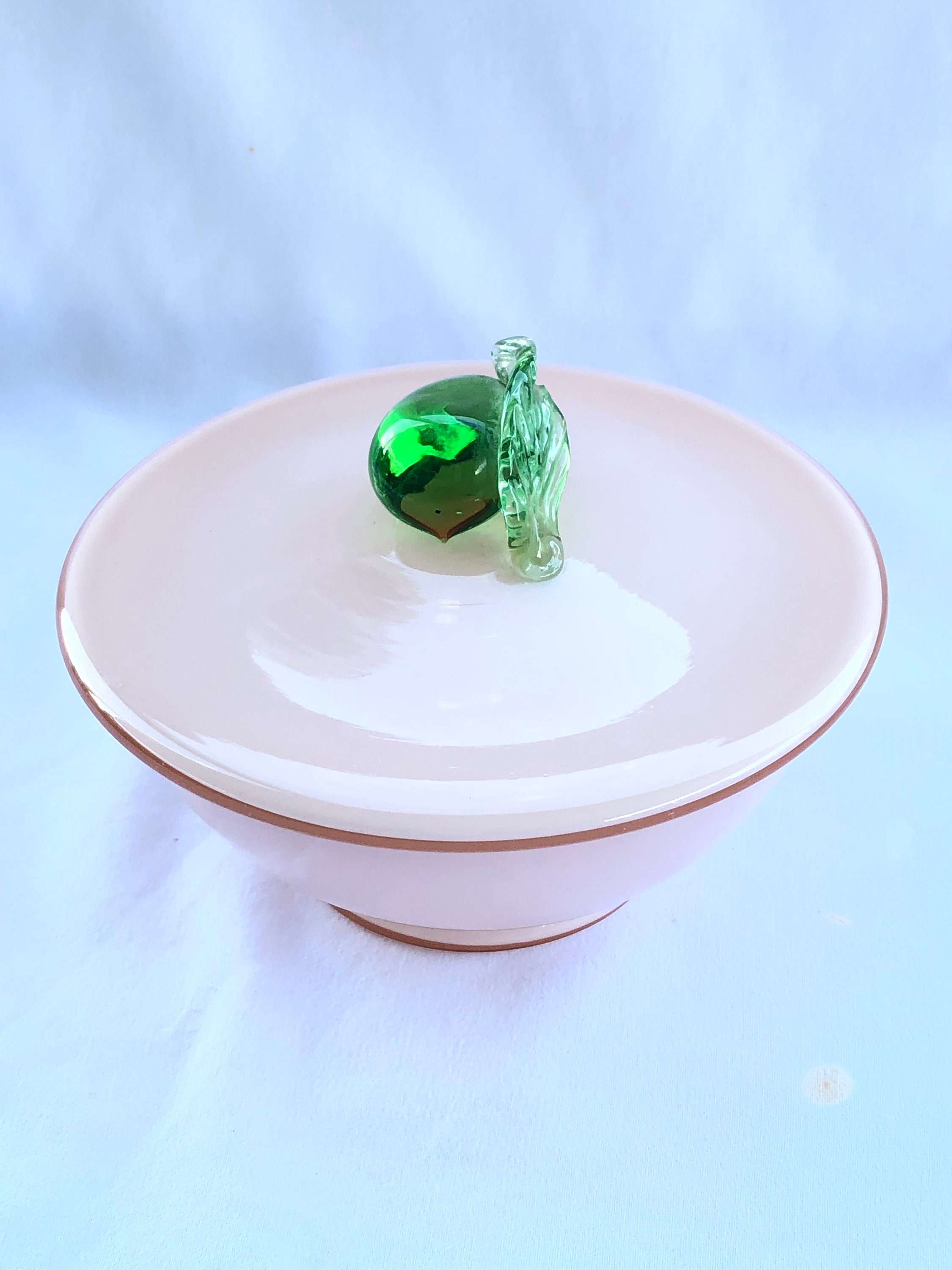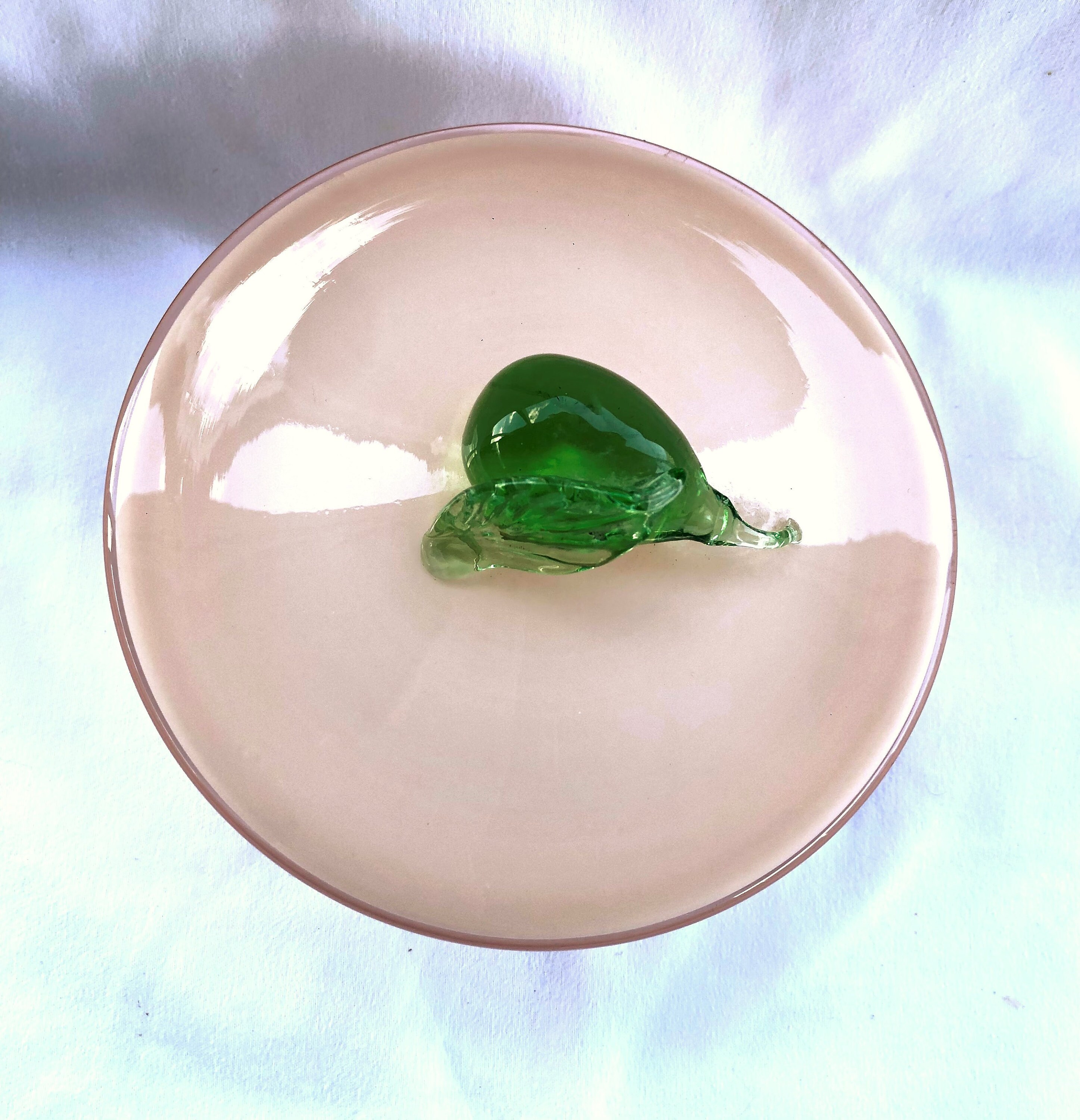 Beautiful and Rare! Alfredo Barbini?,Murano?, Checz? I’ve owned it for over 50 years Pink Cased Hand Blown Covered Bowl with Applied Handle (Green Pear with Leaf) Very unlikely that you will find another like it.