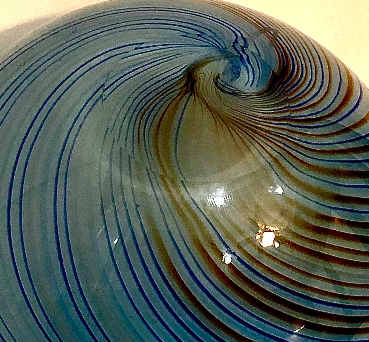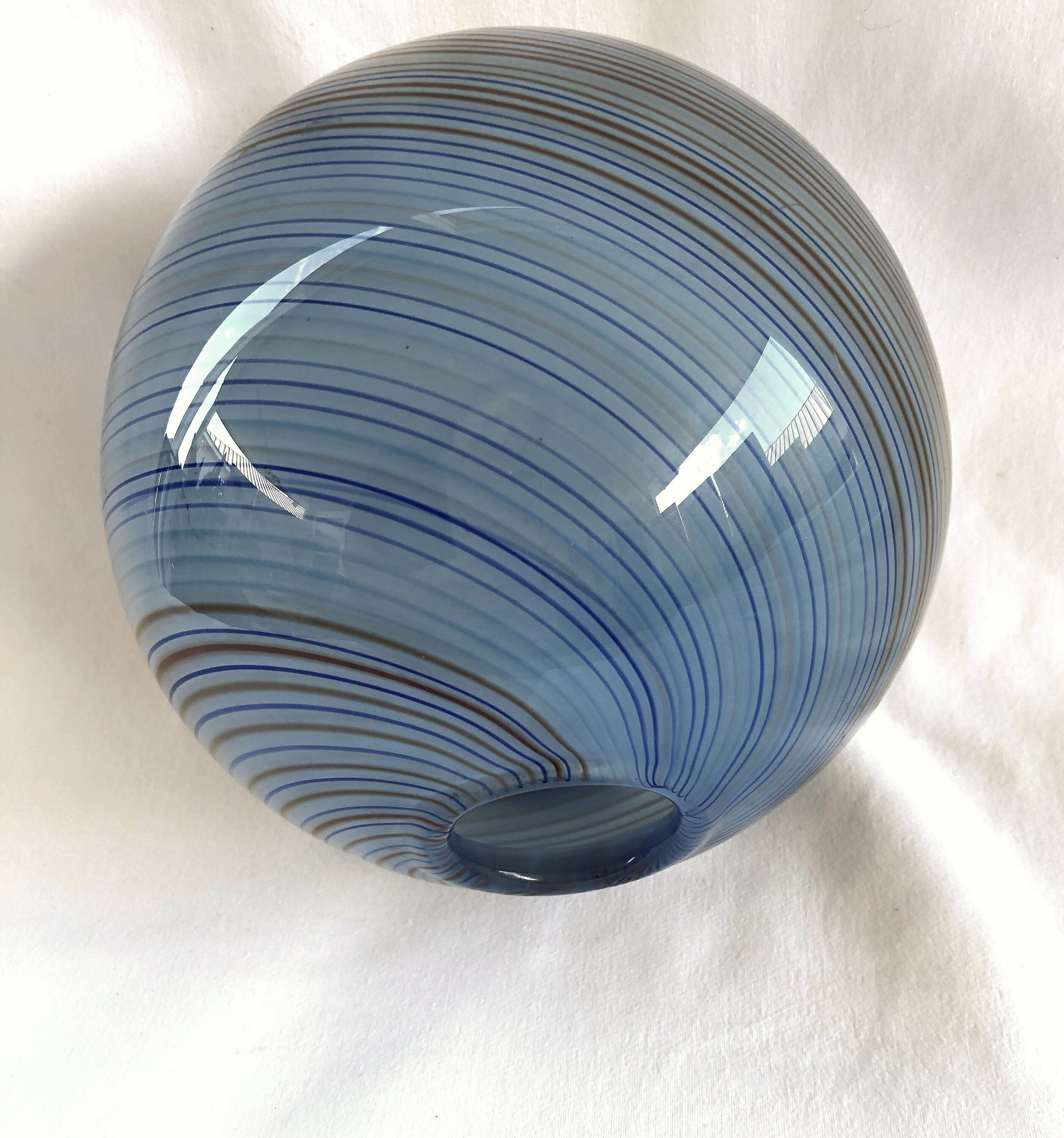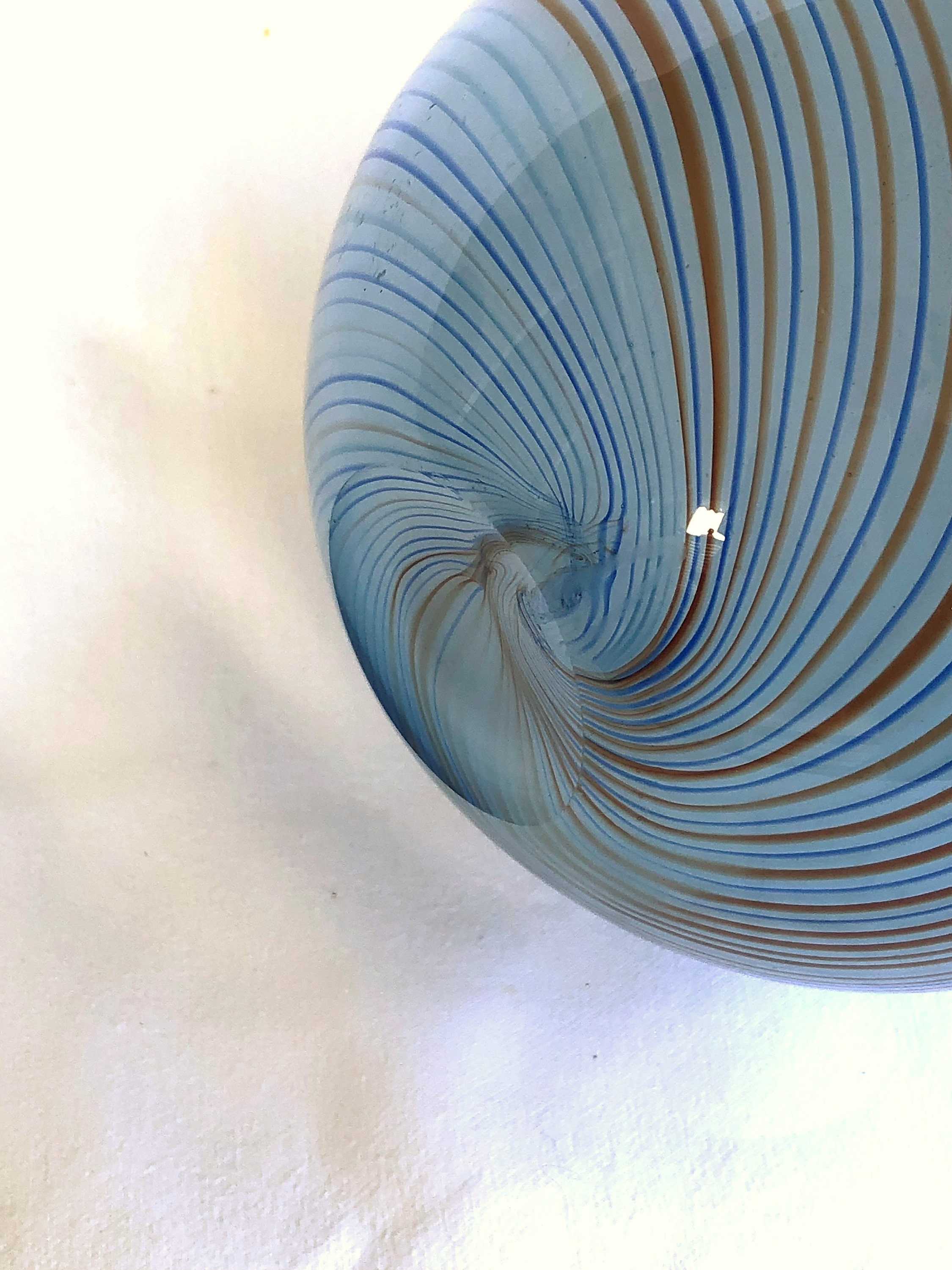 Vintage Dansk Hand Blown Round Glass Vase (Sometimes referred to as a "rose bowl vase"; measuring 5" H x %' Diameter. Spiraling colors of blue and rust accent the simple round design of the smokie blue base color of this elegant art glass vase. Pre=owned with loving care, no cracks, chips or scratches. Beautifully executed smooth, concave pontil (see photo)