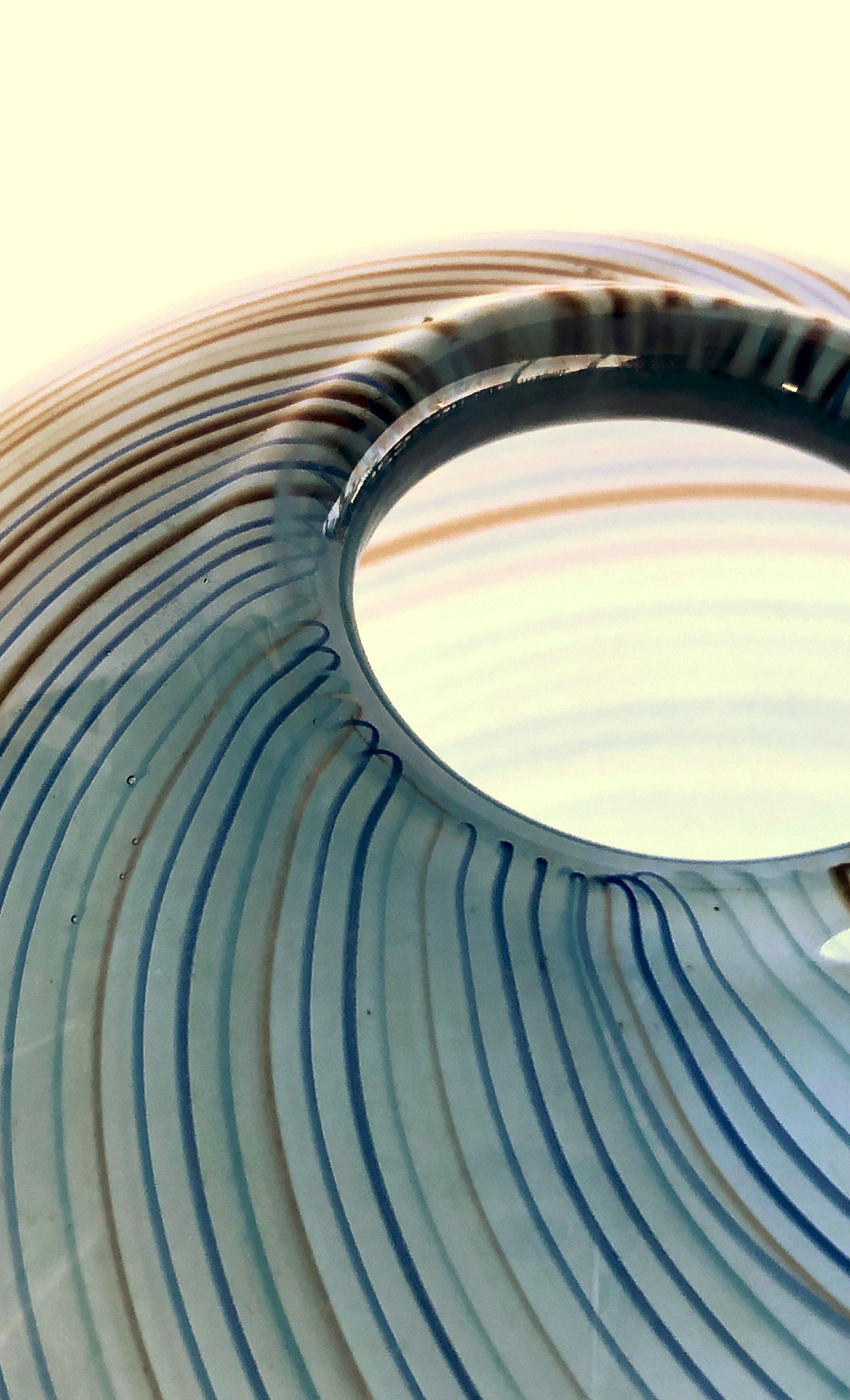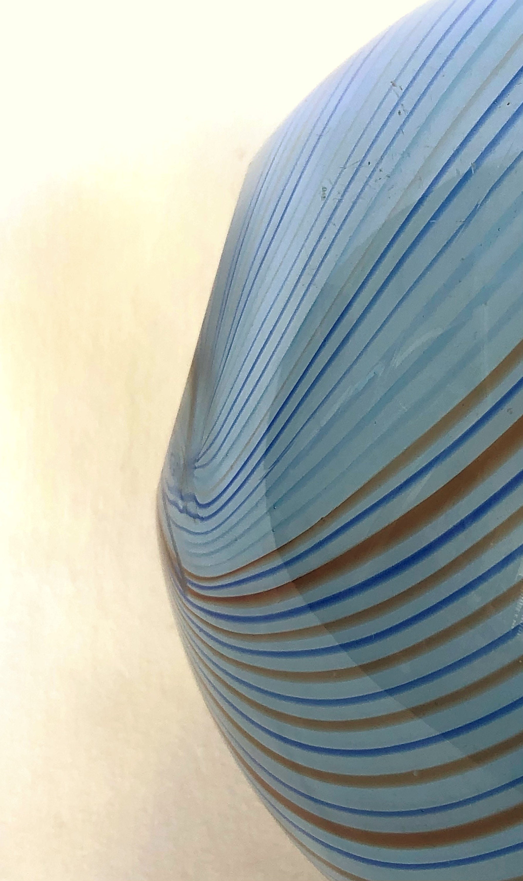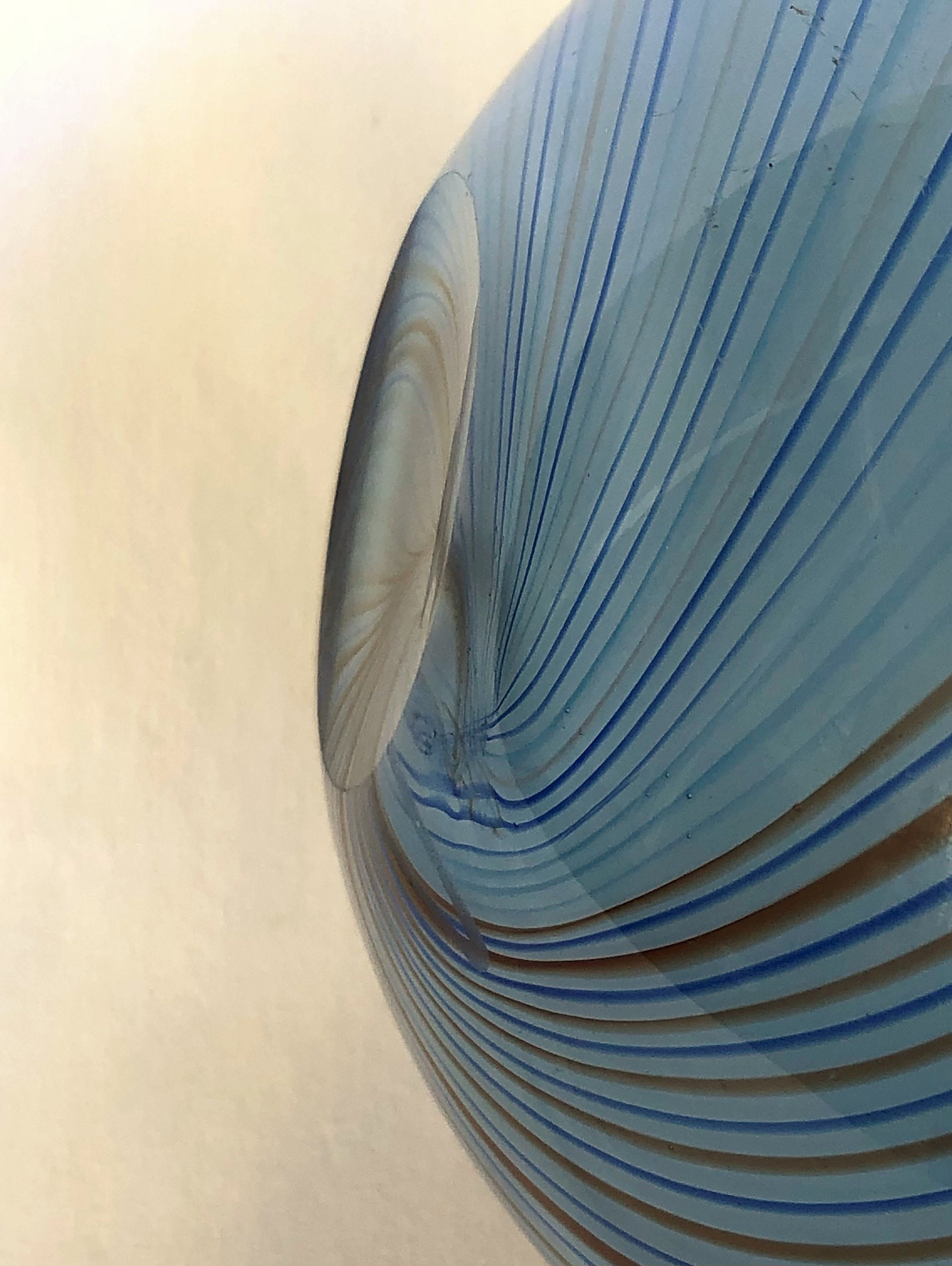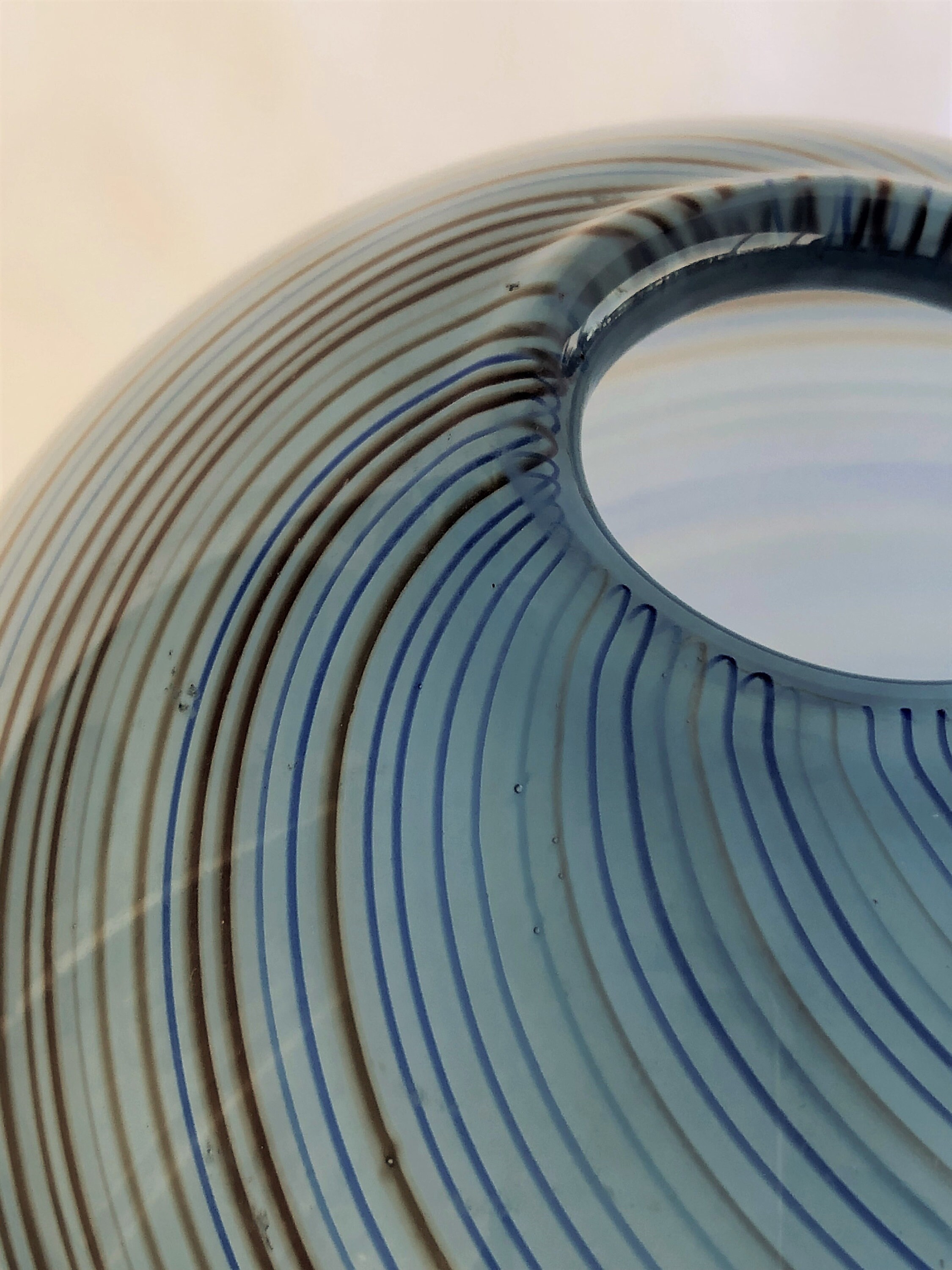 Vintage Dansk Hand Blown Round Glass Vase (Sometimes referred to as a "rose bowl vase"; measuring 5" H x %' Diameter. Spiraling colors of blue and rust accent the simple round design of the smokie blue base color of this elegant art glass vase. Pre=owned with loving care, no cracks, chips or scratches. Beautifully executed smooth, concave pontil (see photo)