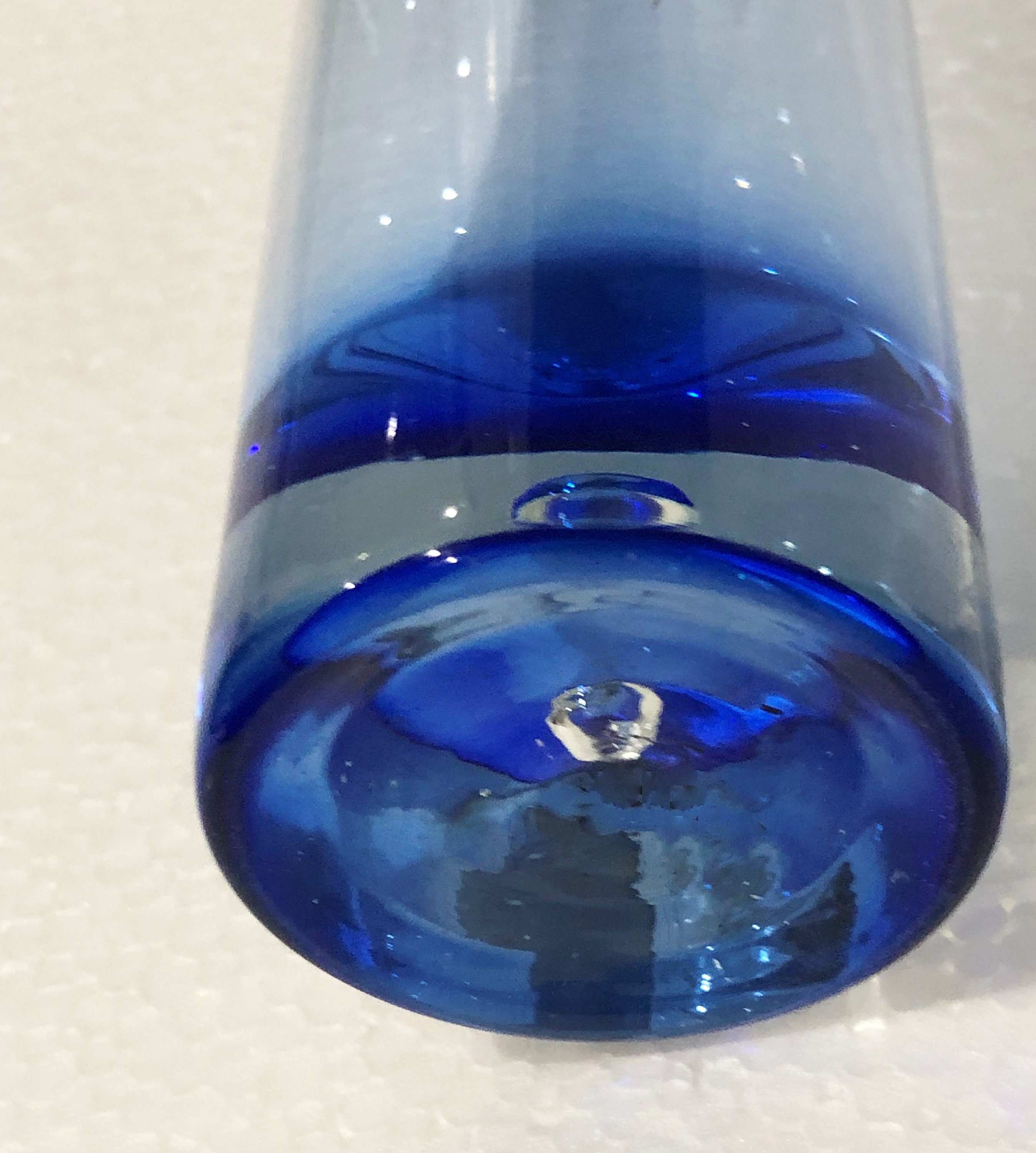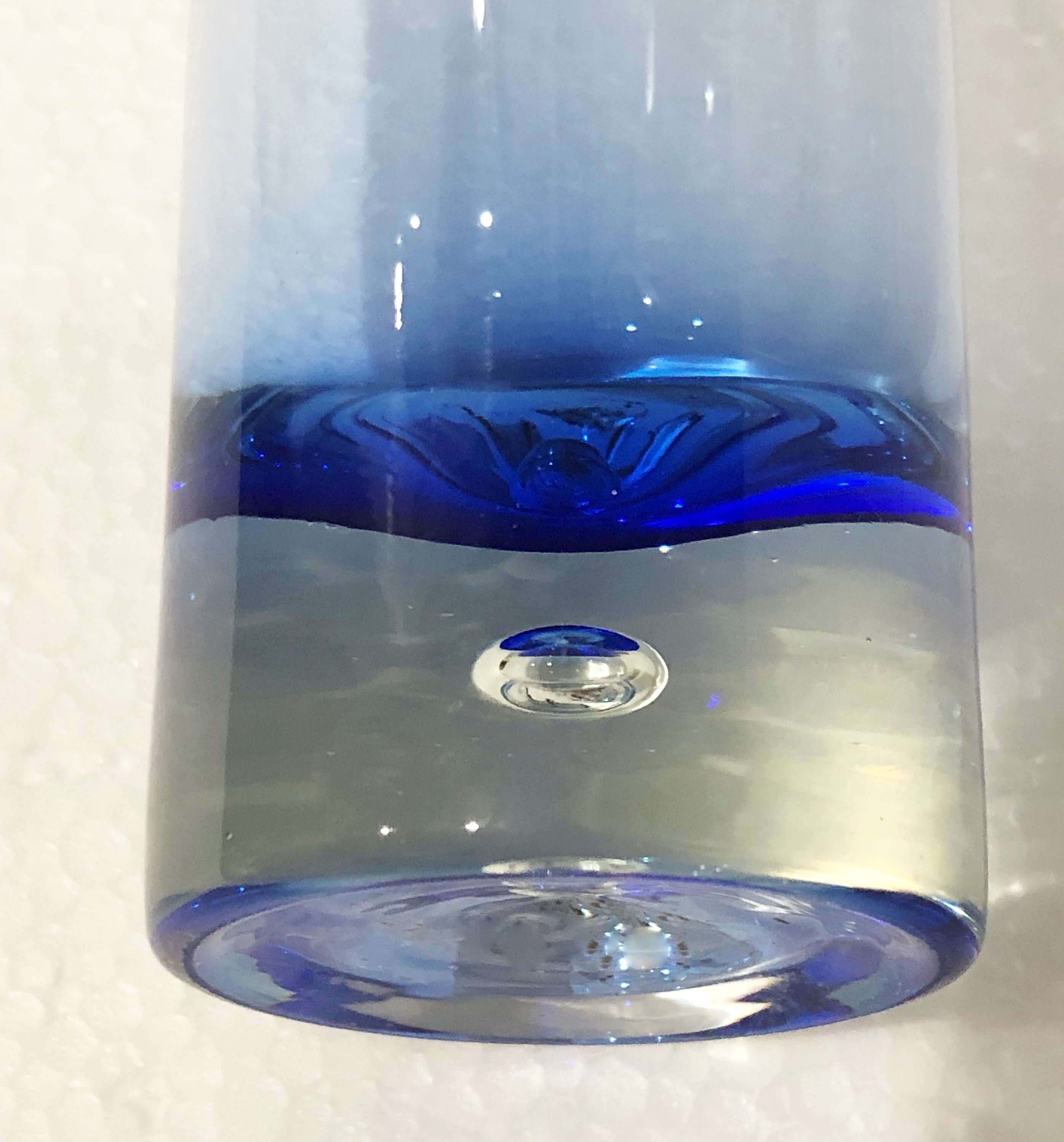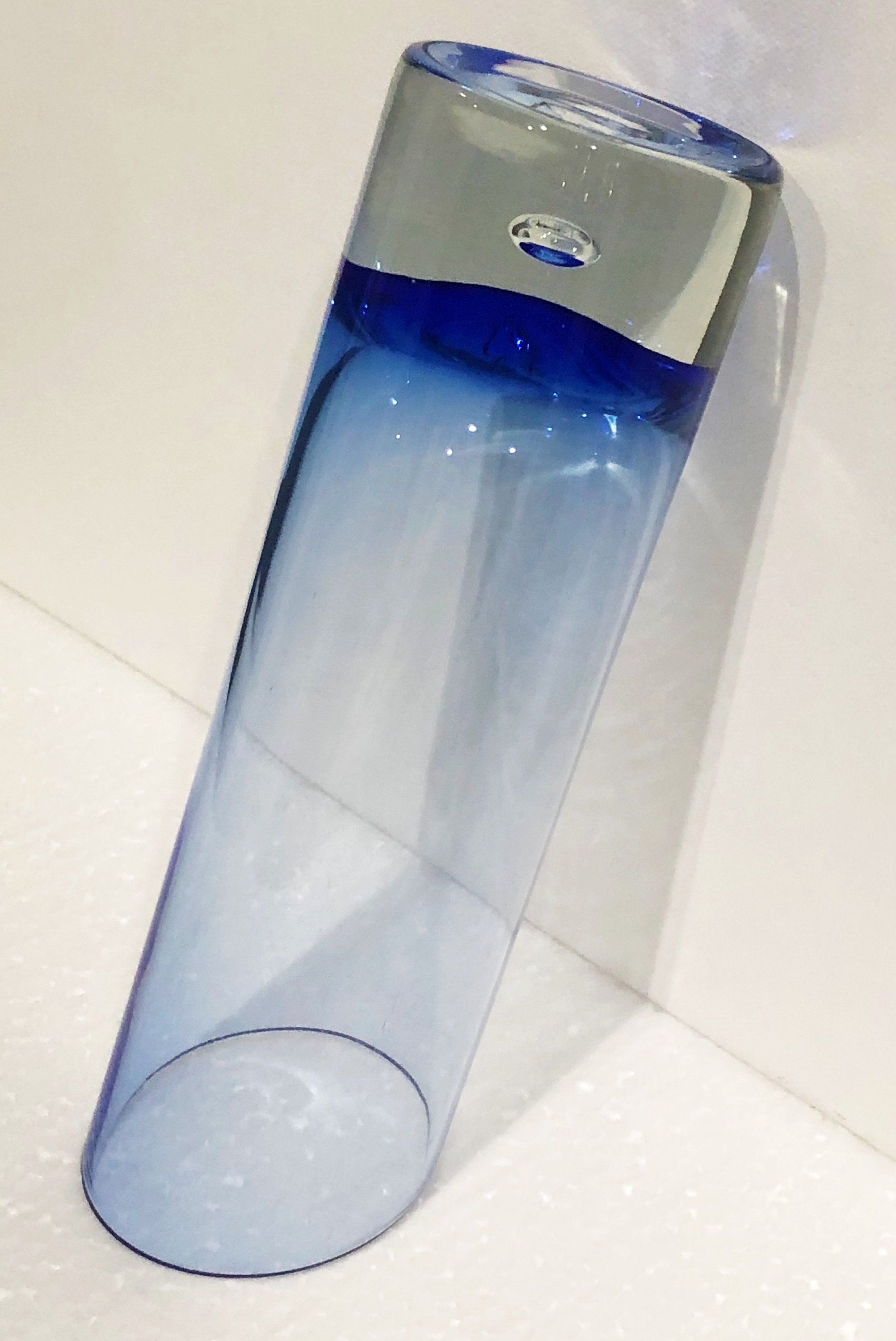 Beautifully executed Krosno Holmegaard Hand Blown Asymmetrically Cut Tumbler, High Ball Glass in a Smokey Cobalt Blue with a controlled bubble in the clear base.