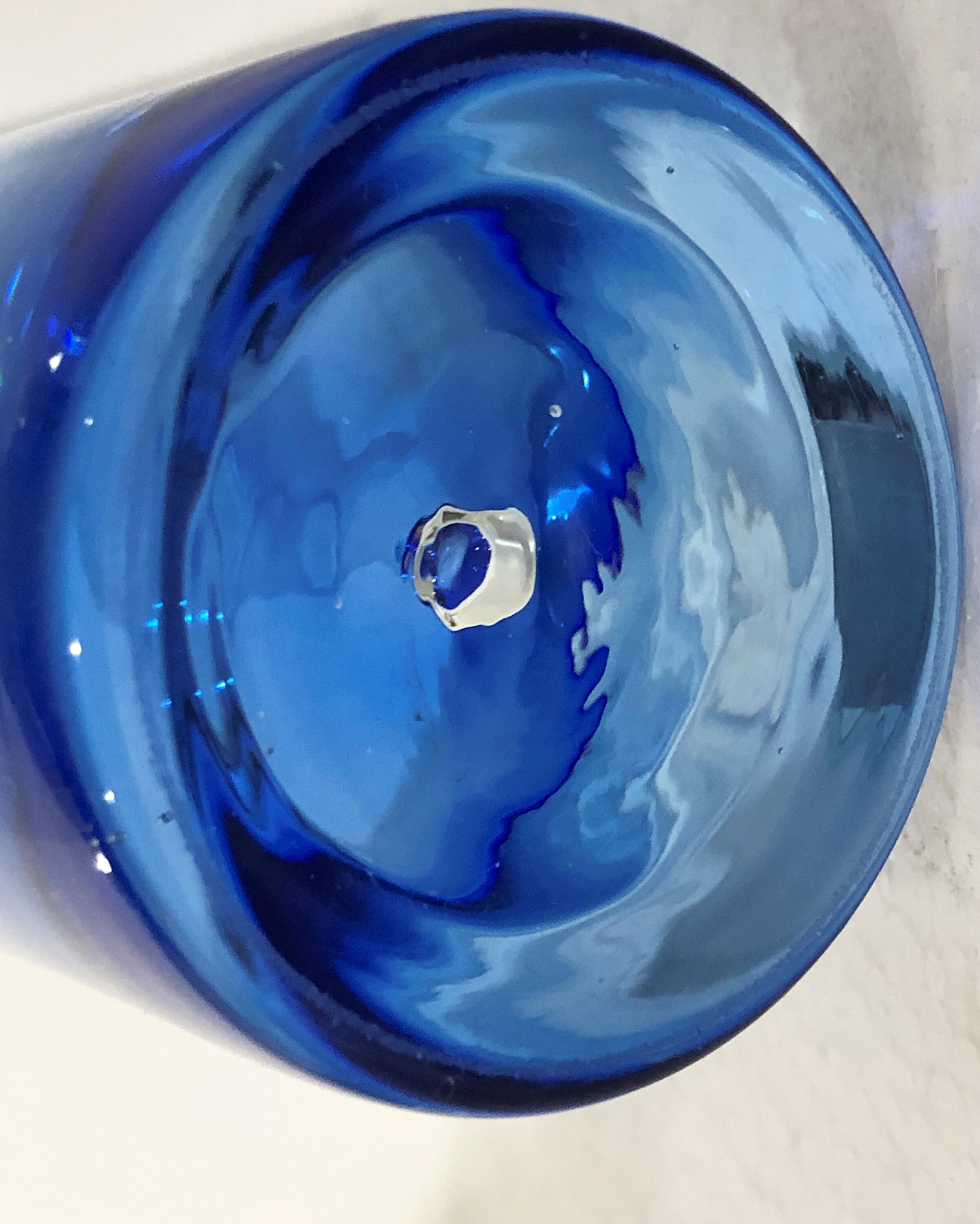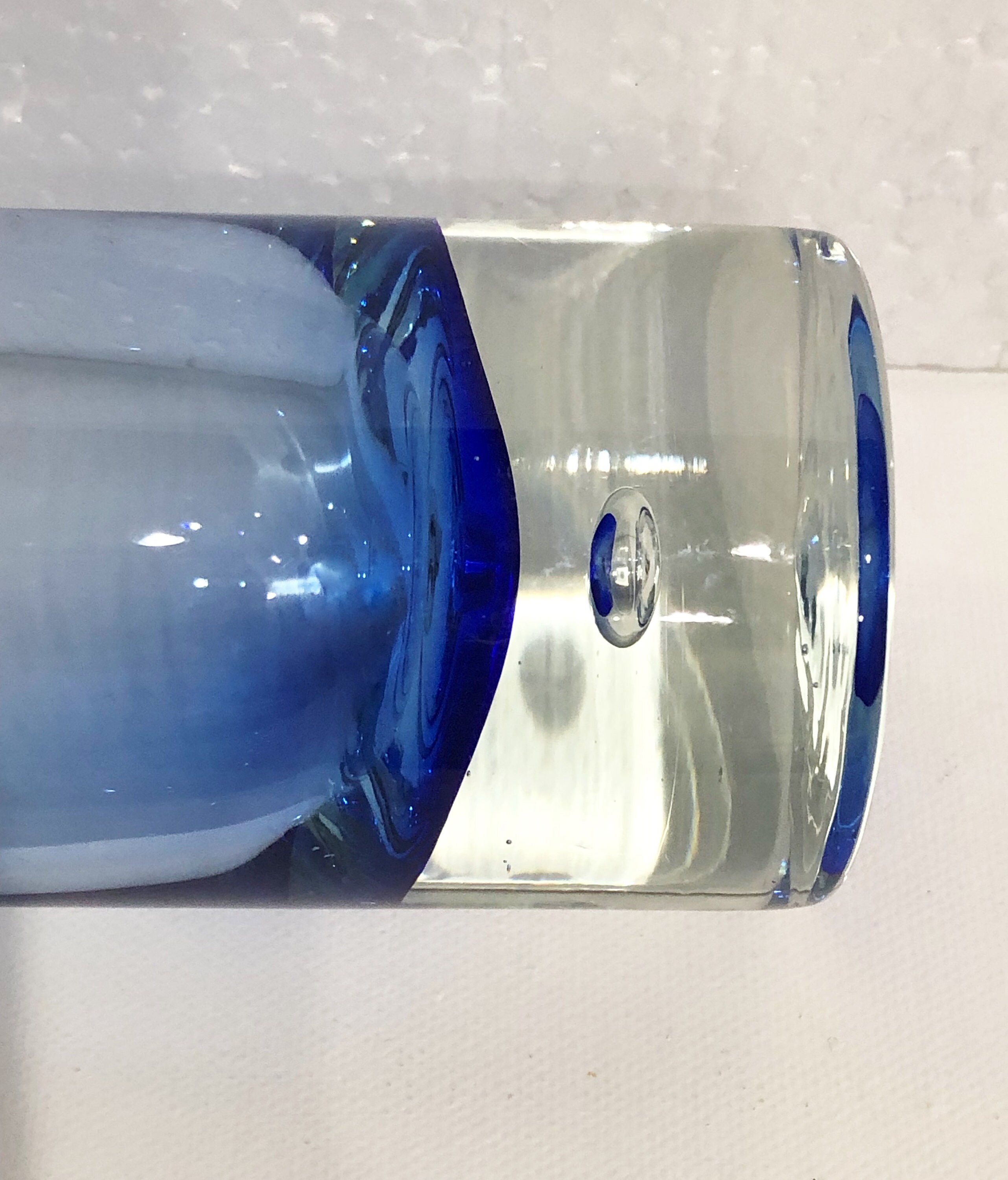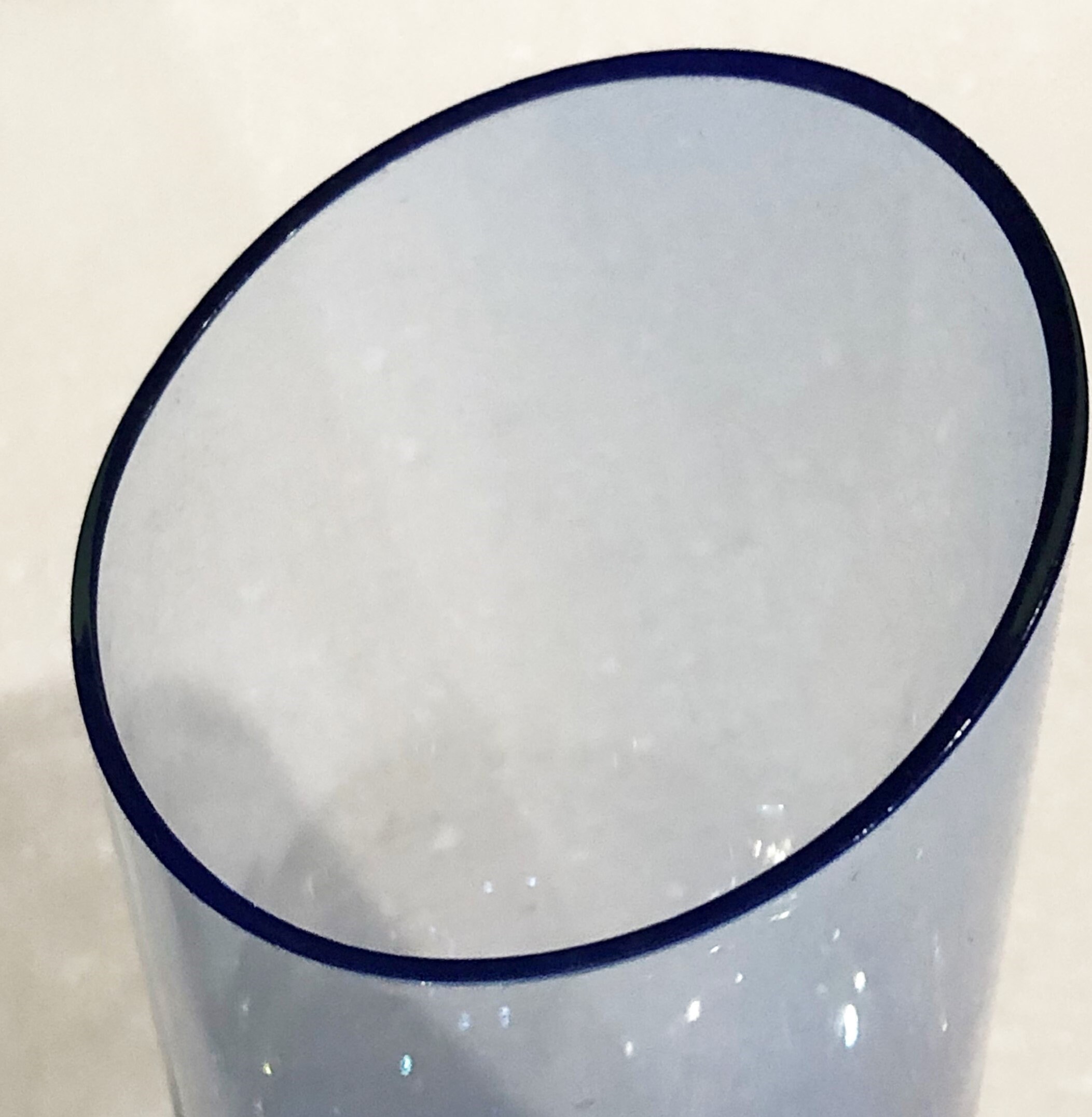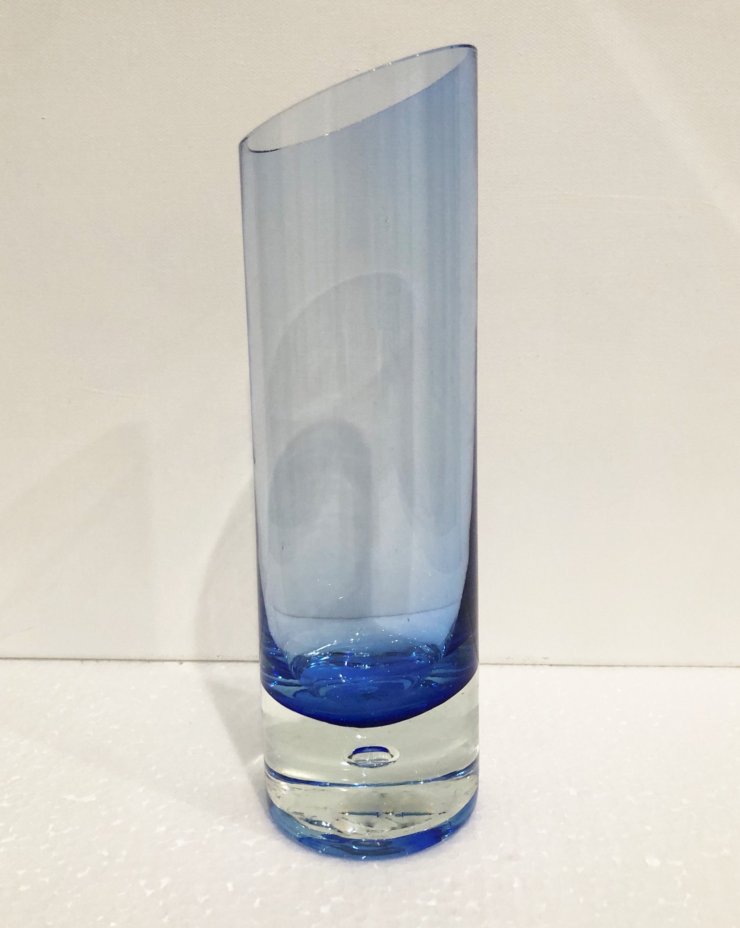 Beautifully executed Krosno Holmegaard Hand Blown Asymmetrically Cut Tumbler, High Ball Glass in a Smokey Cobalt Blue with a controlled bubble in the clear base.