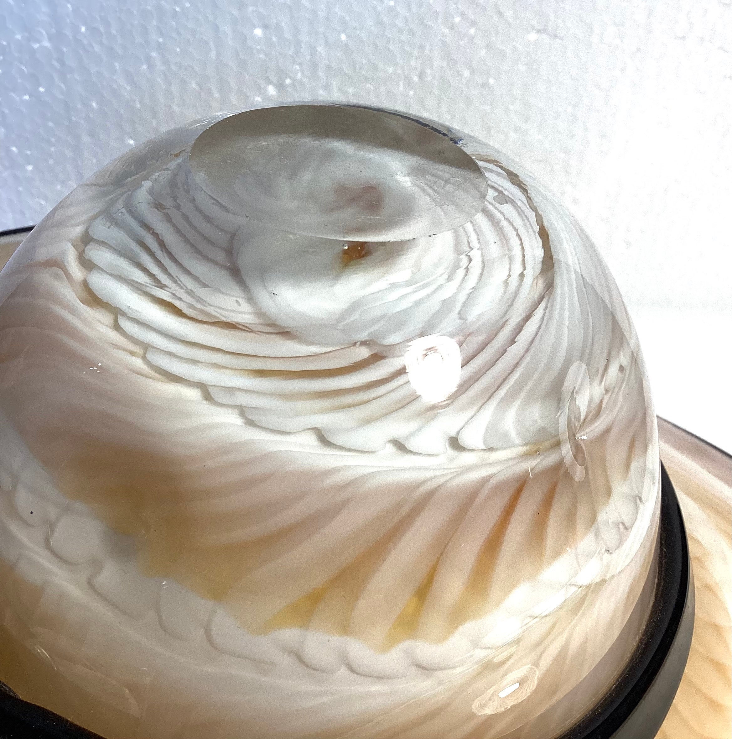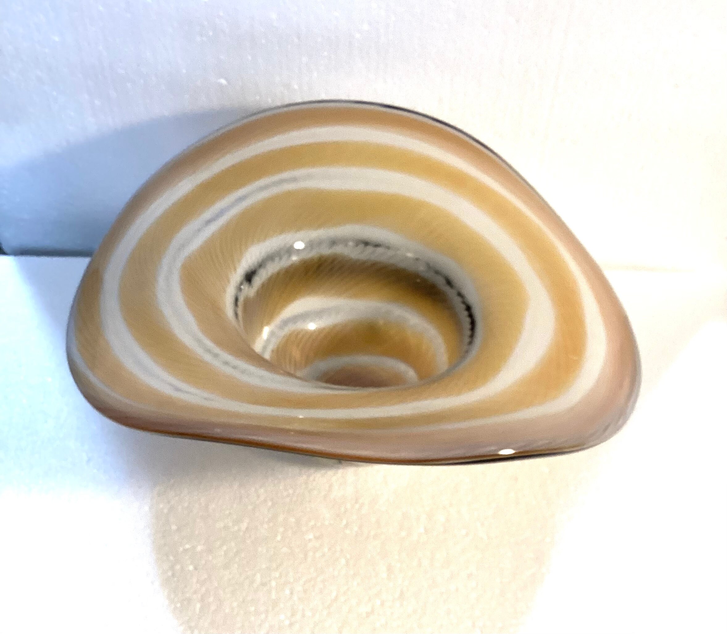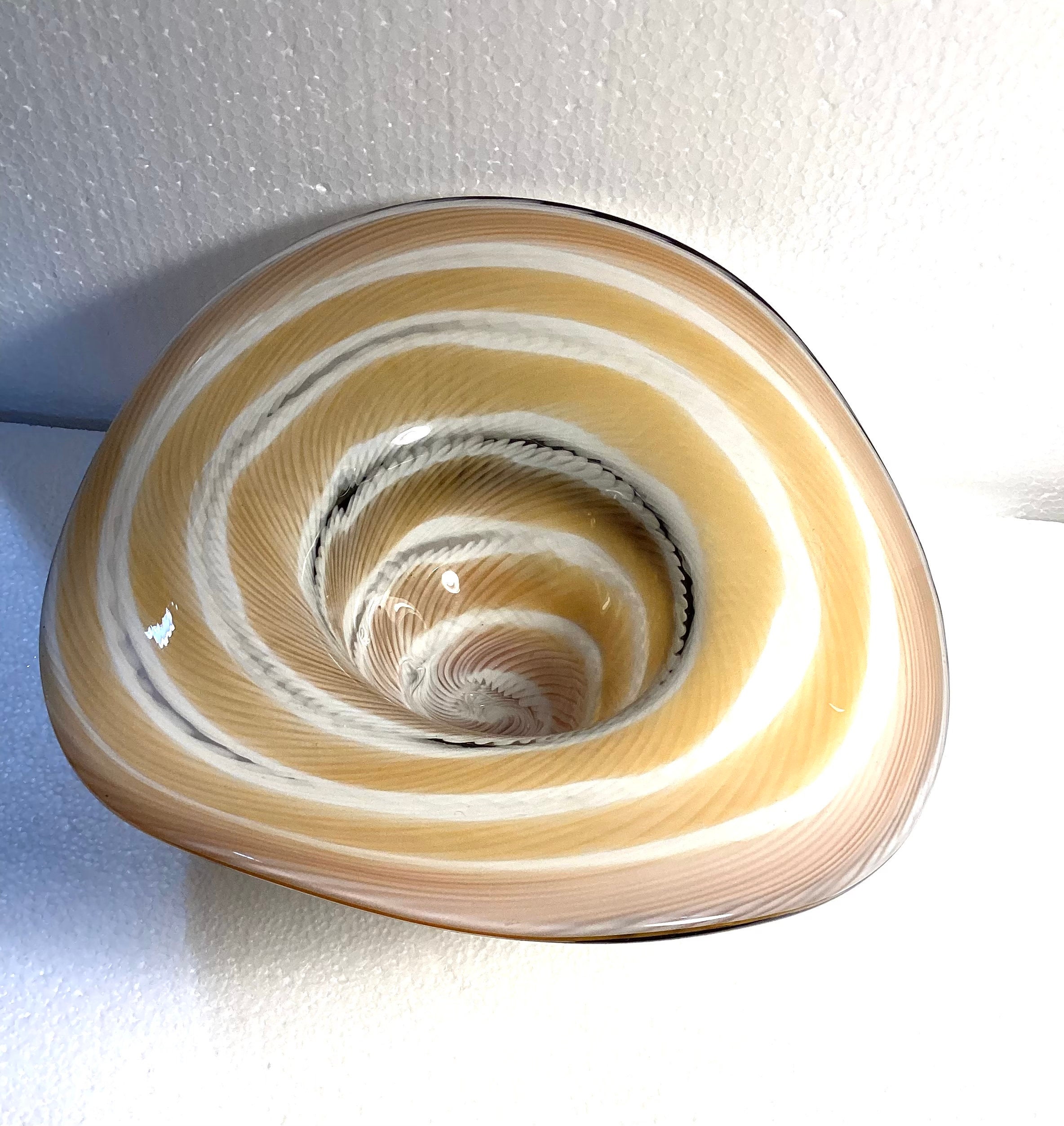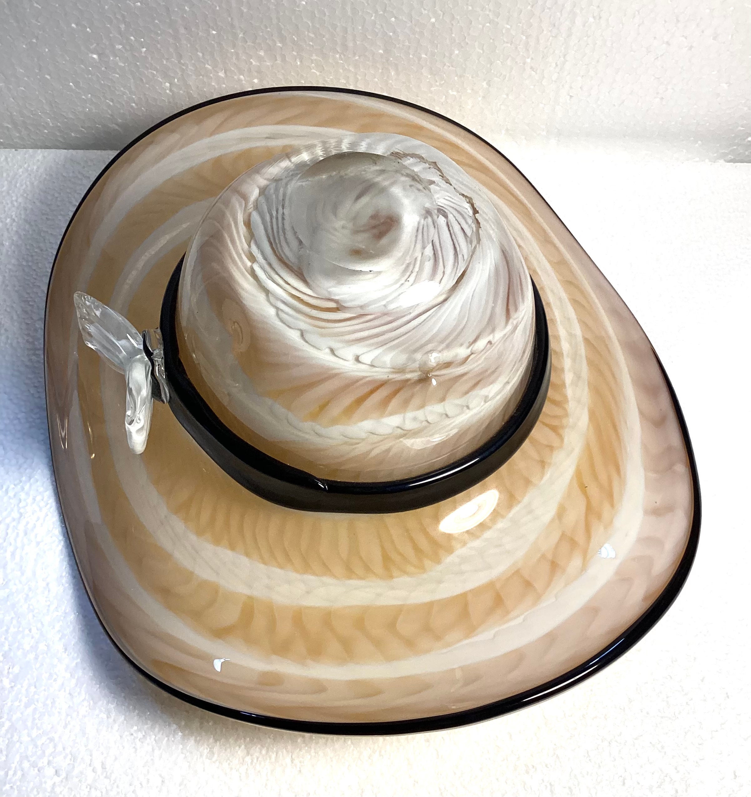 Beautifully executed hand blown swirled art glass hat , Vintage Murano, colors are beiges and whites cased in clear glass and embellished with an applied hand blown black ribbon and cased bow. Polished pontil and when inverted the hat serves as a candy dish or decorative bowl.
