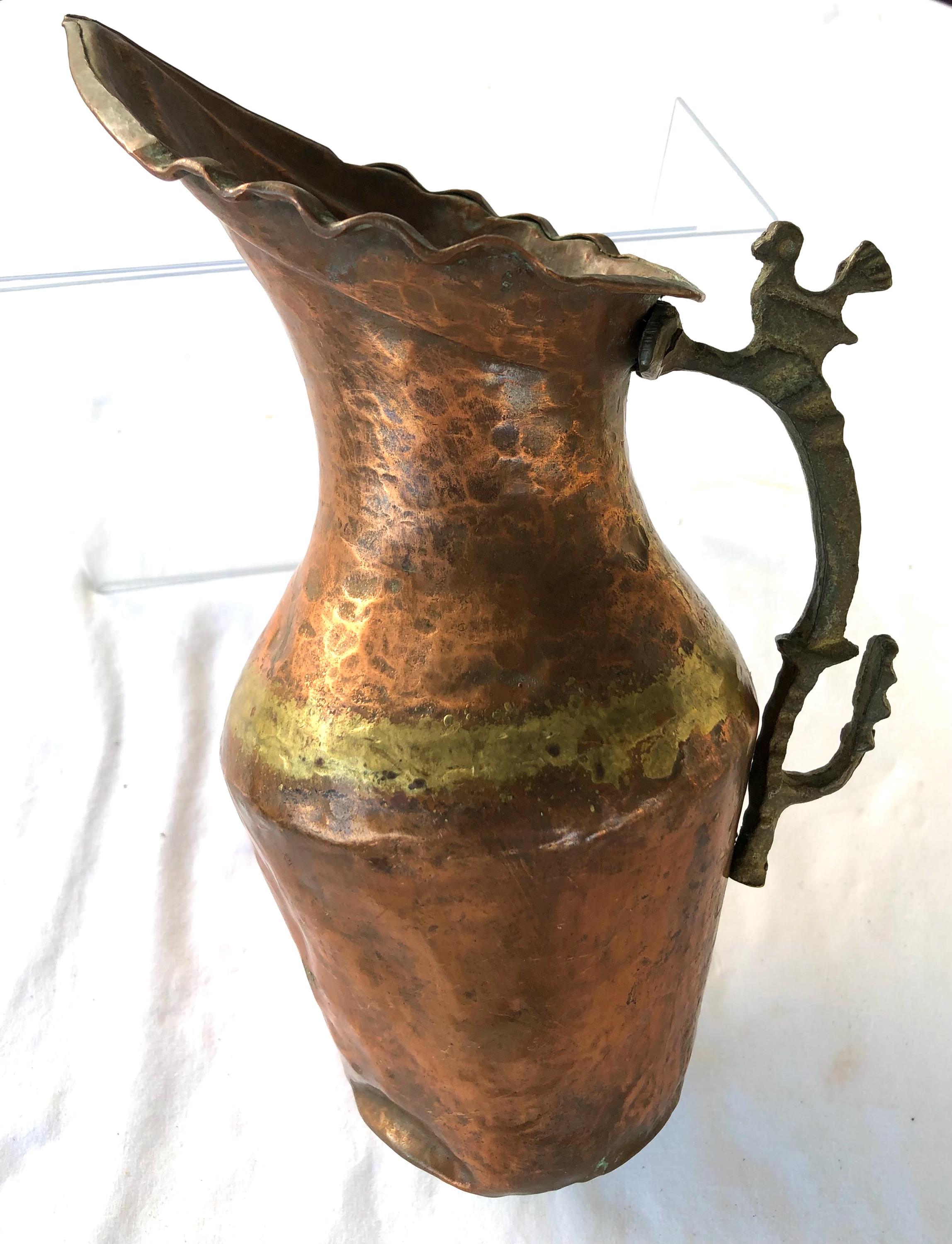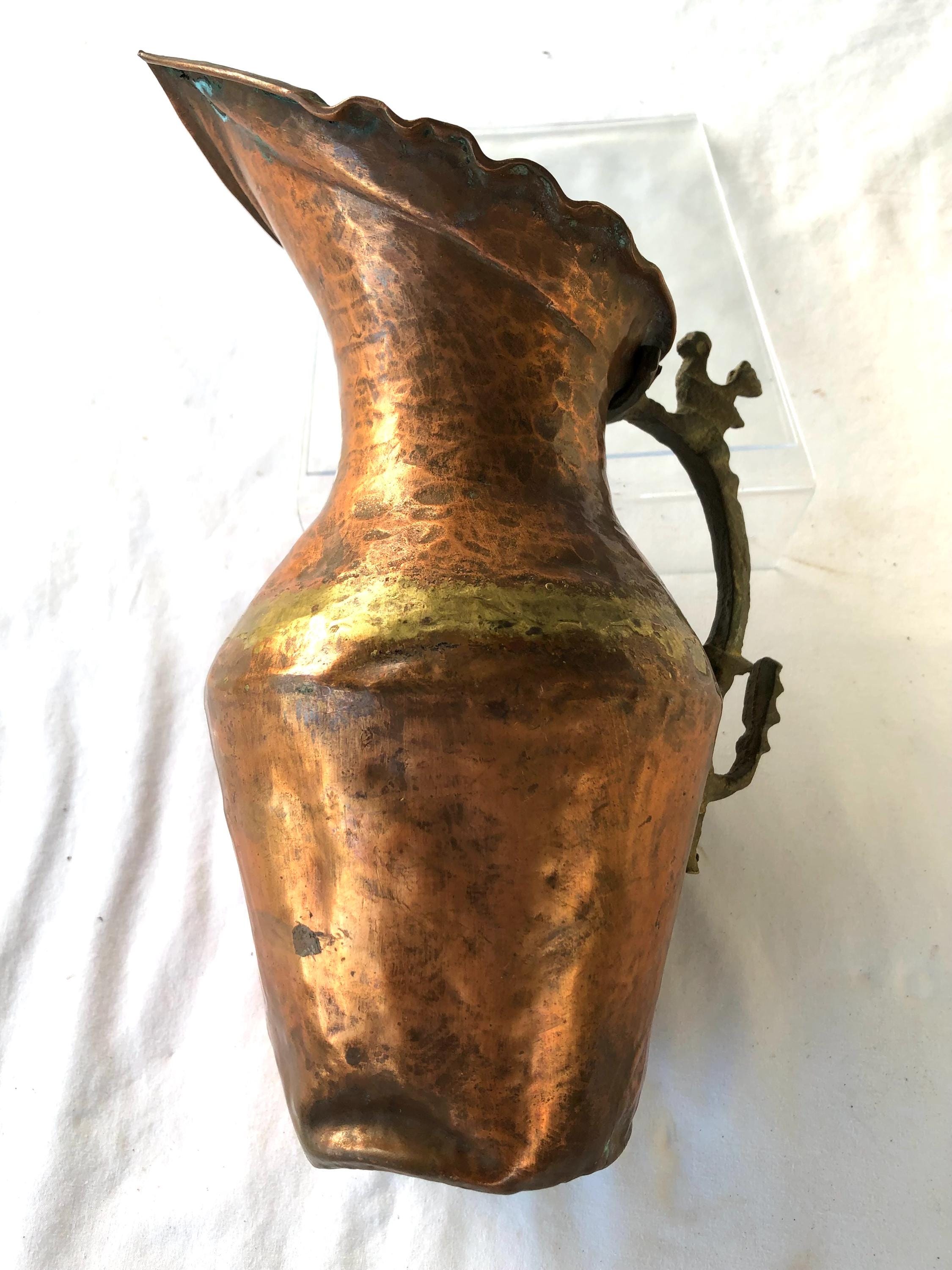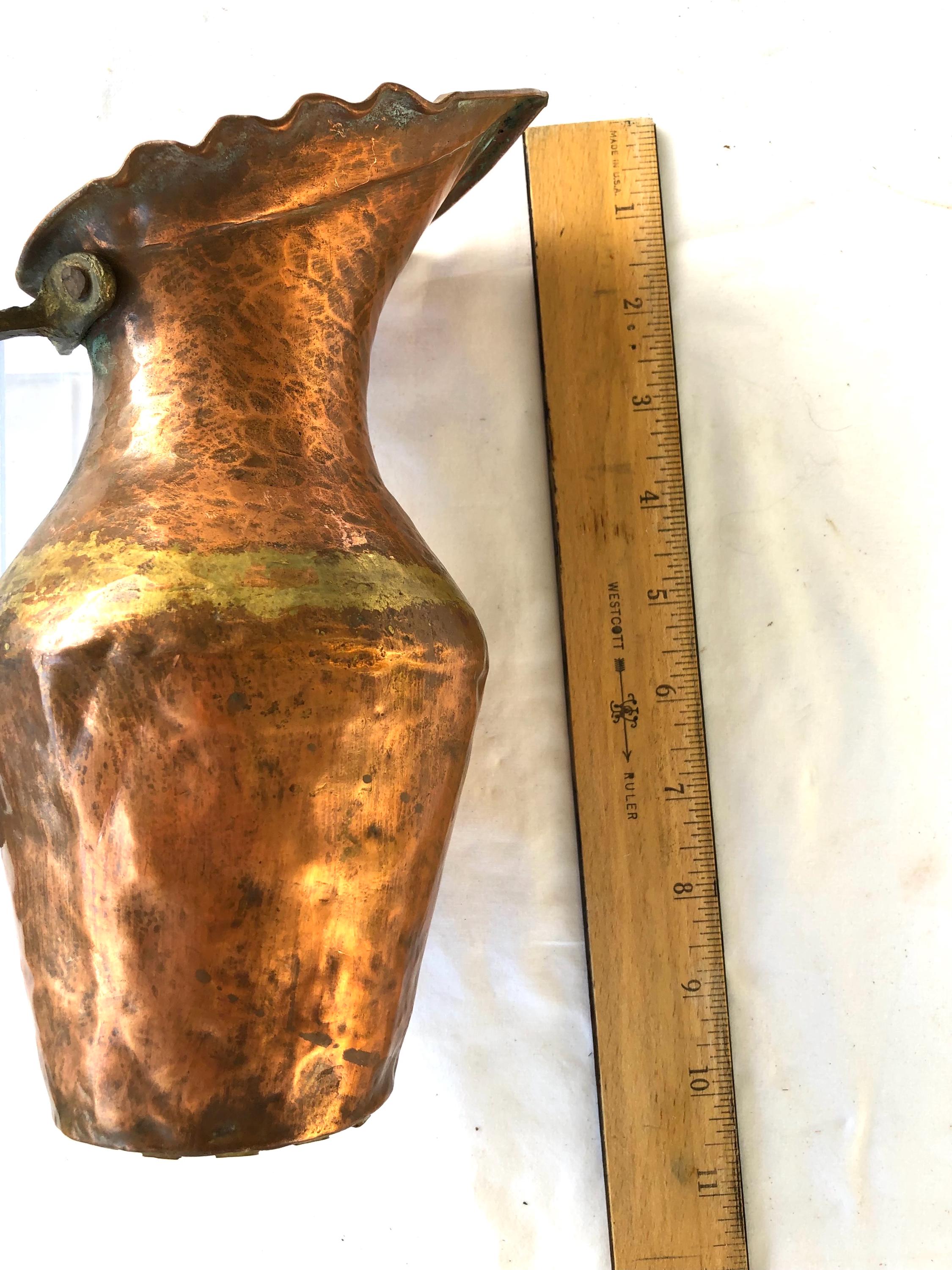 Brass and Copper Ewer 10” H Rustic ( purchased with dent and raw patina) see photos. great accent piece for floral design it stand alone pitcher.