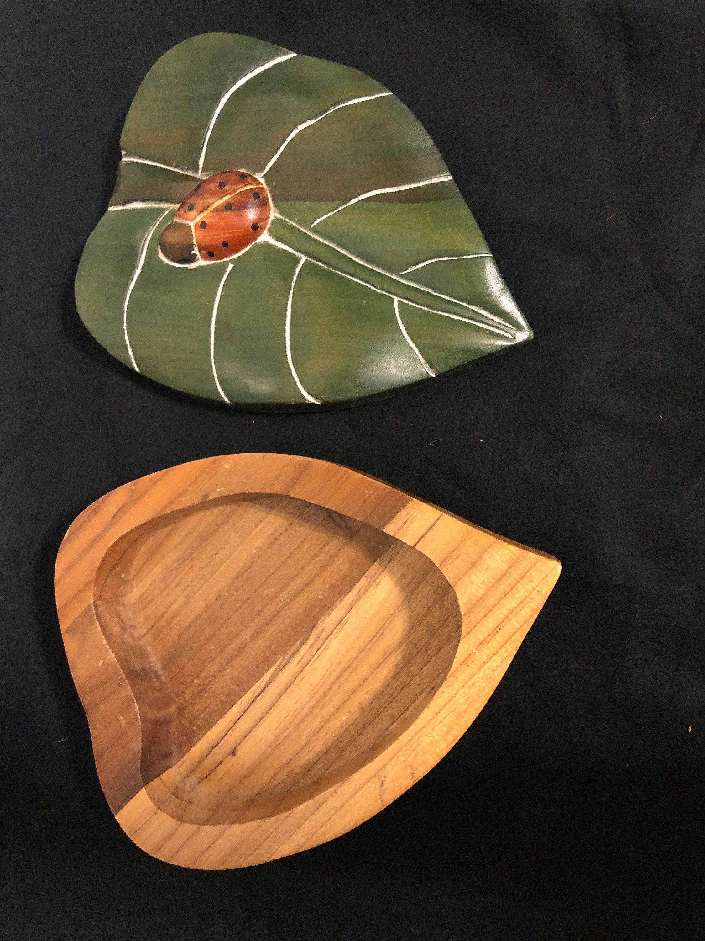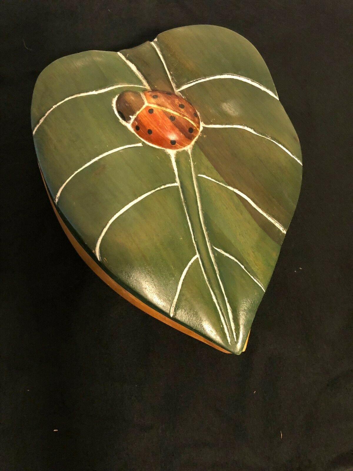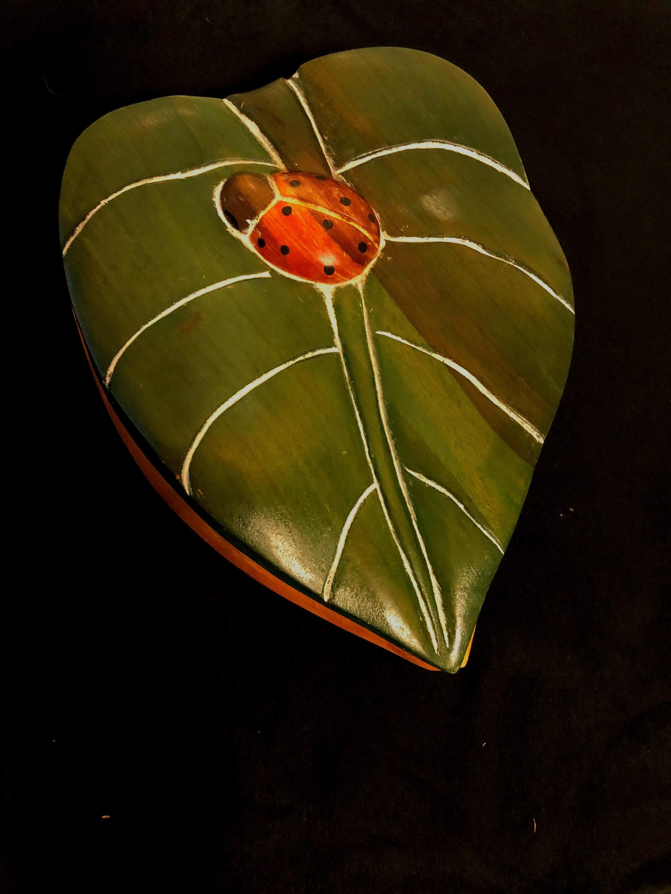 Handcrafted Treasure Box in the shape of a Leaf Embellished with Carved High Relief Lady Bug Pre-owned, minimum wear It is hand carved, hand painted and has a waxed finish on the lid. Rare find, would be a nice accent piece in a nursery, sunroom, to put those small things out of site or to store your treasures!