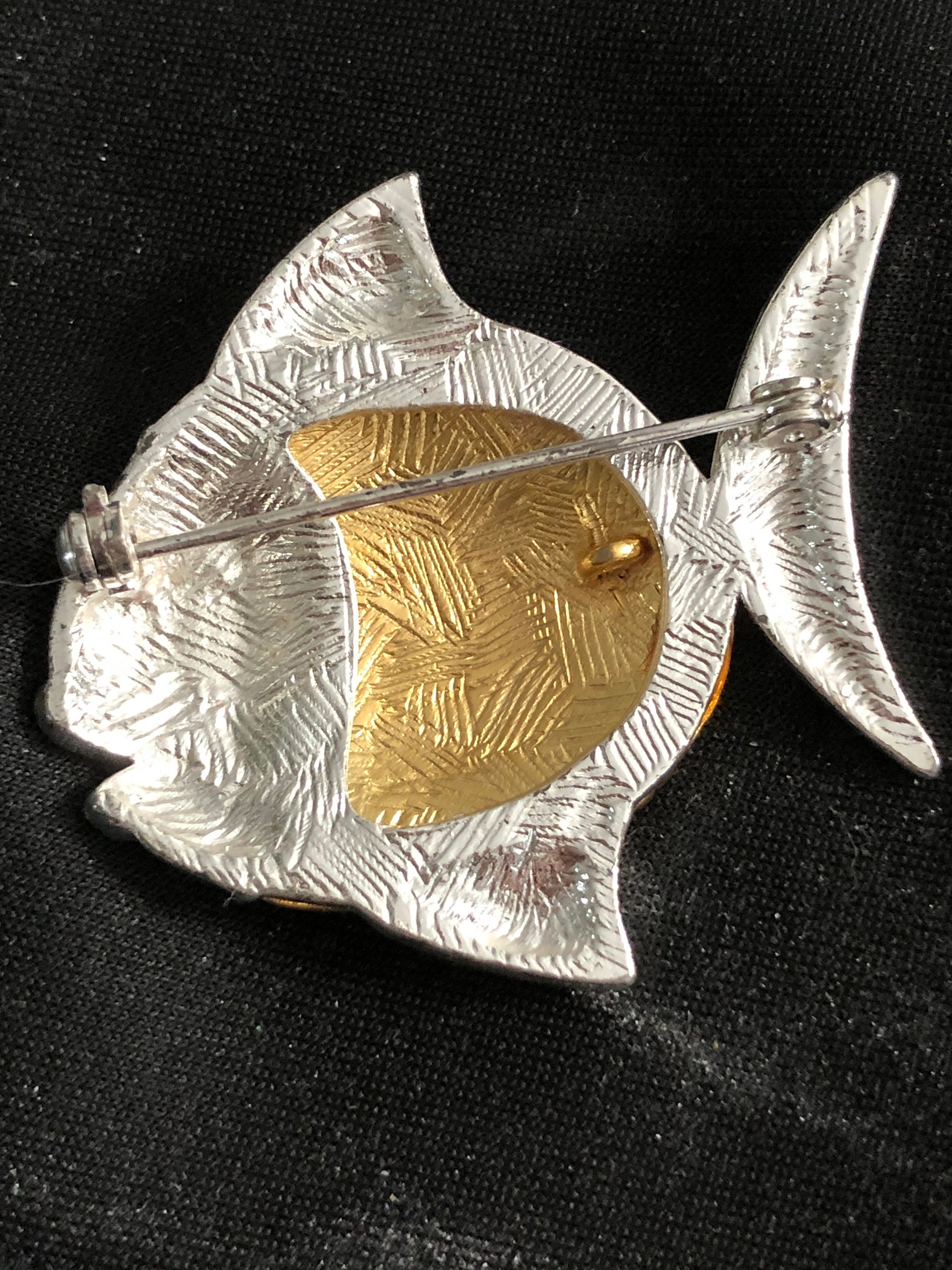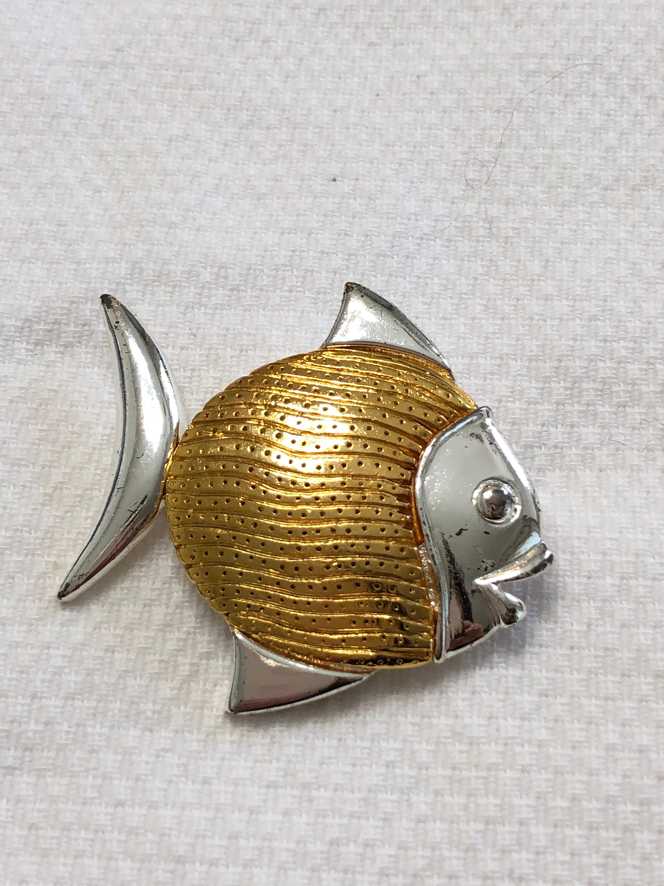 There's lots of fish in the sea but none cuter than this one! I’m unsigned beauty, this puffy little fish has lots of detail. Simple, elegant and classy - this pin brooch is a perfect addition to your wardrobe, be it scarf, jacket, sun visor, cap or put it on a chain! The textured surfaces and puffy little body are sure to catch your eye - a beautifully executed piece of jewelry! Excellent condition and an unusual statement piece to accent your attire. Measures 2" L x 1.75” W