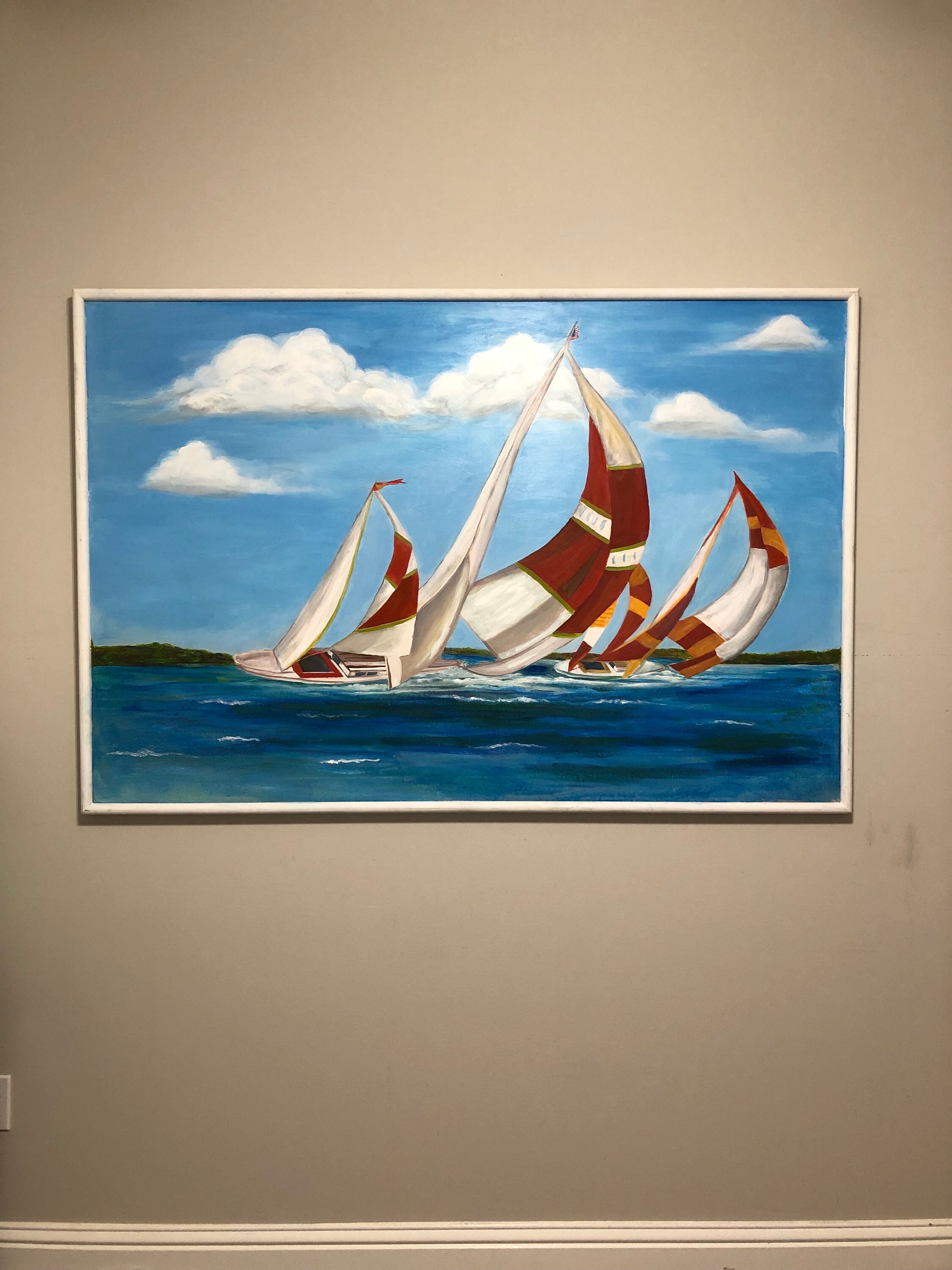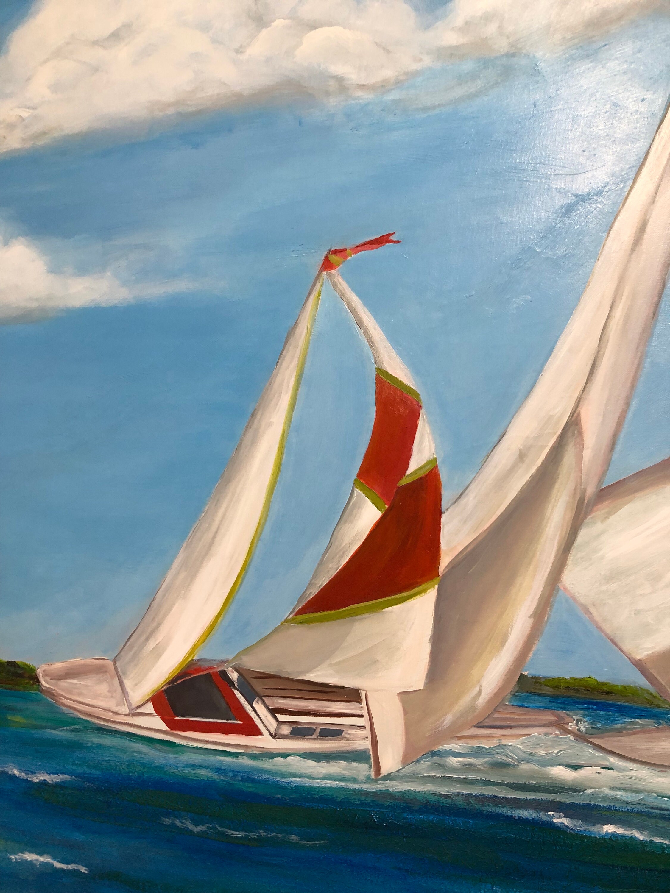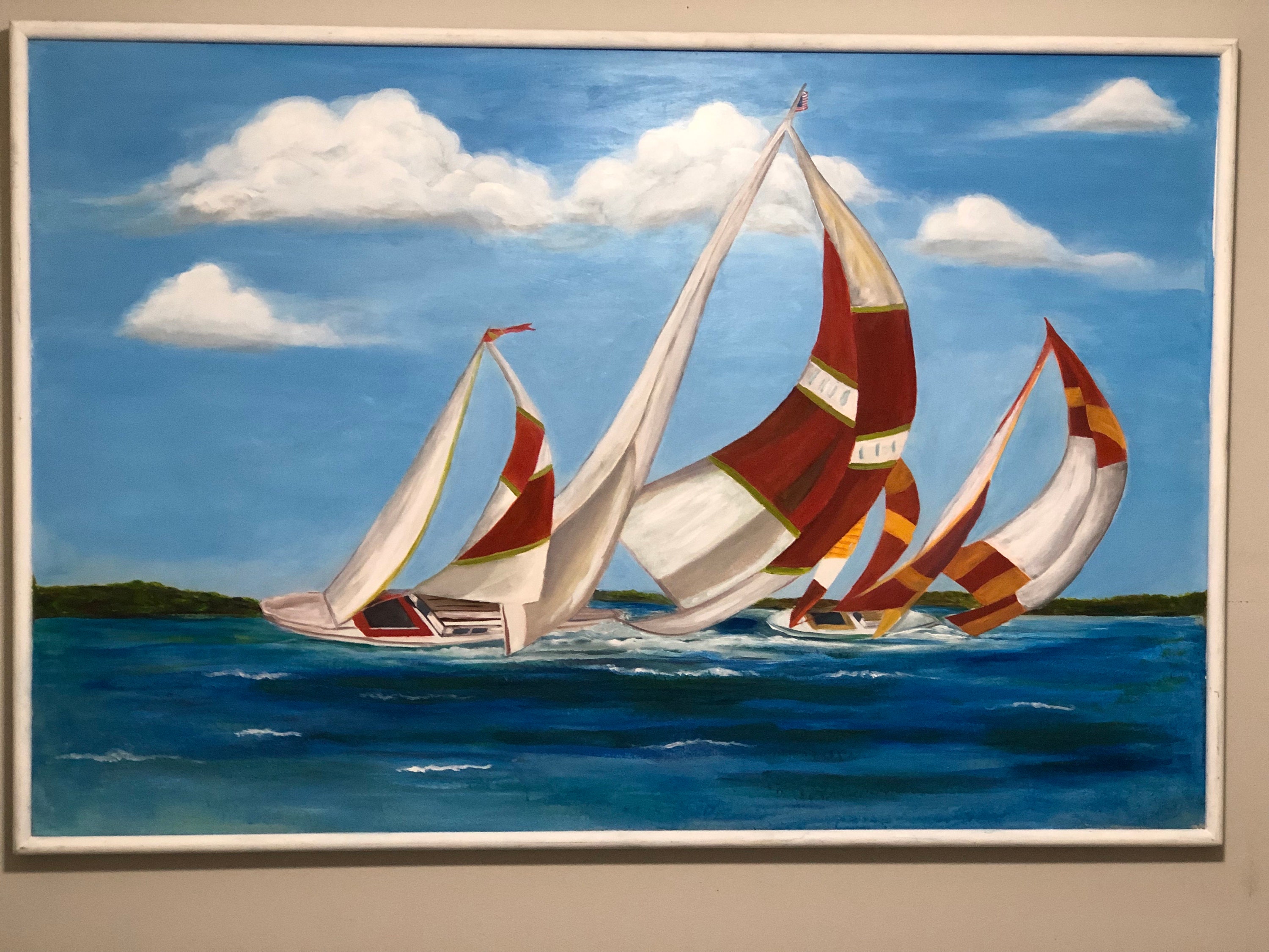 Introducing "Sail Away," a captivating piece that embodies the freedom and exhilaration of adventure on the open sea. Measuring 40” x 60”, this striking painting utilizes acrylic to bring to life a scene full of energy and movement. In the foreground, three sailboats race across a deep blue body of water, their bold, dynamic sails unfurling in the wind. The sails, adorned in vivid shades of red, white, and orange, dominate the composition and convey a powerful sense of motion.