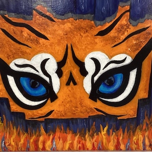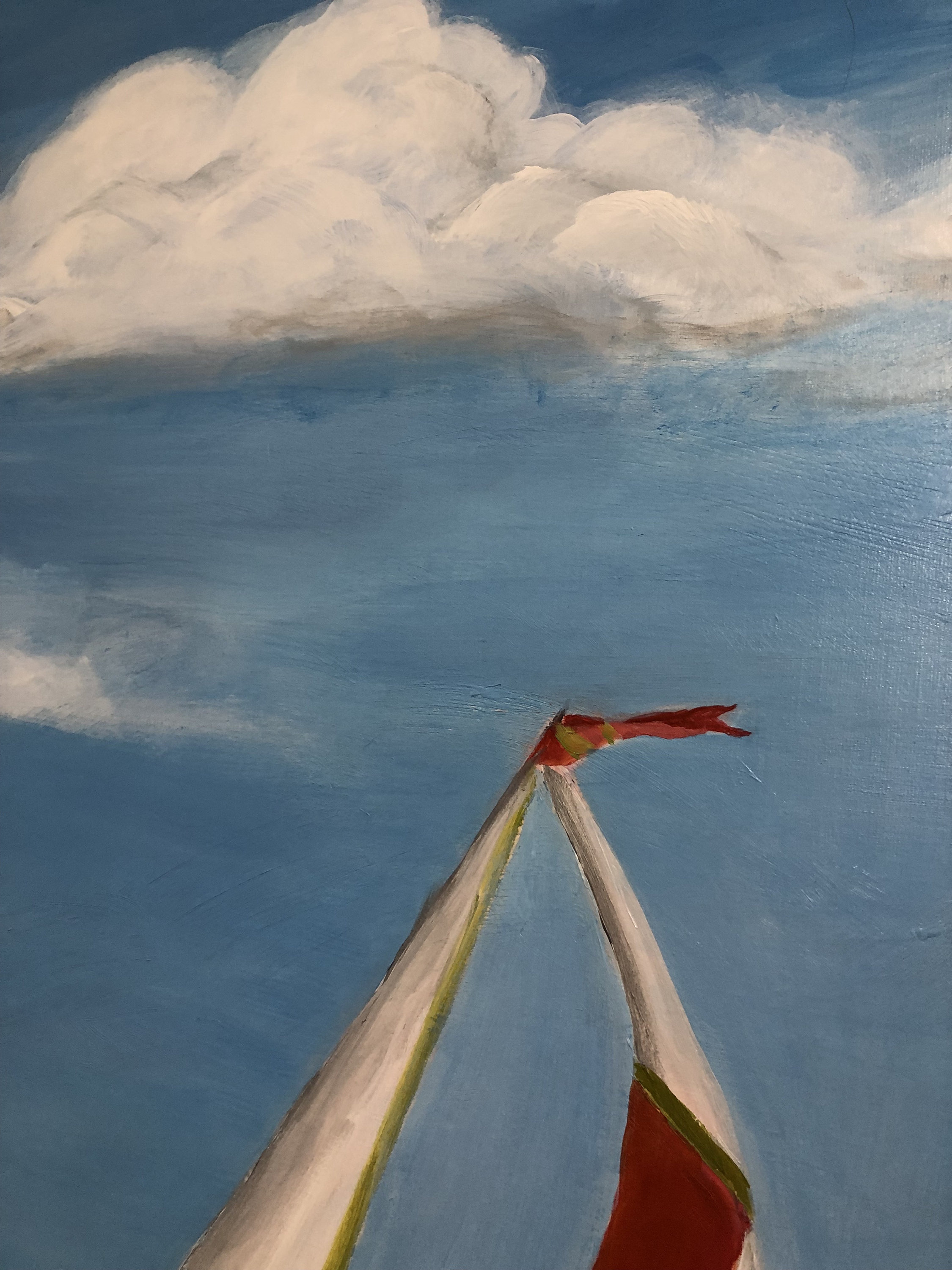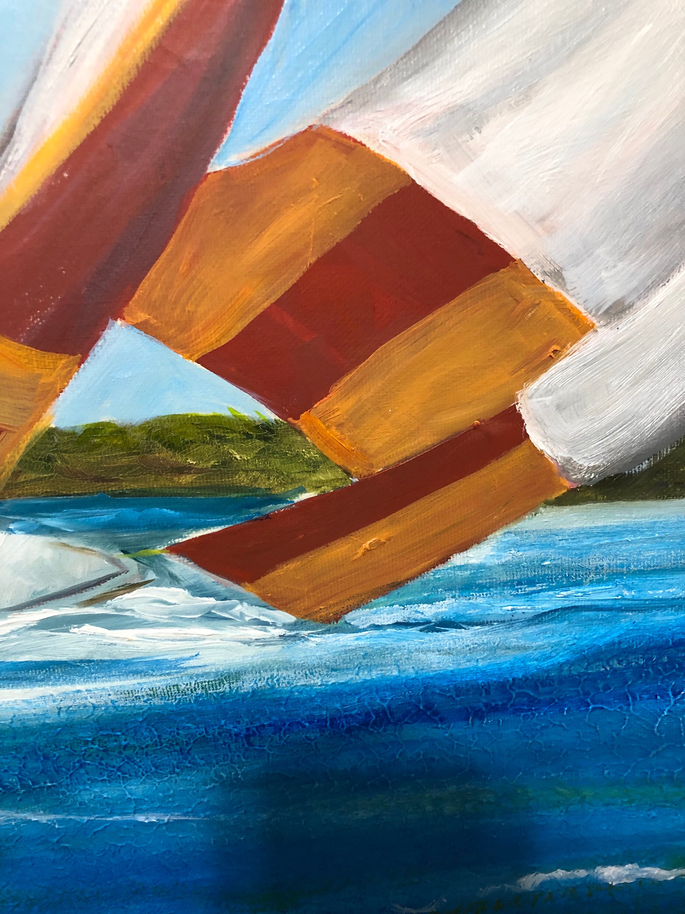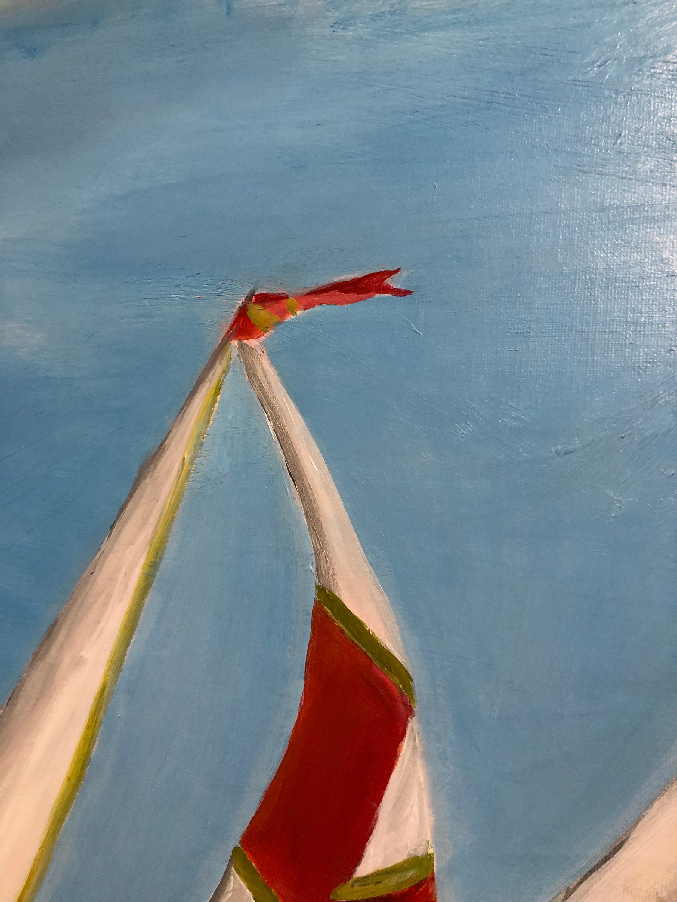 Introducing "Sail Away," a captivating piece that embodies the freedom and exhilaration of adventure on the open sea. Measuring 40” x 60”, this striking painting utilizes acrylic to bring to life a scene full of energy and movement. In the foreground, three sailboats race across a deep blue body of water, their bold, dynamic sails unfurling in the wind. The sails, adorned in vivid shades of red, white, and orange, dominate the composition and convey a powerful sense of motion.