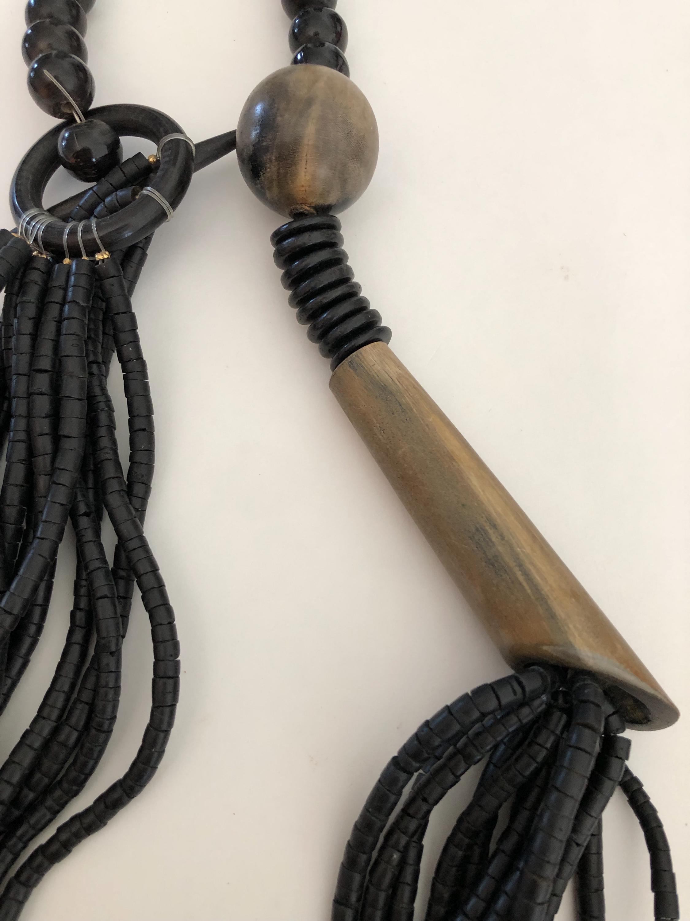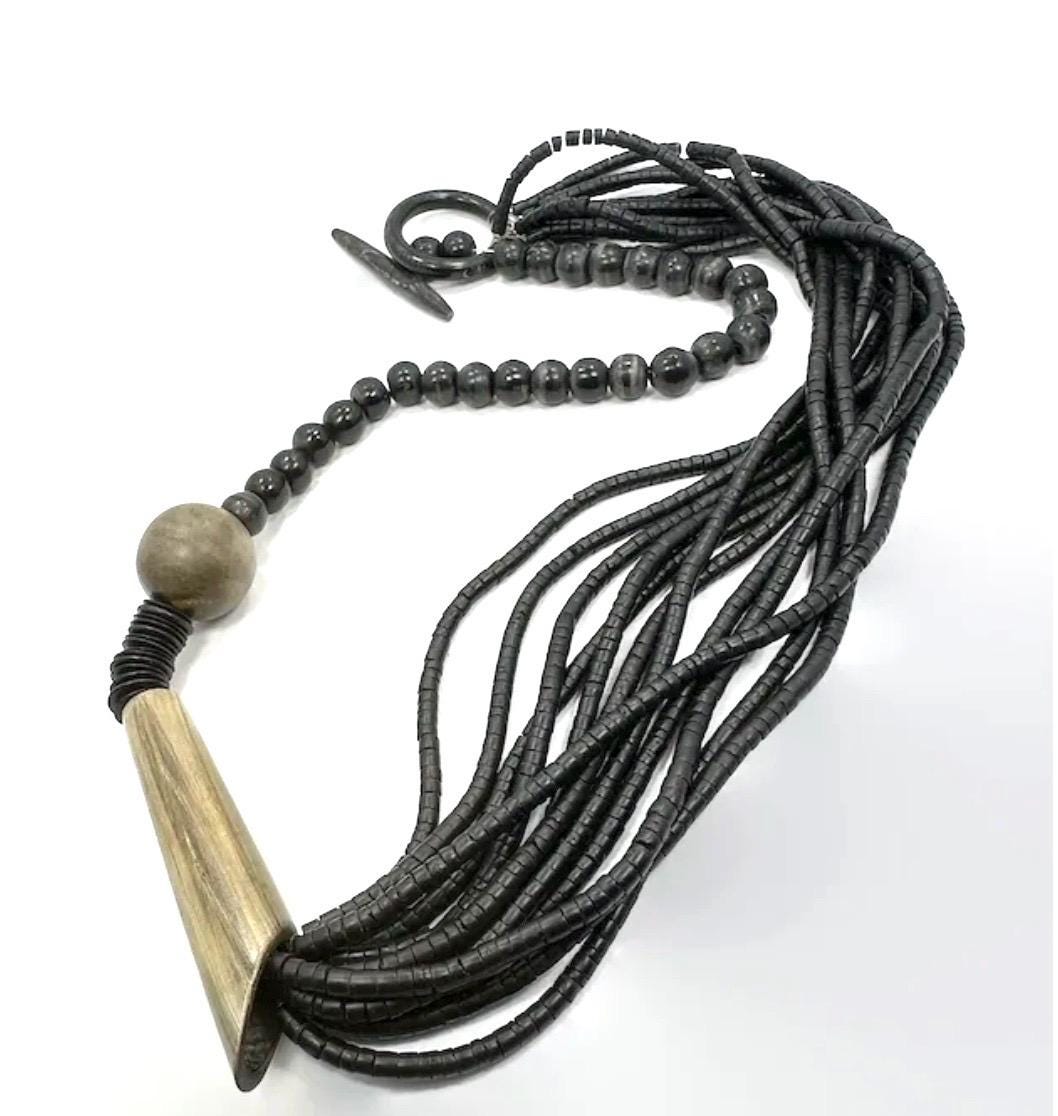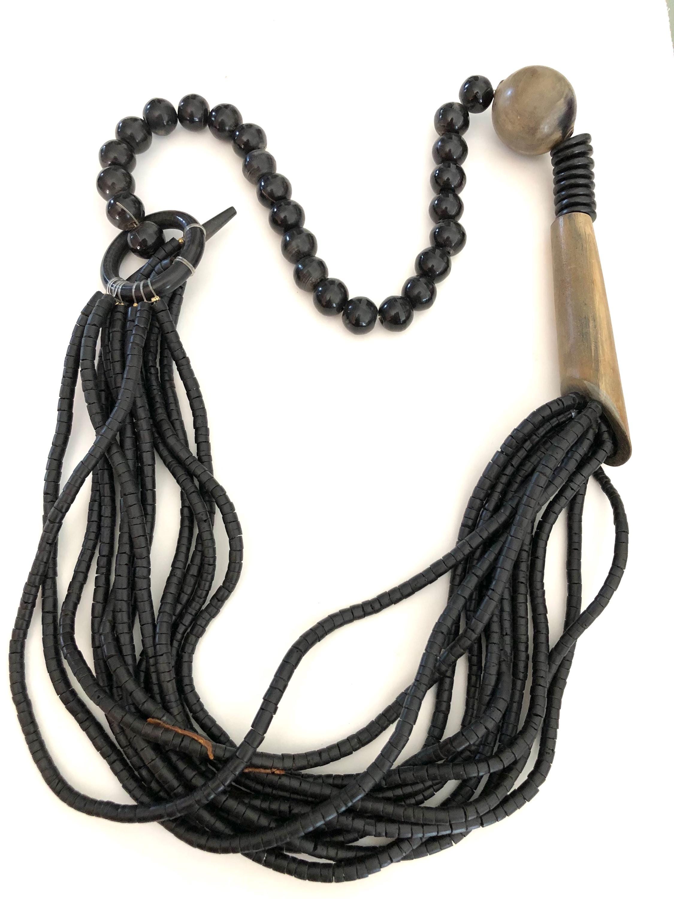 Vintage BoHo Style Necklace c1980' -90's Beautiful, stunning and elegant...a simple design that says "stylishly timeless", black beads complimented by a huge ball and long horn shaped tube with a massive toggle closure Approximately 32" long, Weight 60. Worn with a casual top with trousers, dressed up or down, this one will not disappoint - it is truly a timeless piece! Details Length Approximately 32" Condition: Pre-owned and carefully preserved.