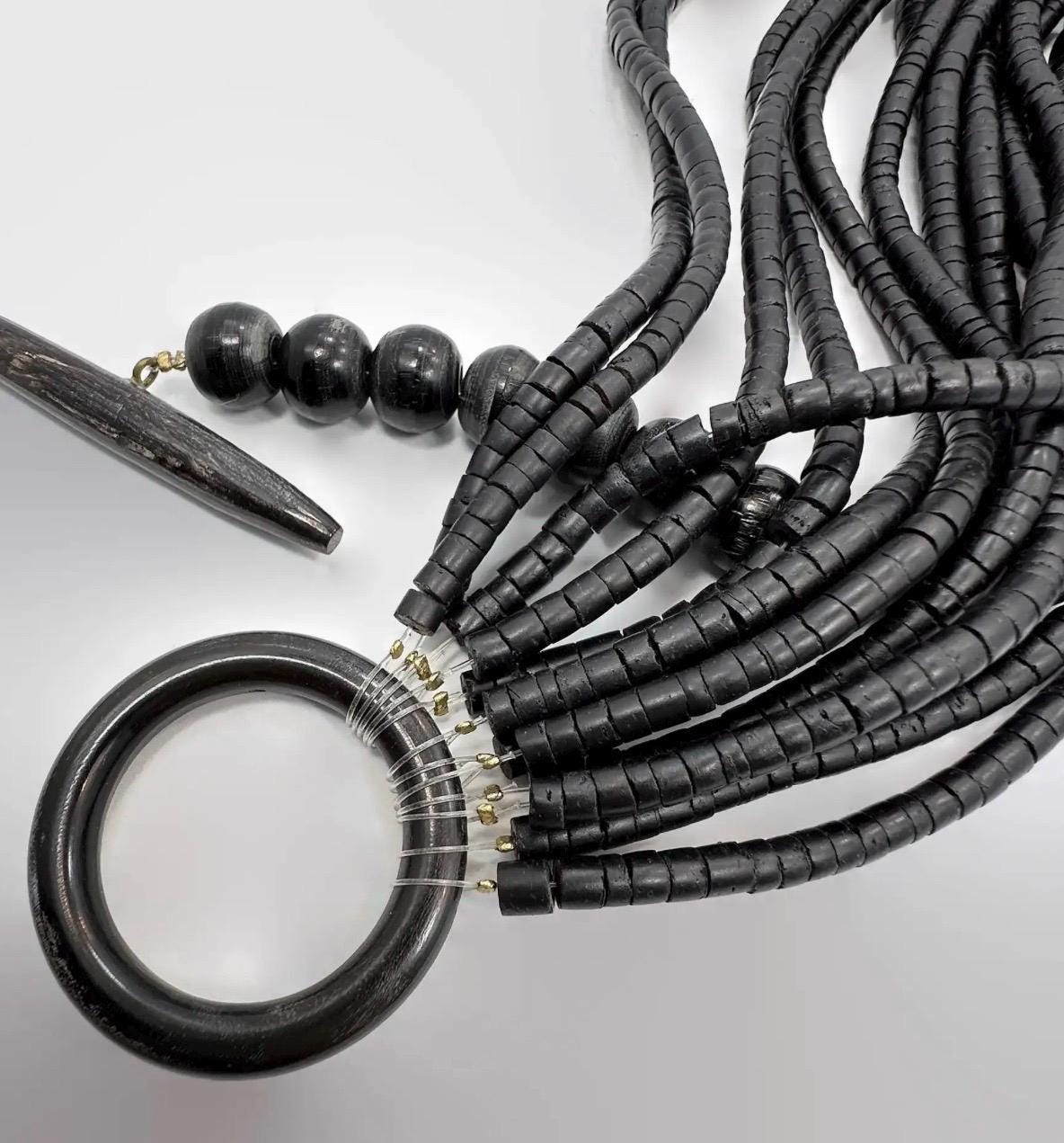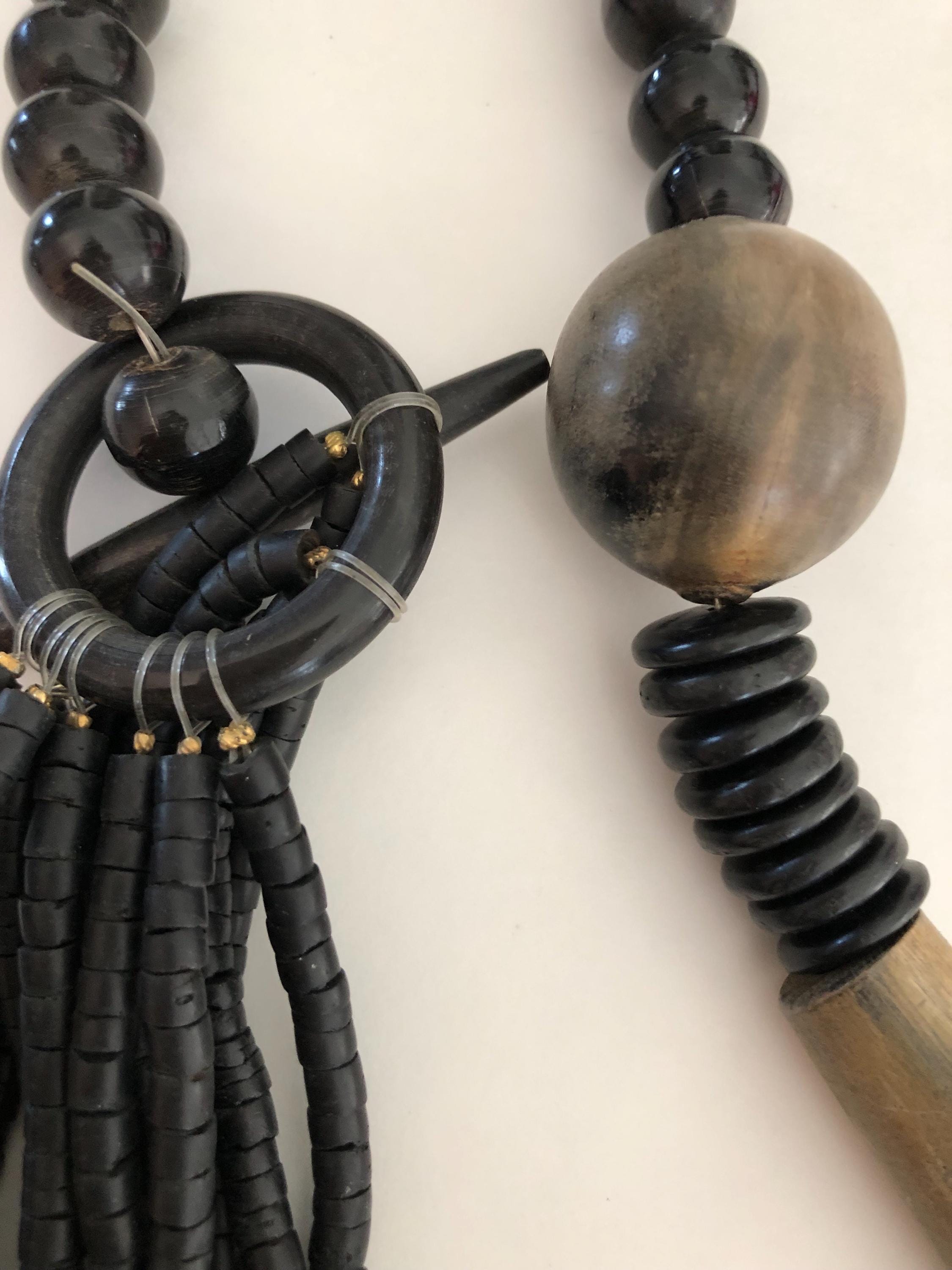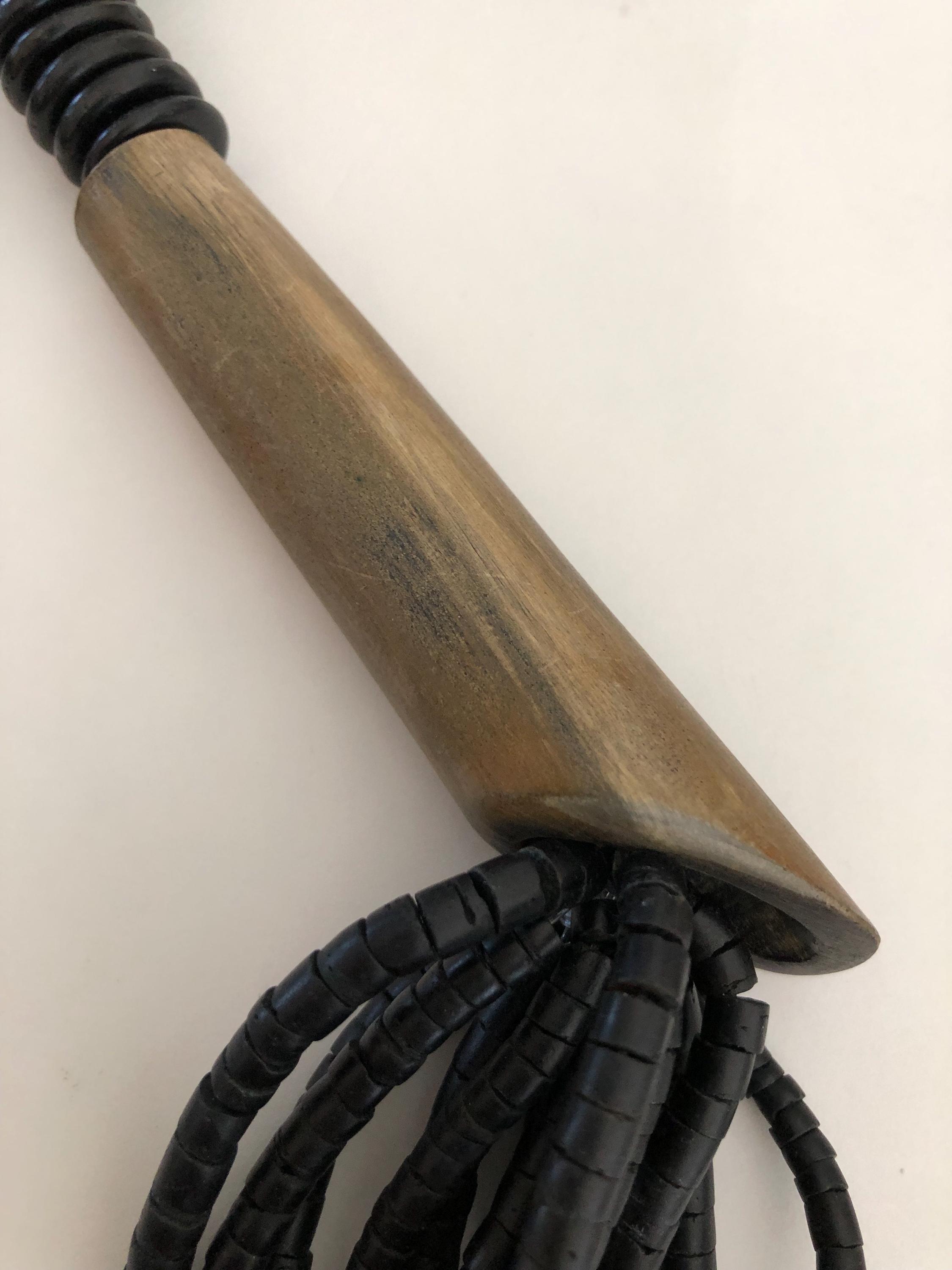 Vintage BoHo Style Necklace c1980' -90's Beautiful, stunning and elegant...a simple design that says "stylishly timeless", black beads complimented by a huge ball and long horn shaped tube with a massive toggle closure Approximately 32" long, Weight 60. Worn with a casual top with trousers, dressed up or down, this one will not disappoint - it is truly a timeless piece! Details Length Approximately 32" Condition: Pre-owned and carefully preserved.