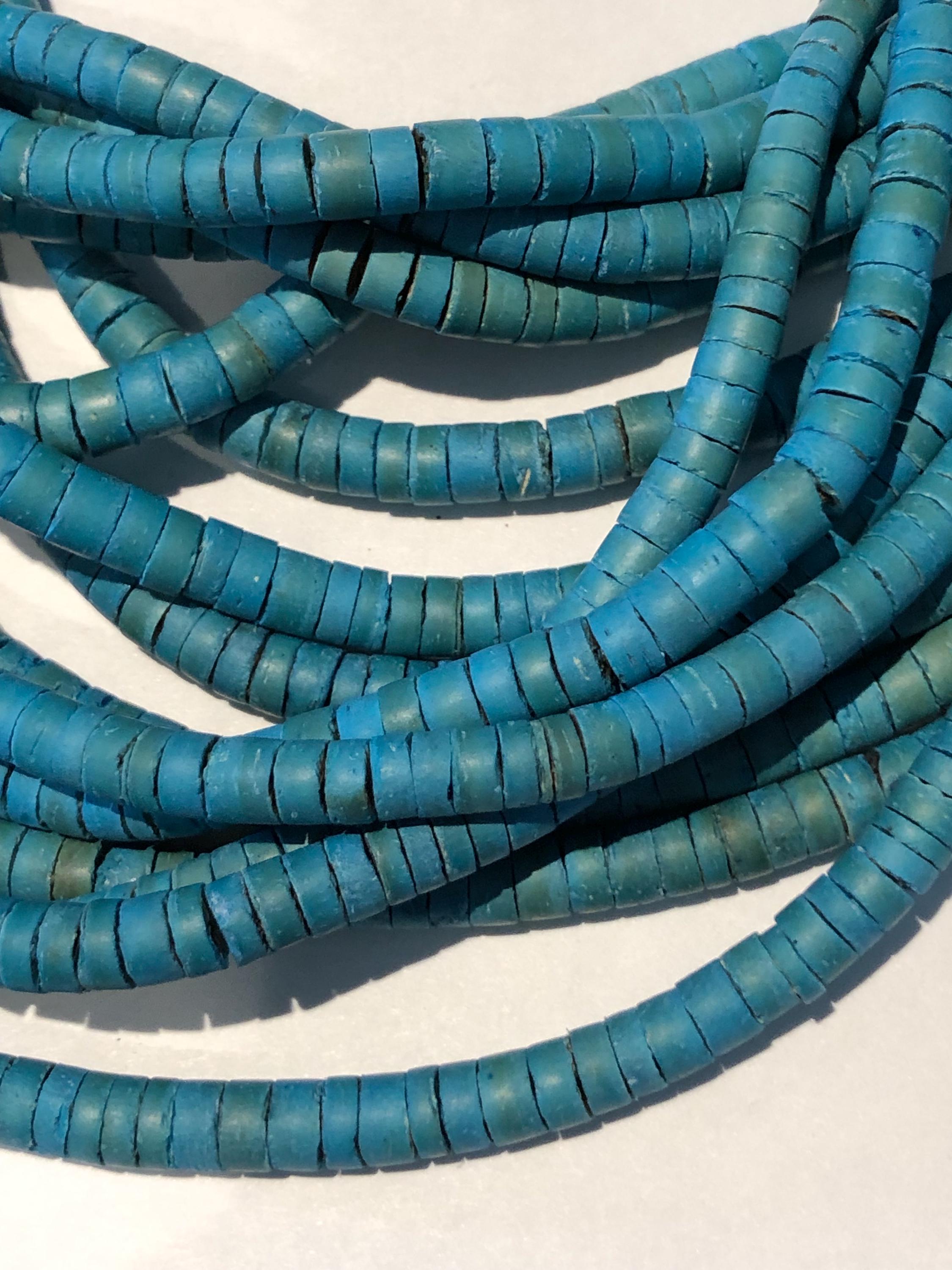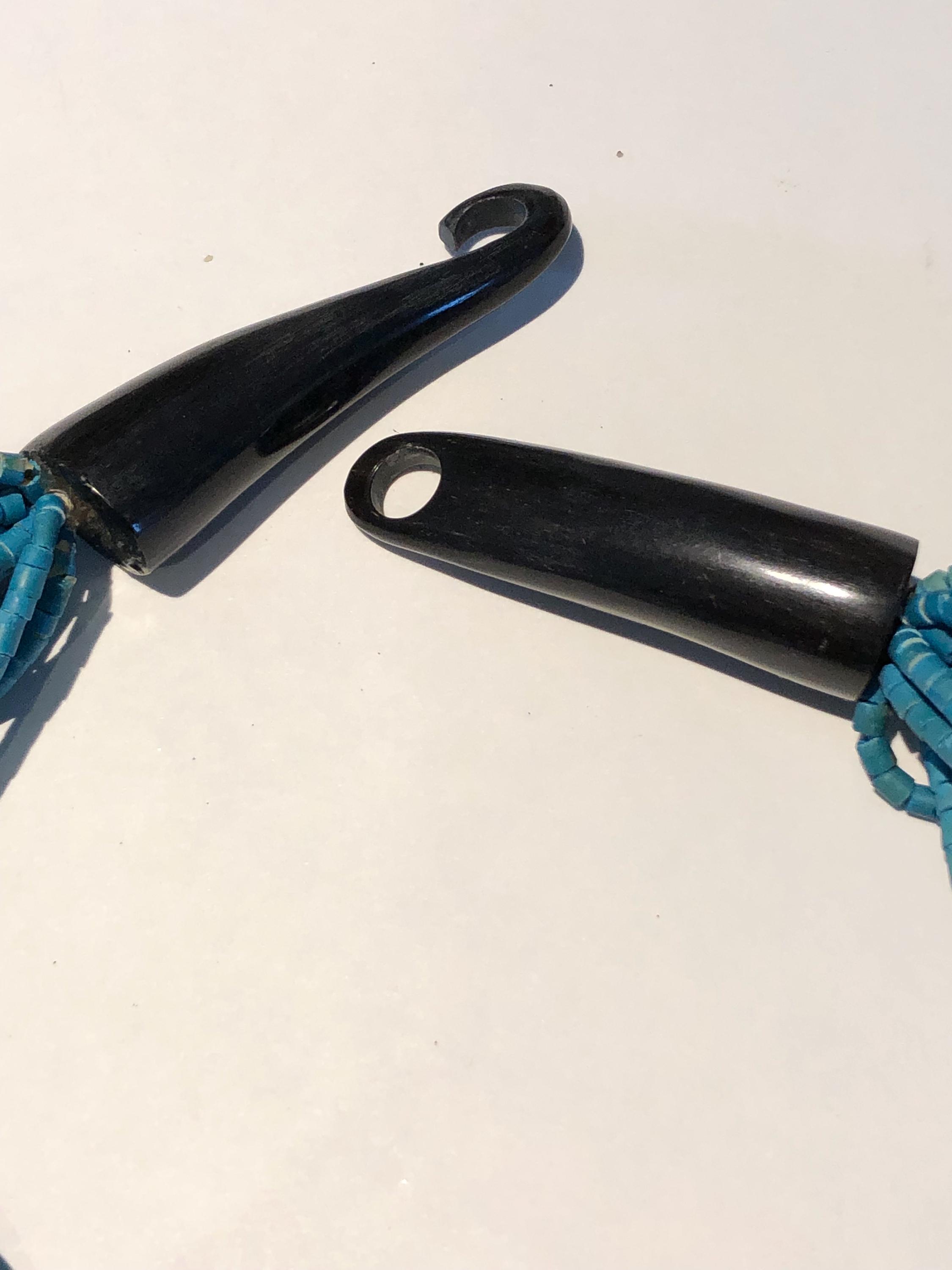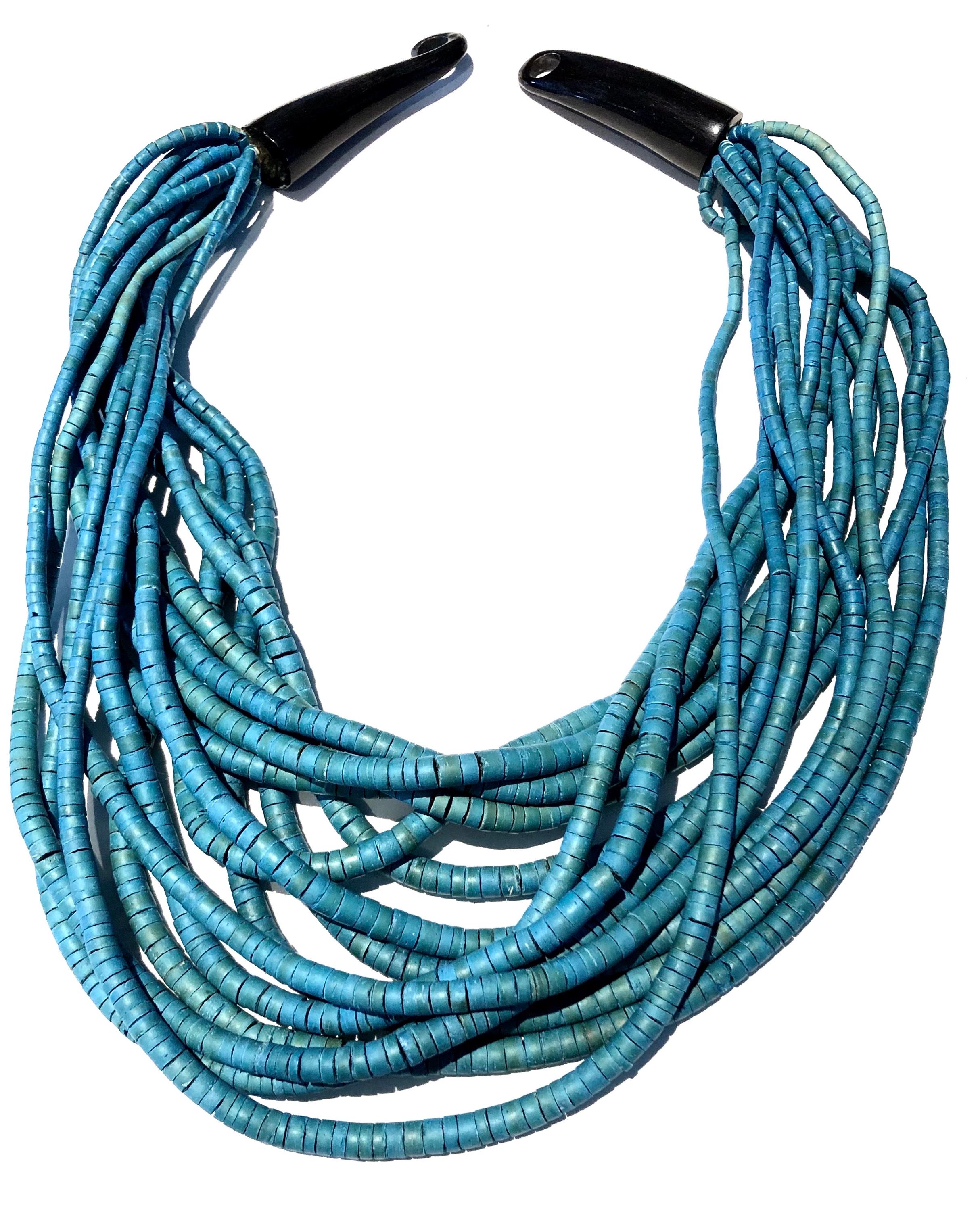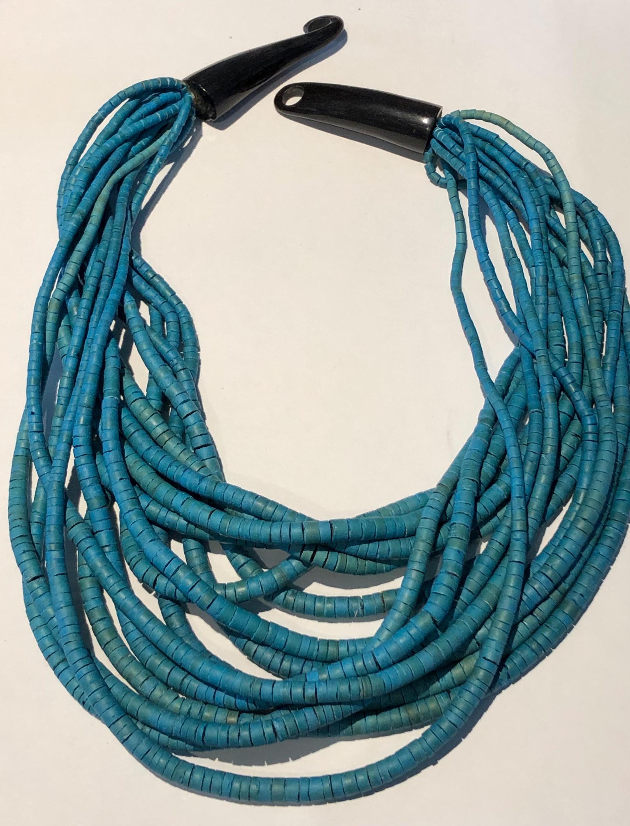 Vintage BoHo Style Necklace c1980' -90's Beautiful, stunning and elegant...a simple design that says "stylishly timeless", Turquoise stained wooden beads complimented by long horn shaped black hook for closure. 15 Strands and of beads and measuring an approximately 22" drop, Worn with a casual top with trousers, dressed up or down, this one will not disappoint if you like that Bohemian look! Condition: Pre-owned and carefully preserved.