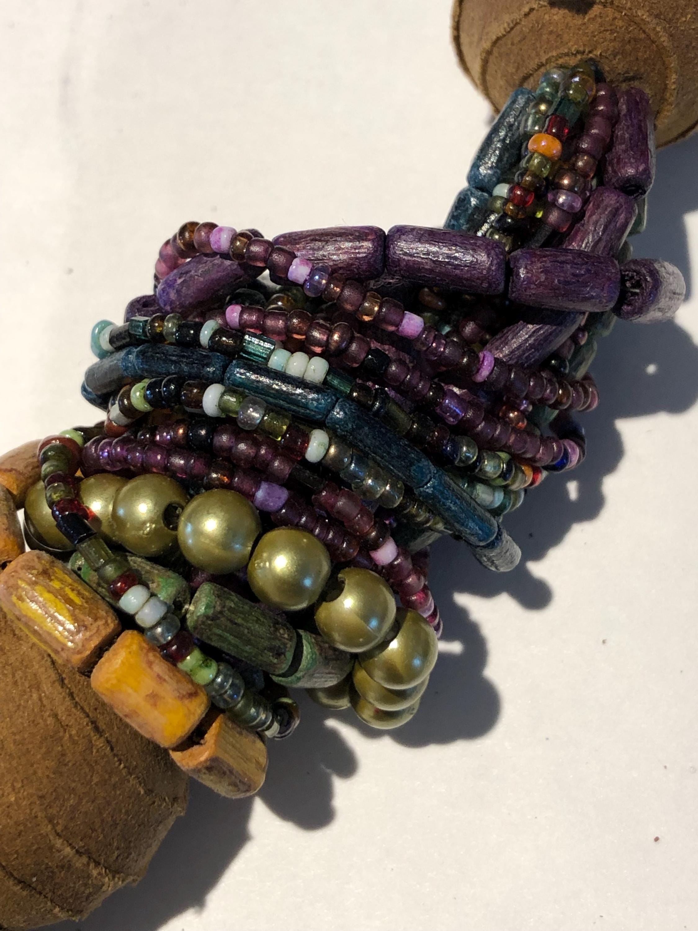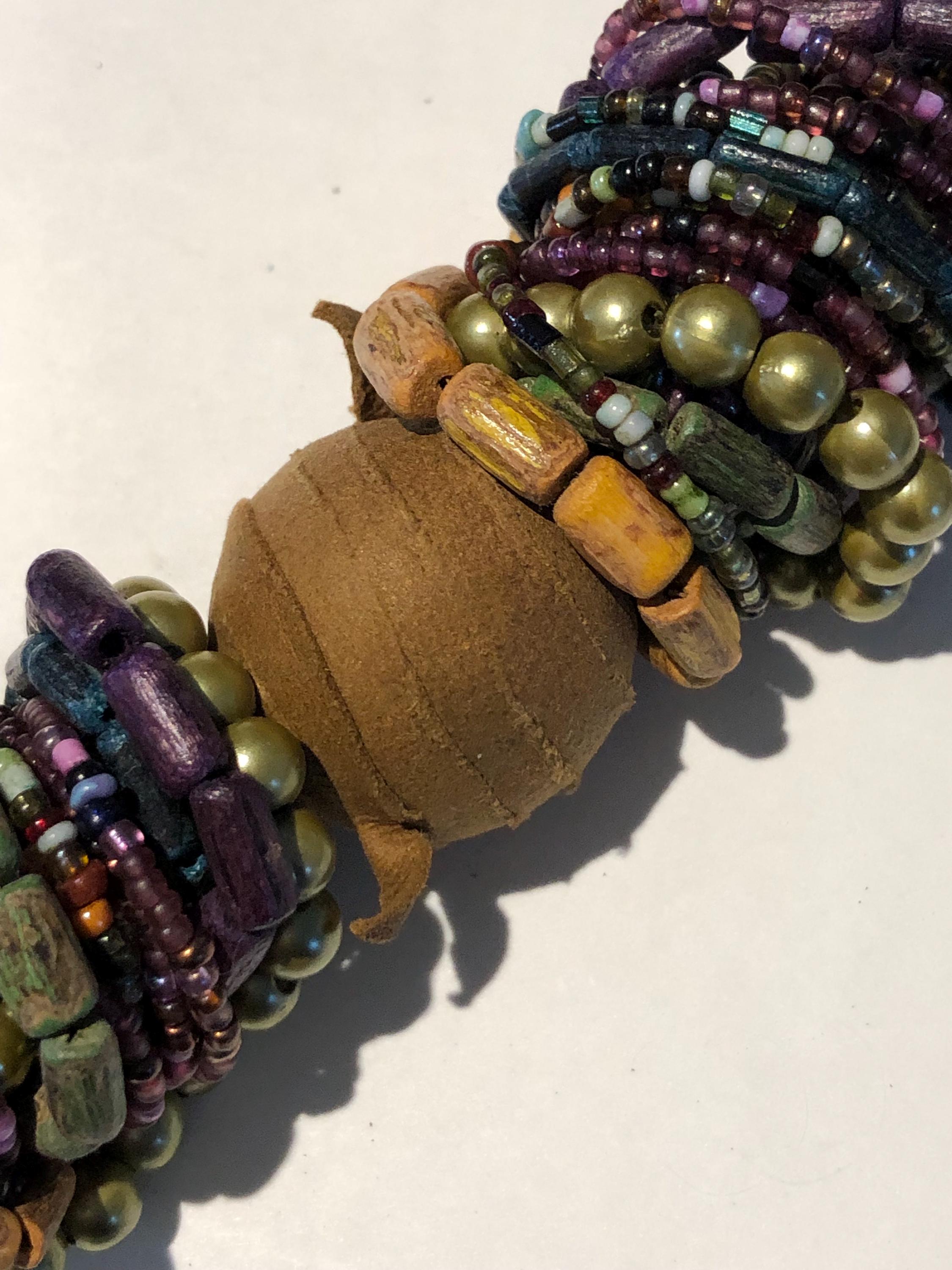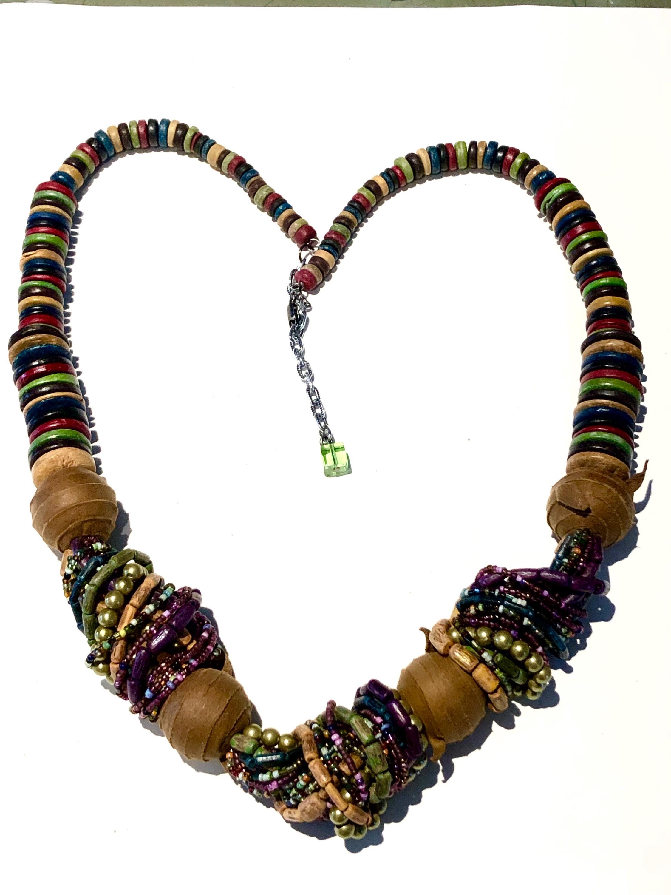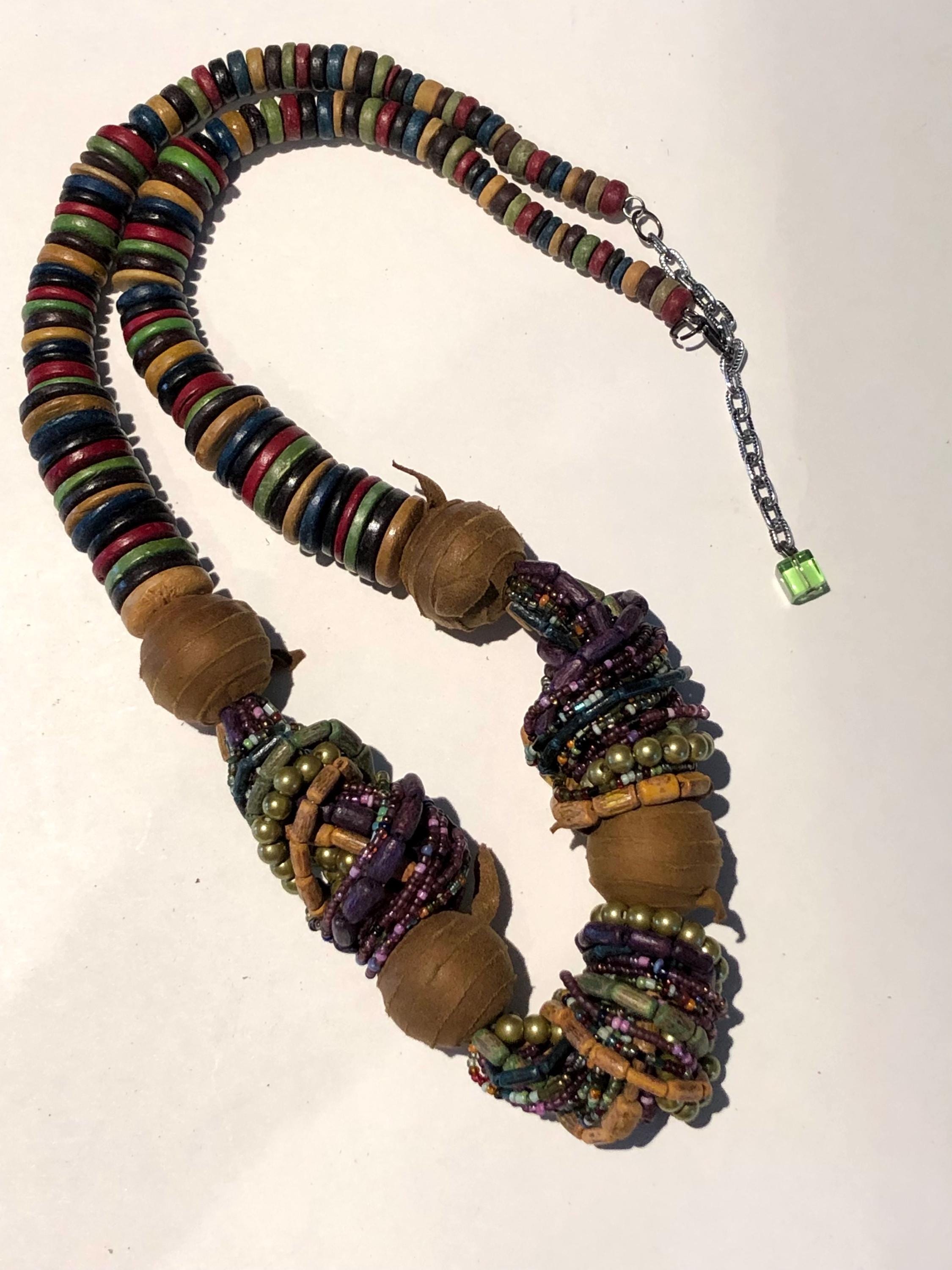 Vintage BoHo Style Necklace c1980' -90's Beautiful, stunning and elegant...a simple design that says "stylishly timeless", multi colored beads in royal purple, greens, leather wrapped wooden beads complimented with flat wooden beads in multiple colors with a lobster closure. Approximately 32" long,