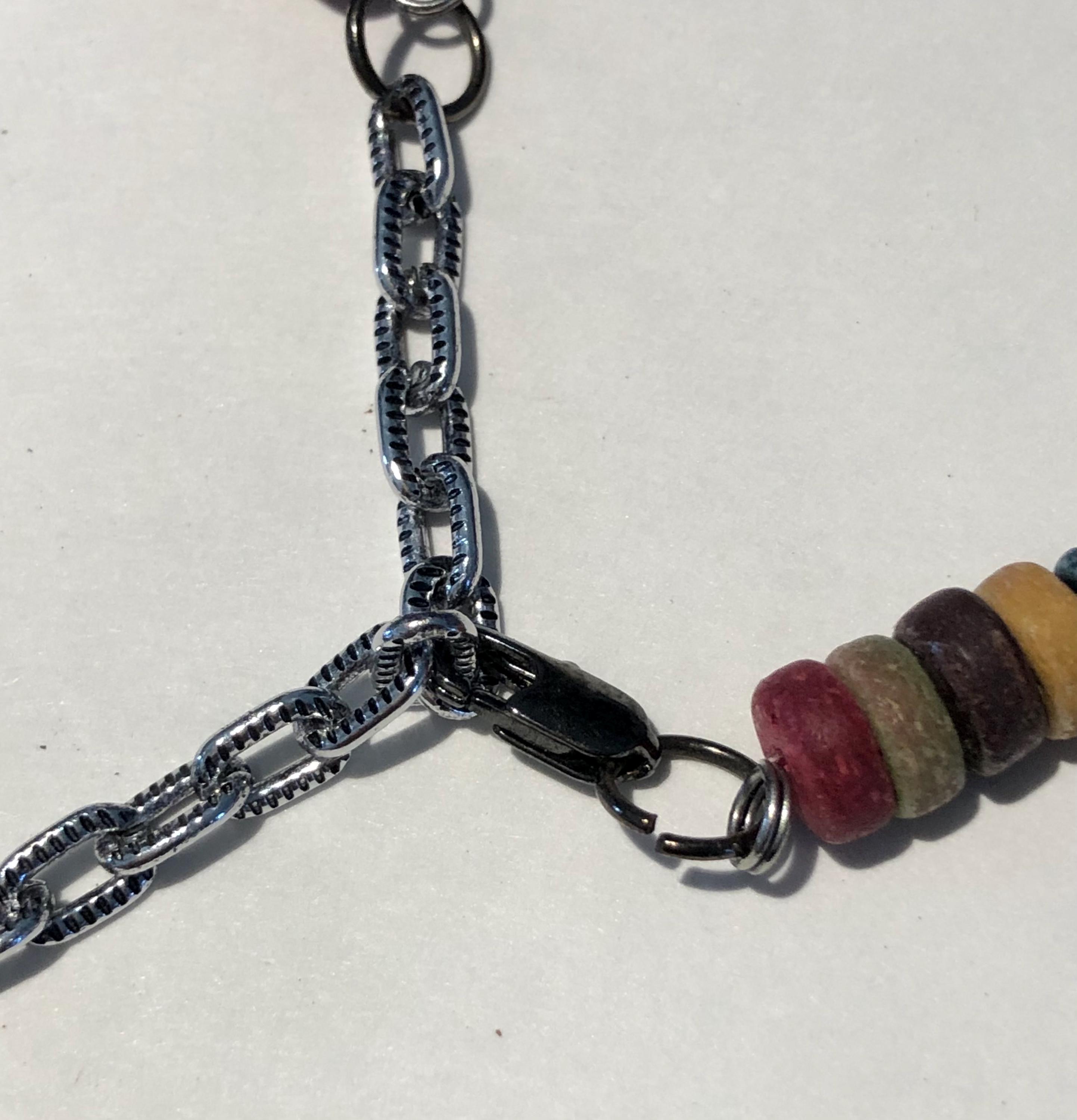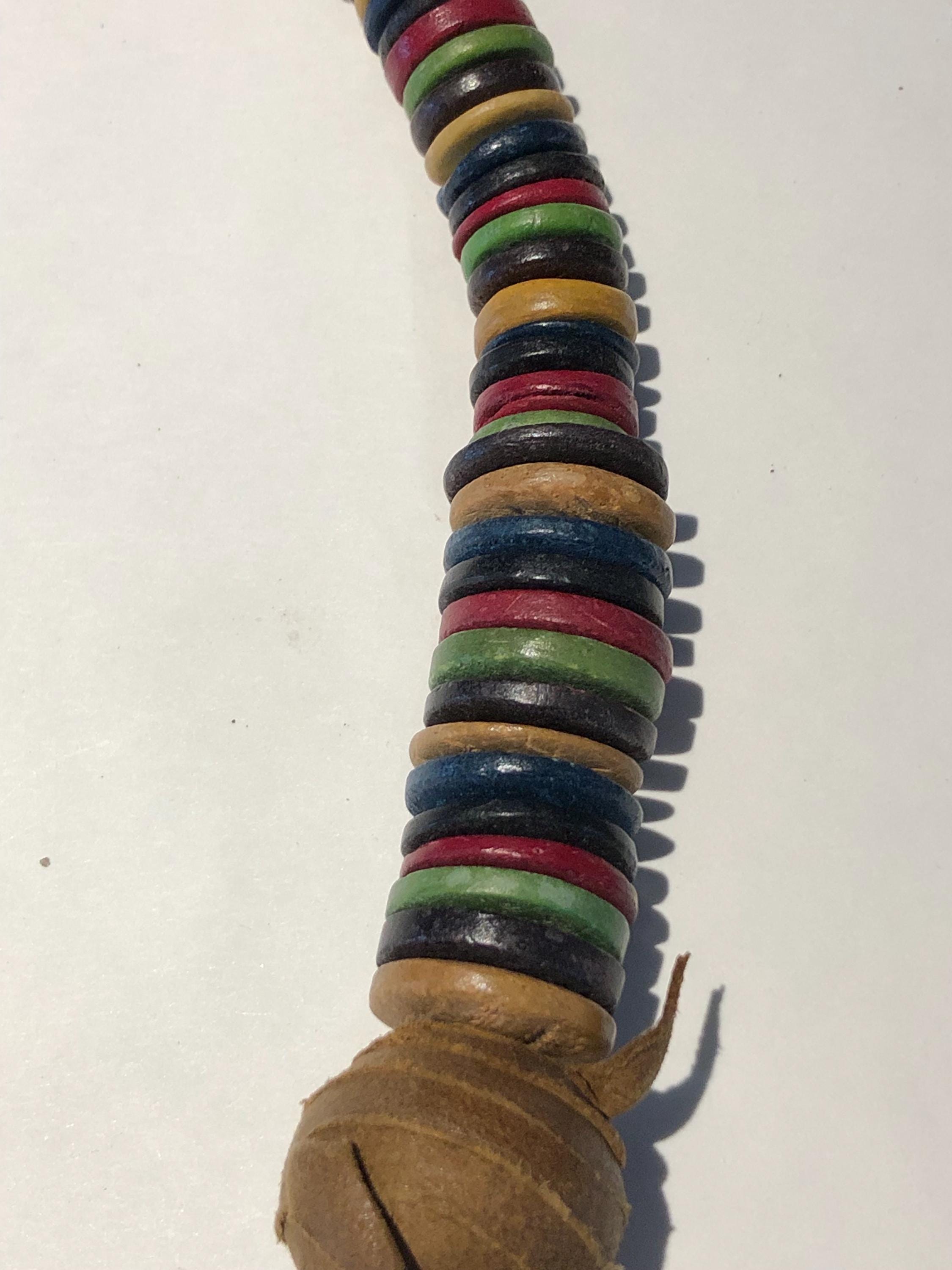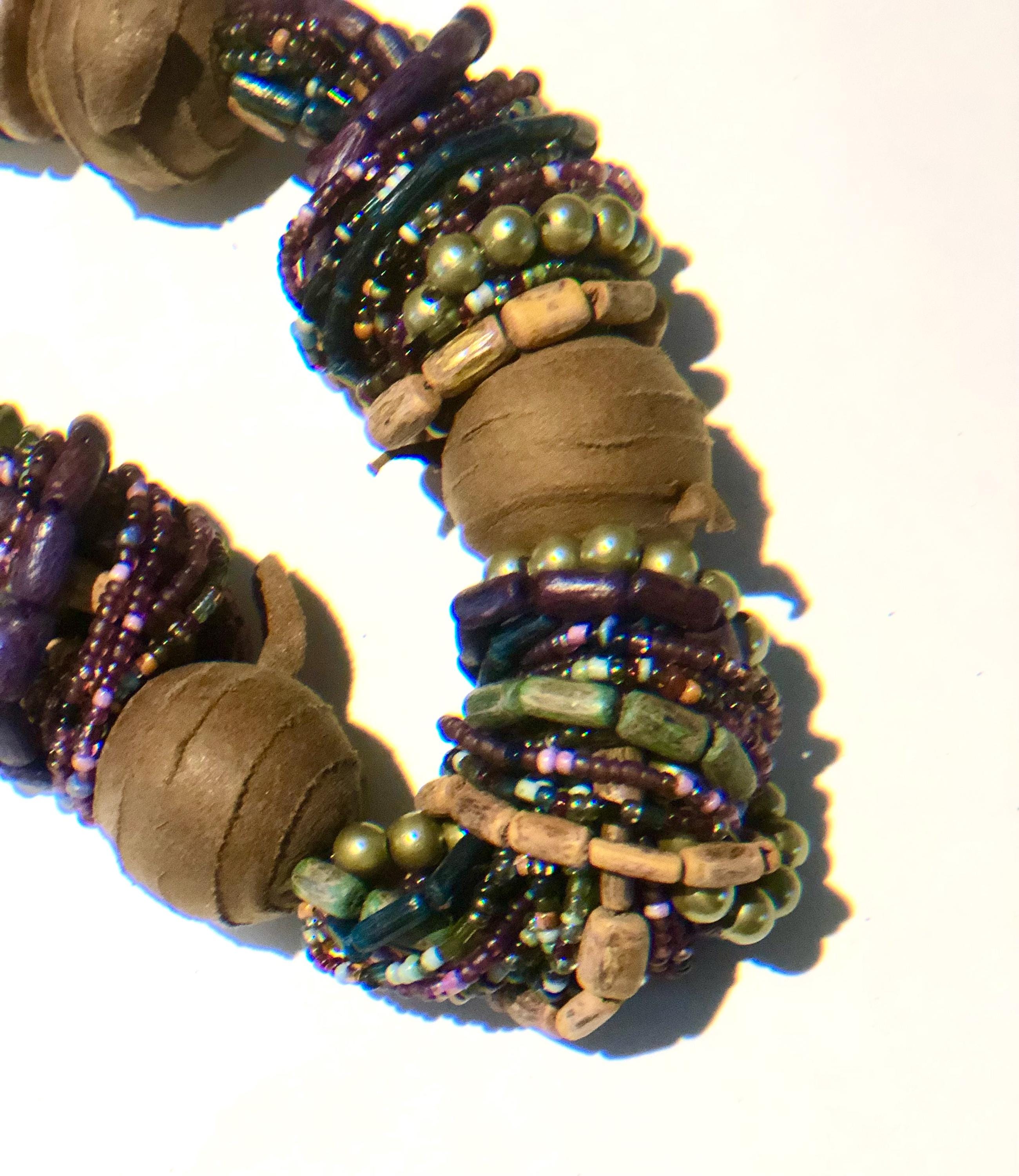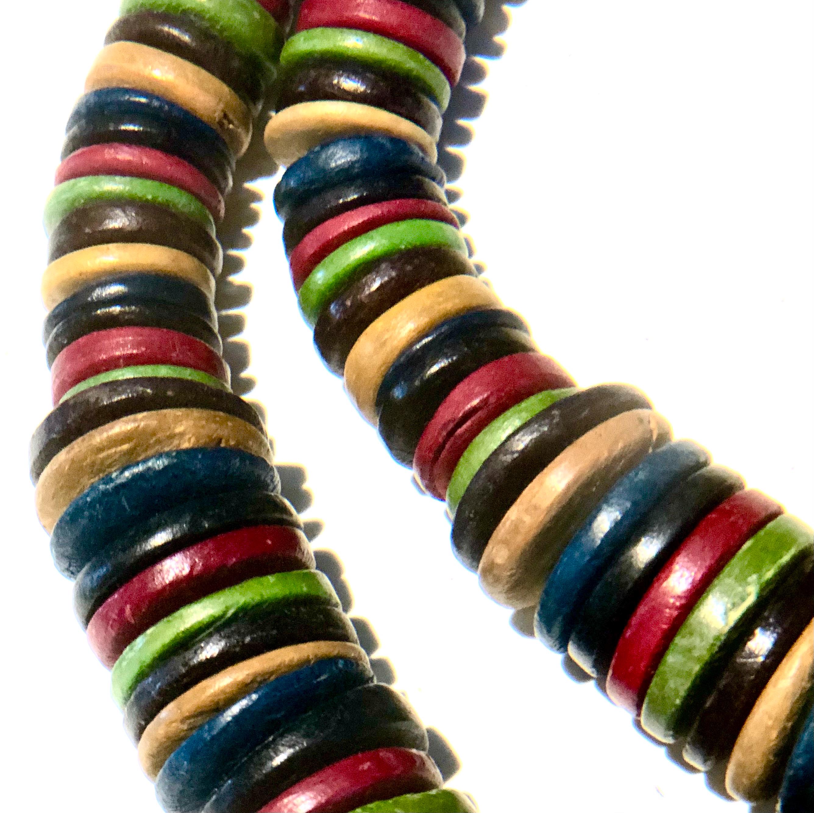 Vintage BoHo Style Necklace c1980' -90's Beautiful, stunning and elegant...a simple design that says "stylishly timeless", multi colored beads in royal purple, greens, leather wrapped wooden beads complimented with flat wooden beads in multiple colors with a lobster closure. Approximately 32" long,