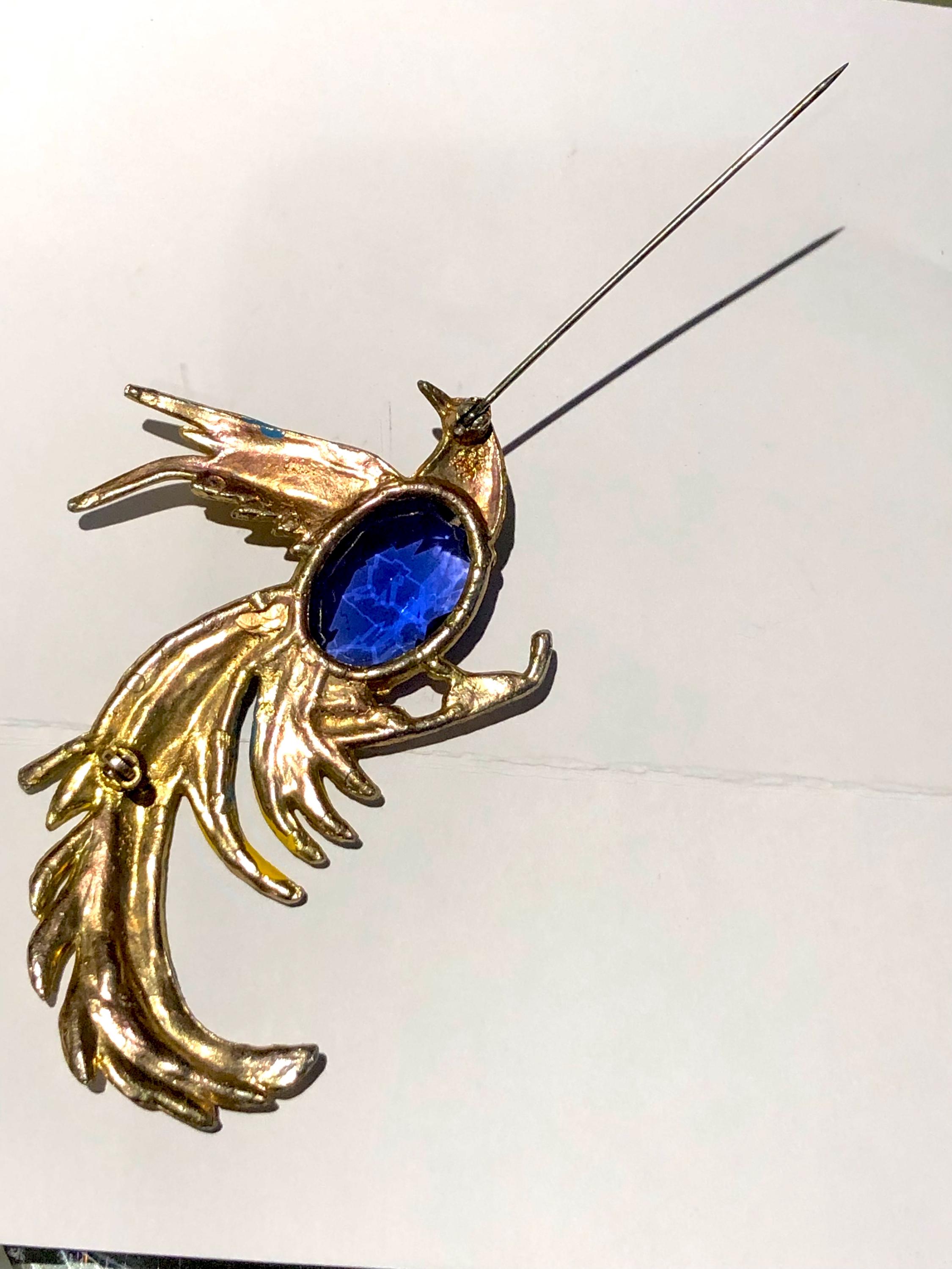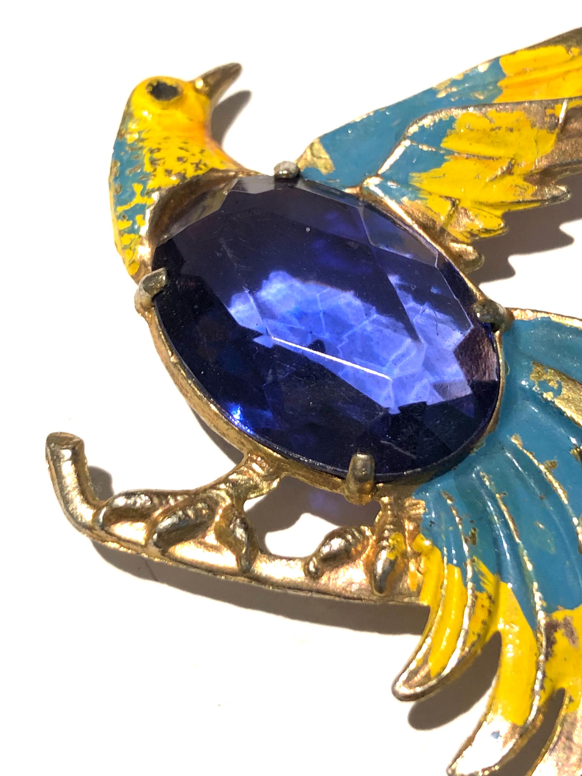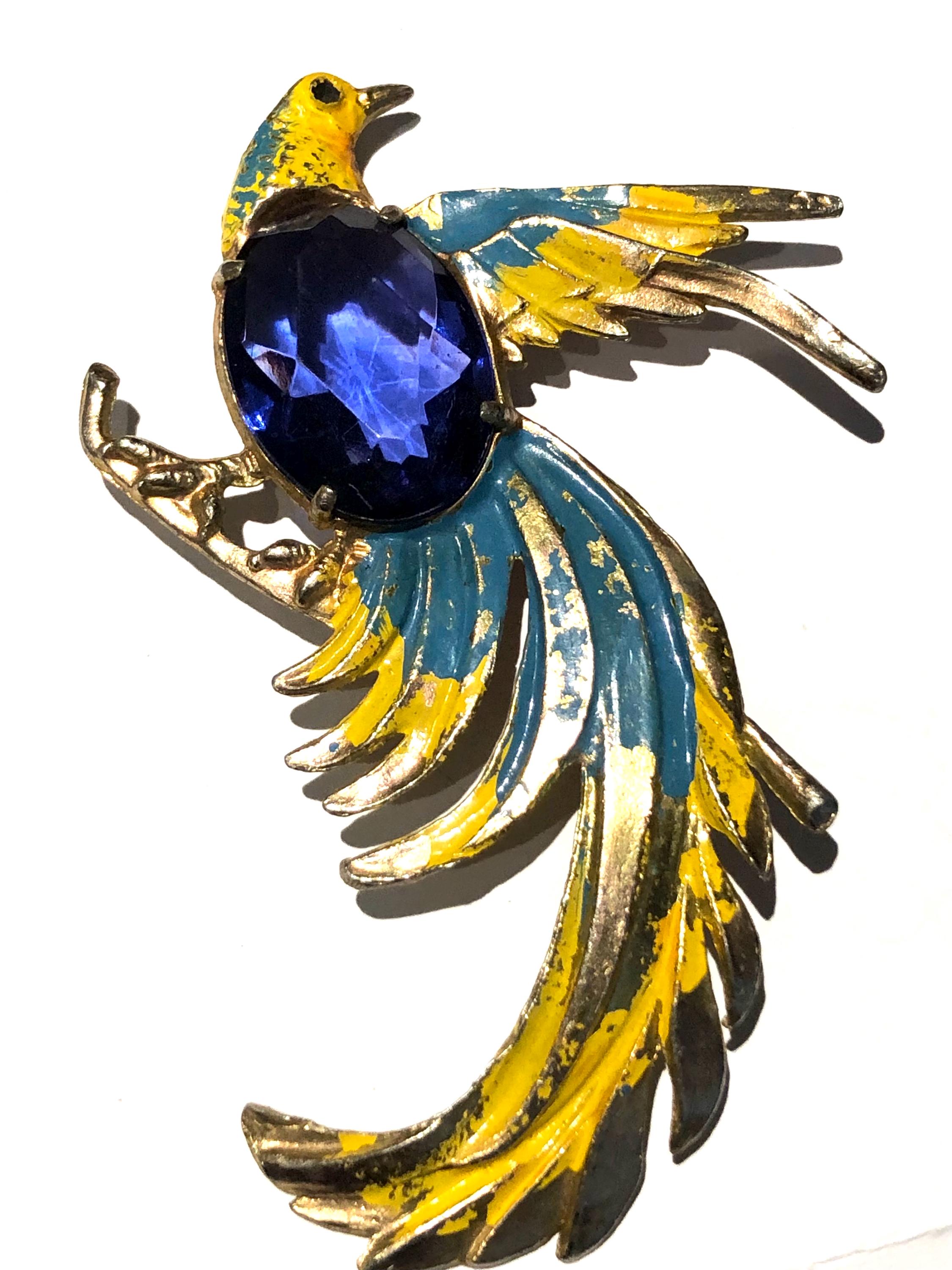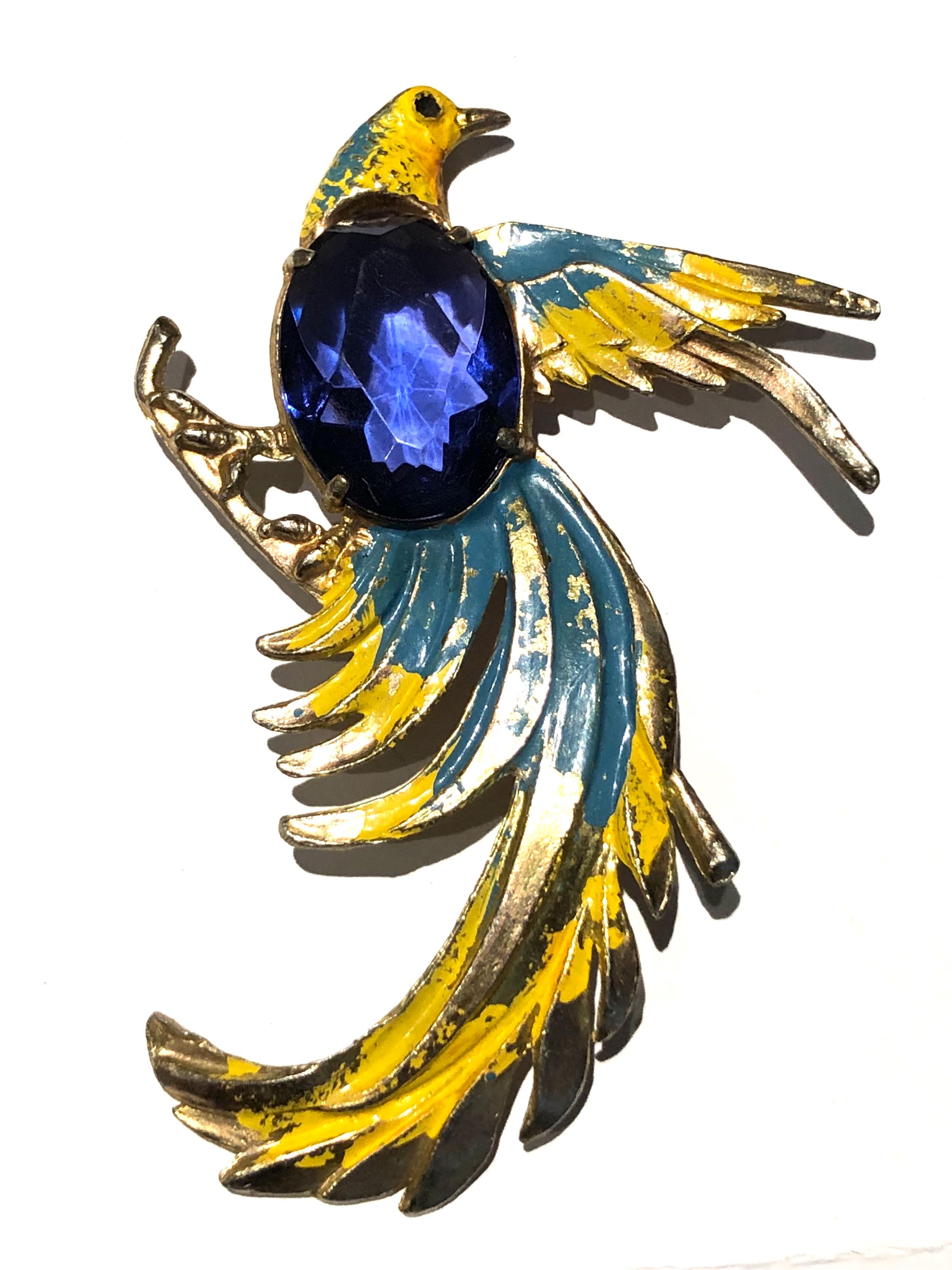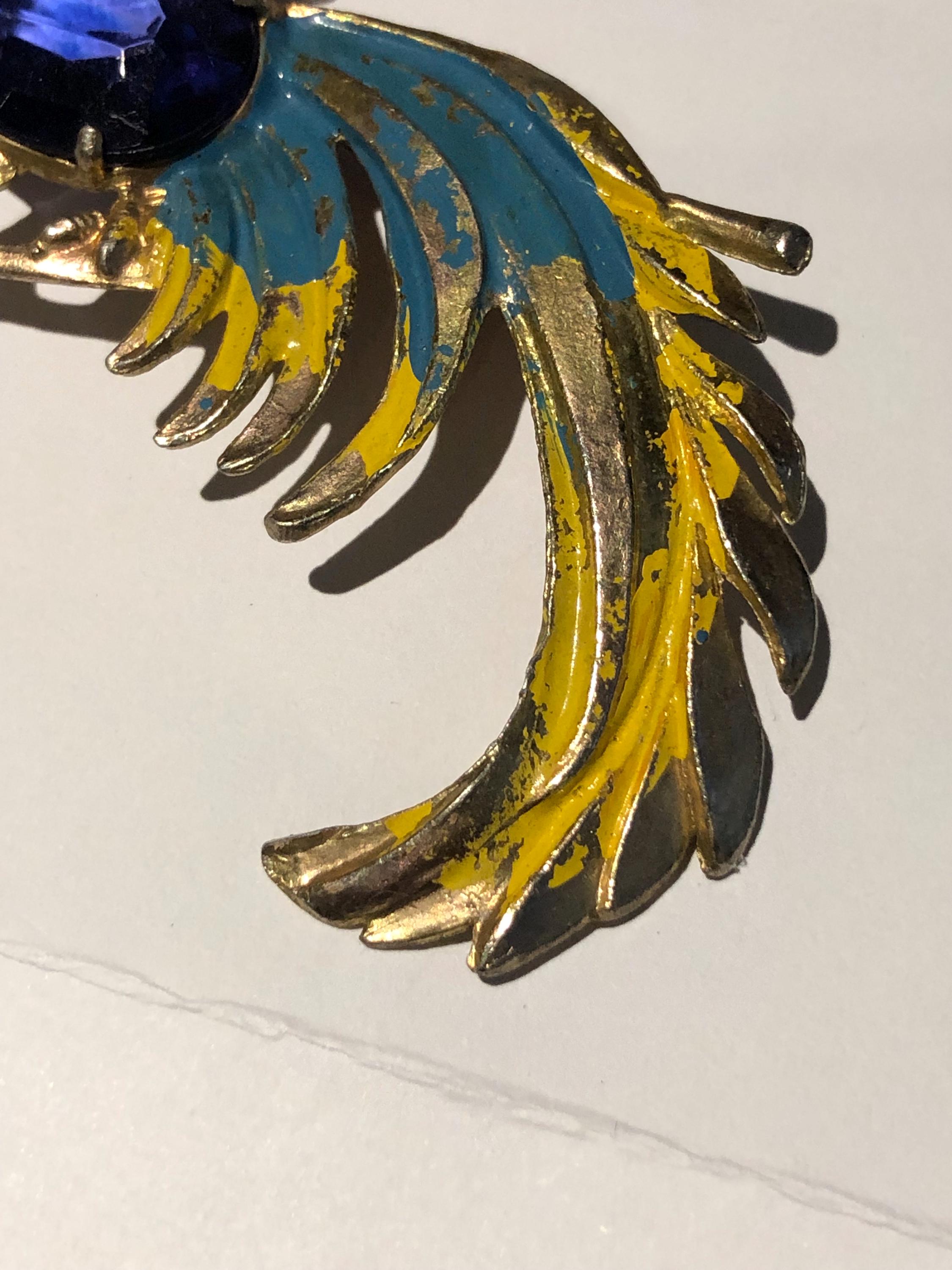 Jelly Belly Parrot Pin/Brooch…Goldtone base metal with colorful cold paint in blue and yellow, enhanced with a faceted large blue glass stone. beautiful addition to Parrothead collections, that retro vintage look …. 3.5” long … perfect accent for a coat or scarf! Condition: Pre-owned and carefully preserved.