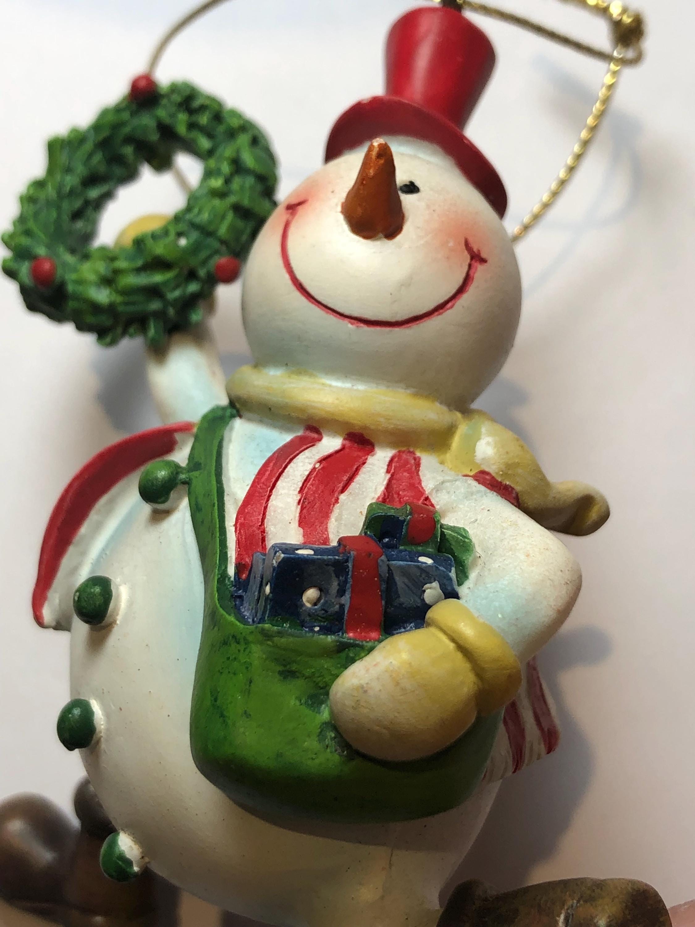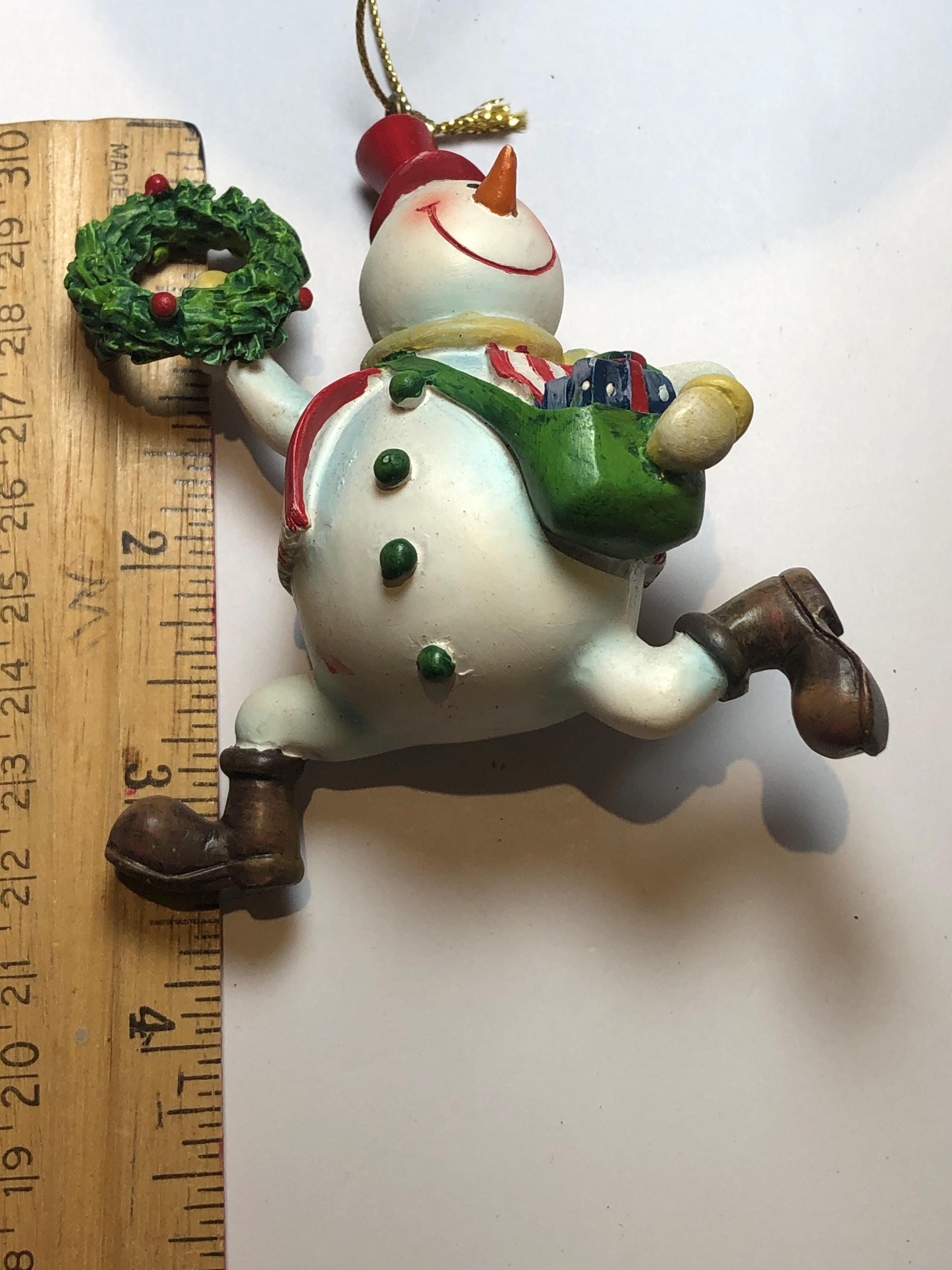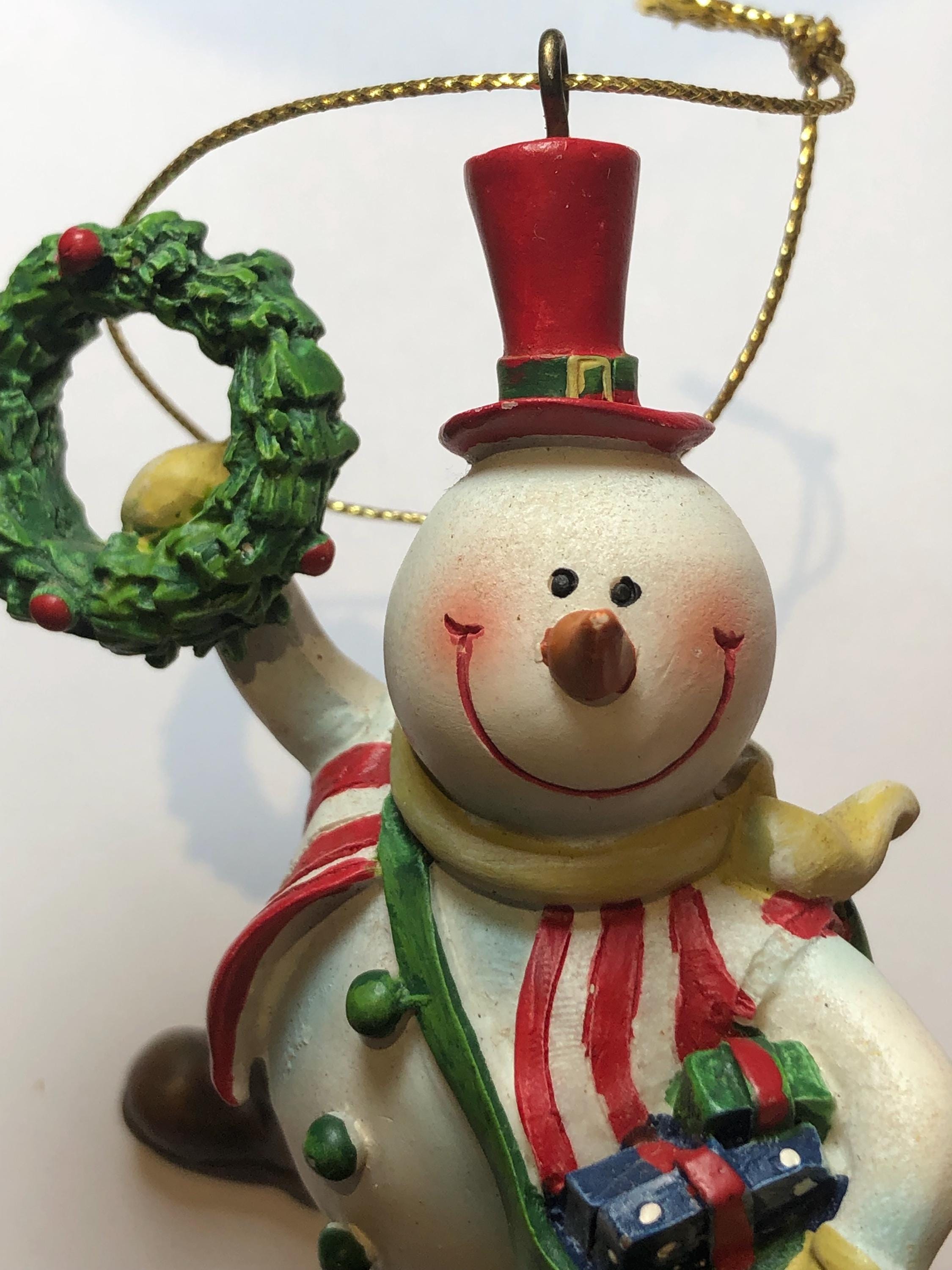Vintage Snowman Delivery Christmas Ornament - perfect keepsake for the collector of snowmen ornaments. Satchel on shoulder, full of presents, Christmas Wreath in hand, the glee of the Holidays! Pre-owned and carefully stores each year.