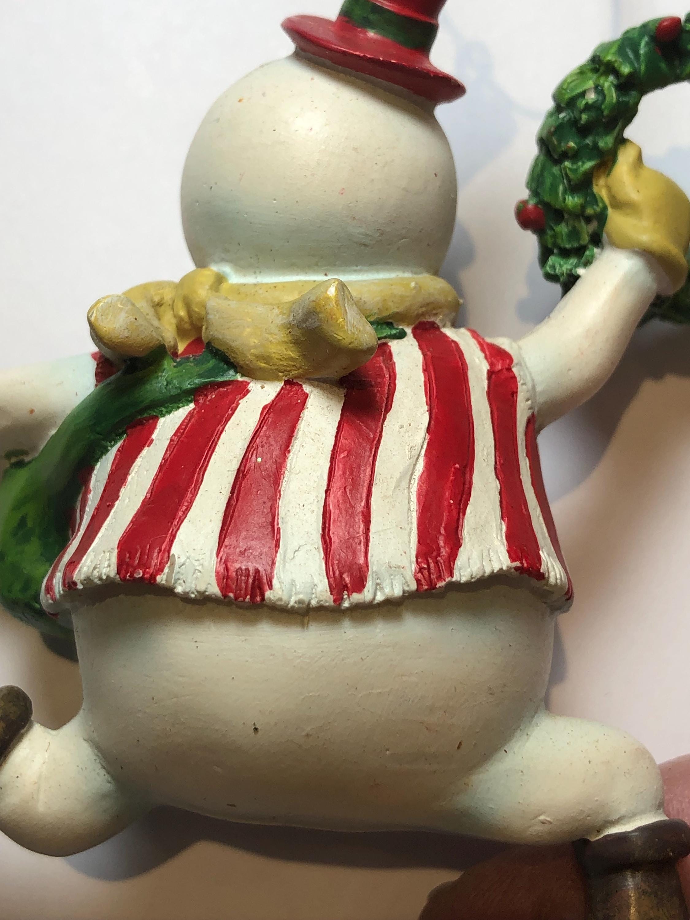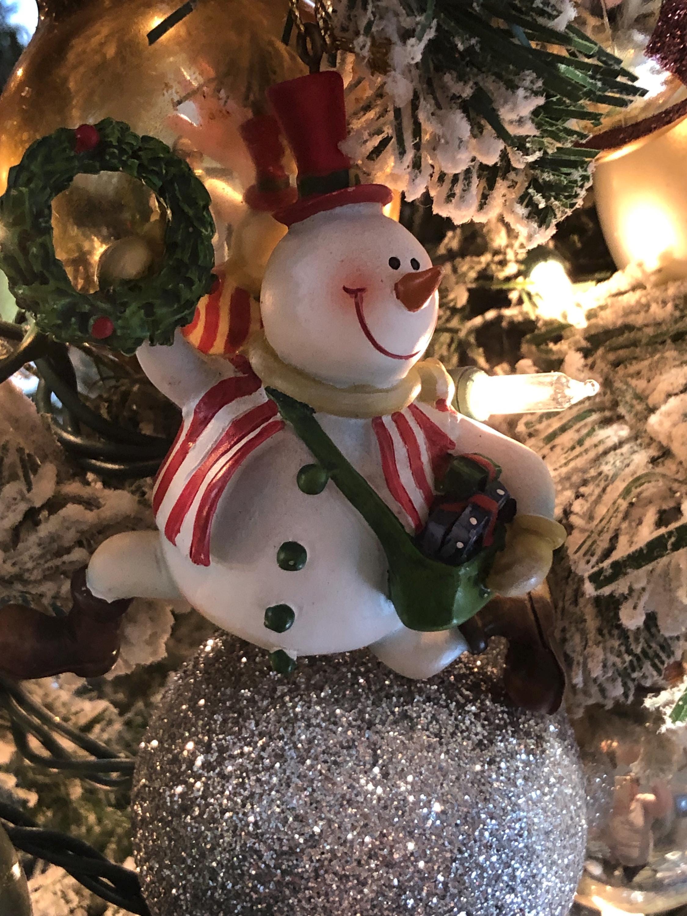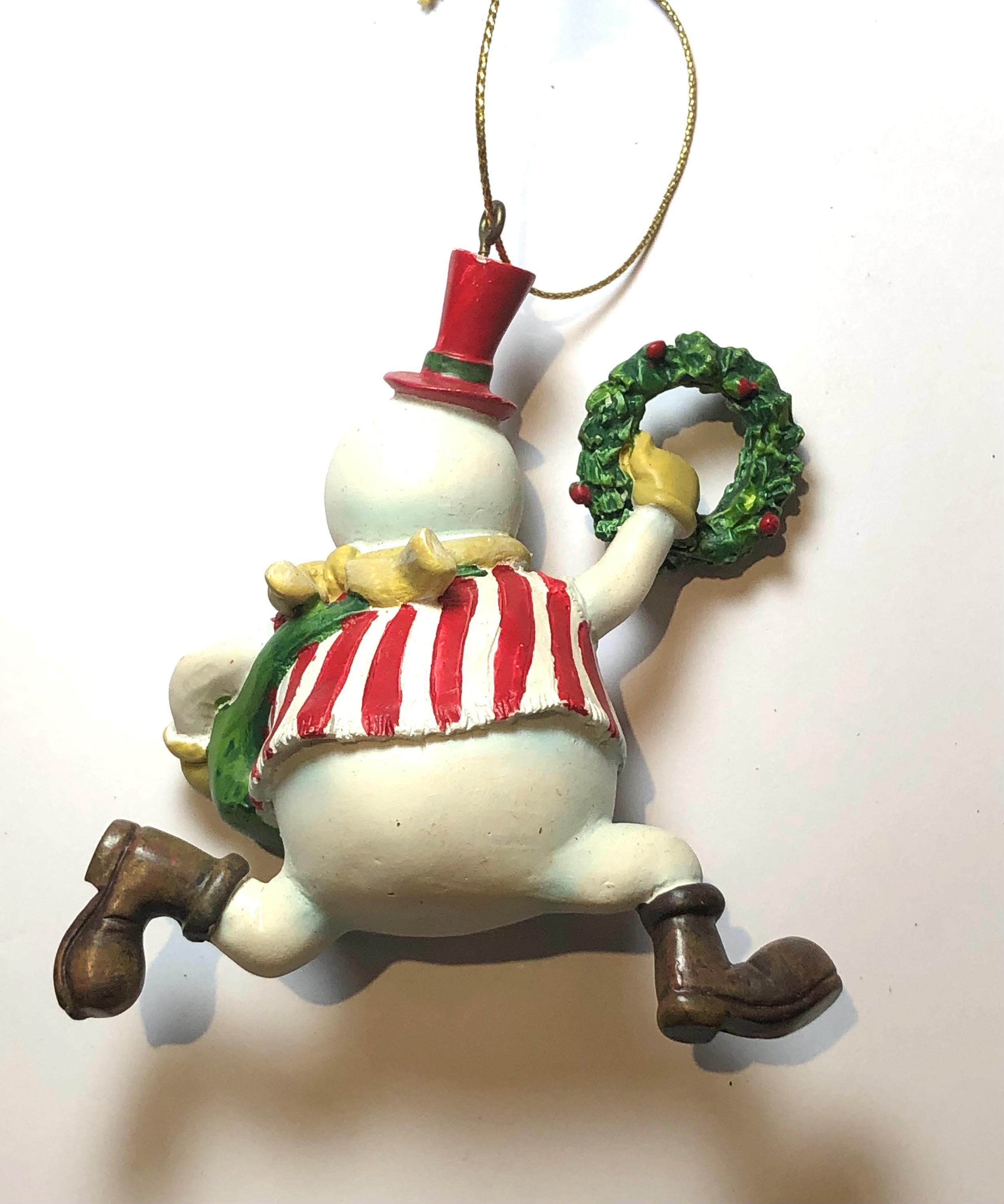 Vintage Snowman Delivery Christmas Ornament - perfect keepsake for the collector of snowmen ornaments. Satchel on shoulder, full of presents, Christmas Wreath in hand, the glee of the Holidays! Pre-owned and carefully stores each year.