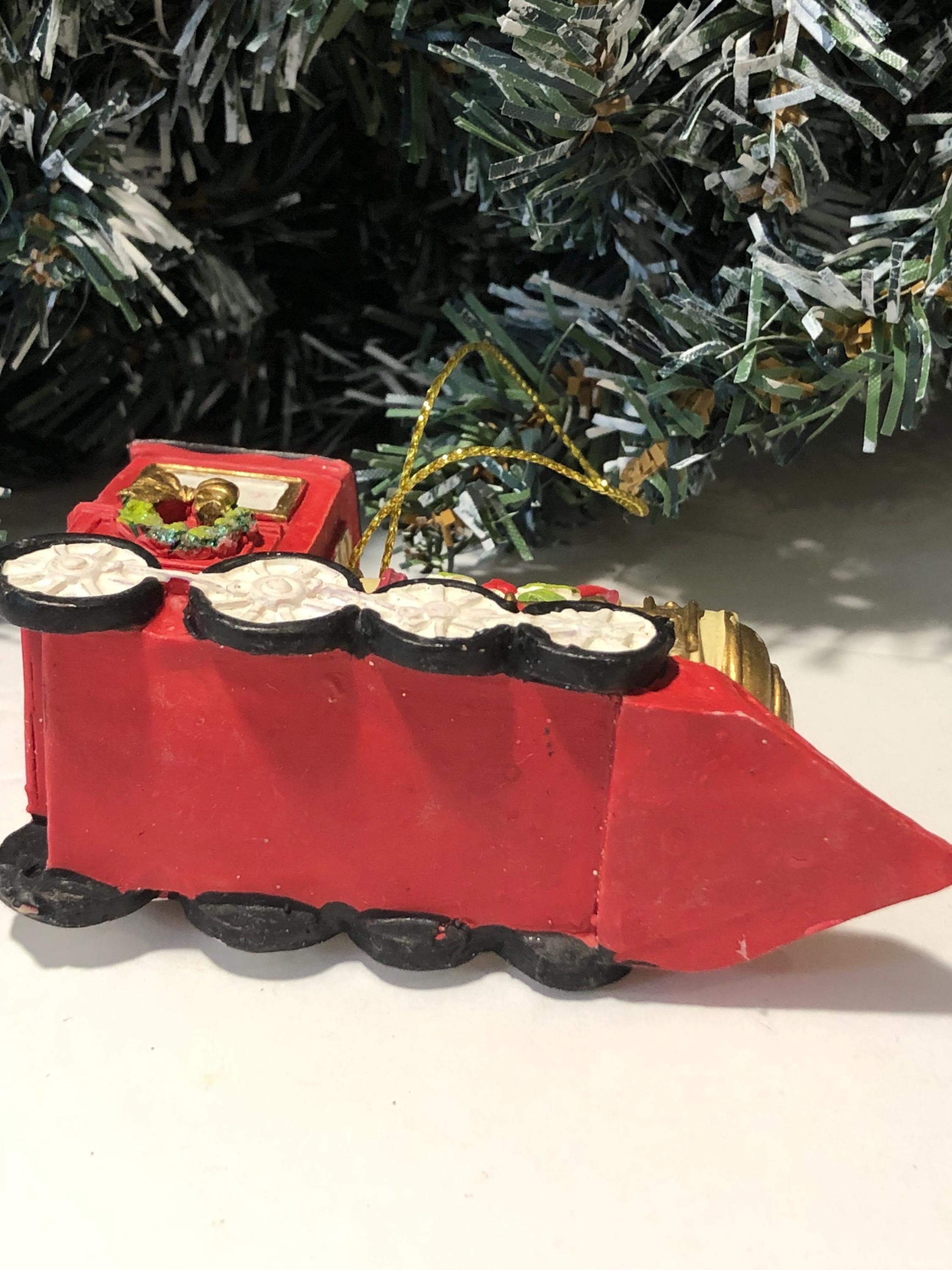 This ornament will surely bring up fond memories of the Santa Christmas Train or that childhood toy train under the tree. Beautifully executed in brilliant colors and detail, this ornament is durable and the perfect keepsake for the train lover! Christmas Ornament - pre-Owned