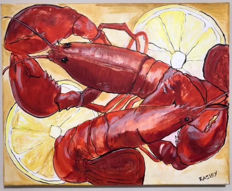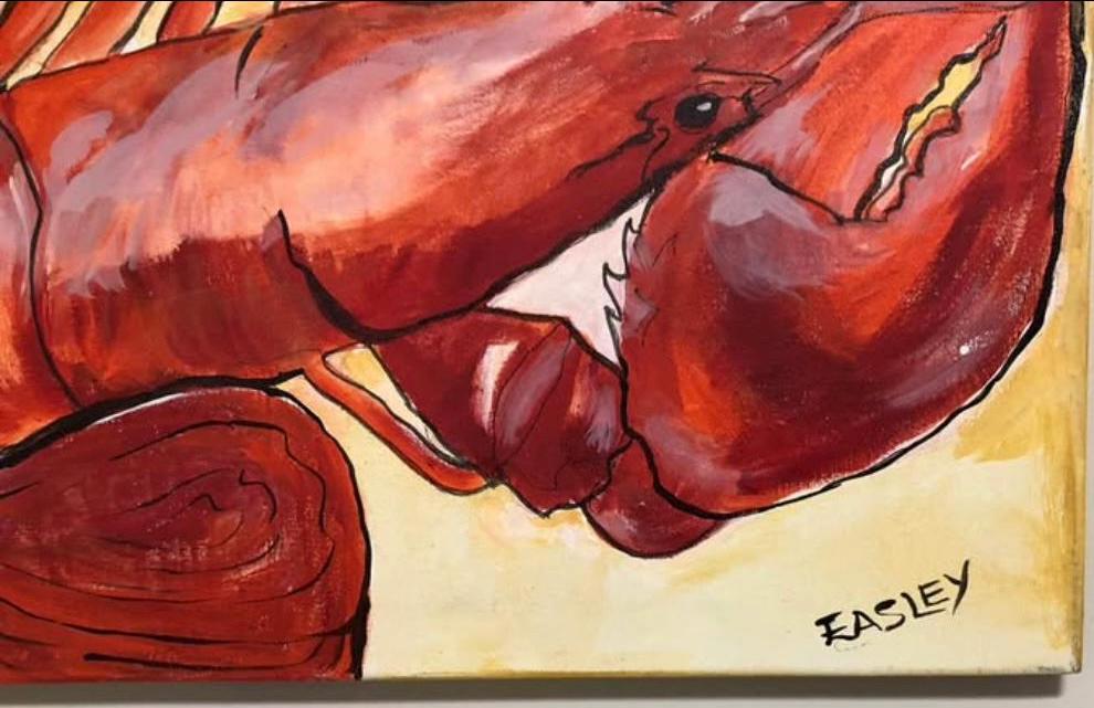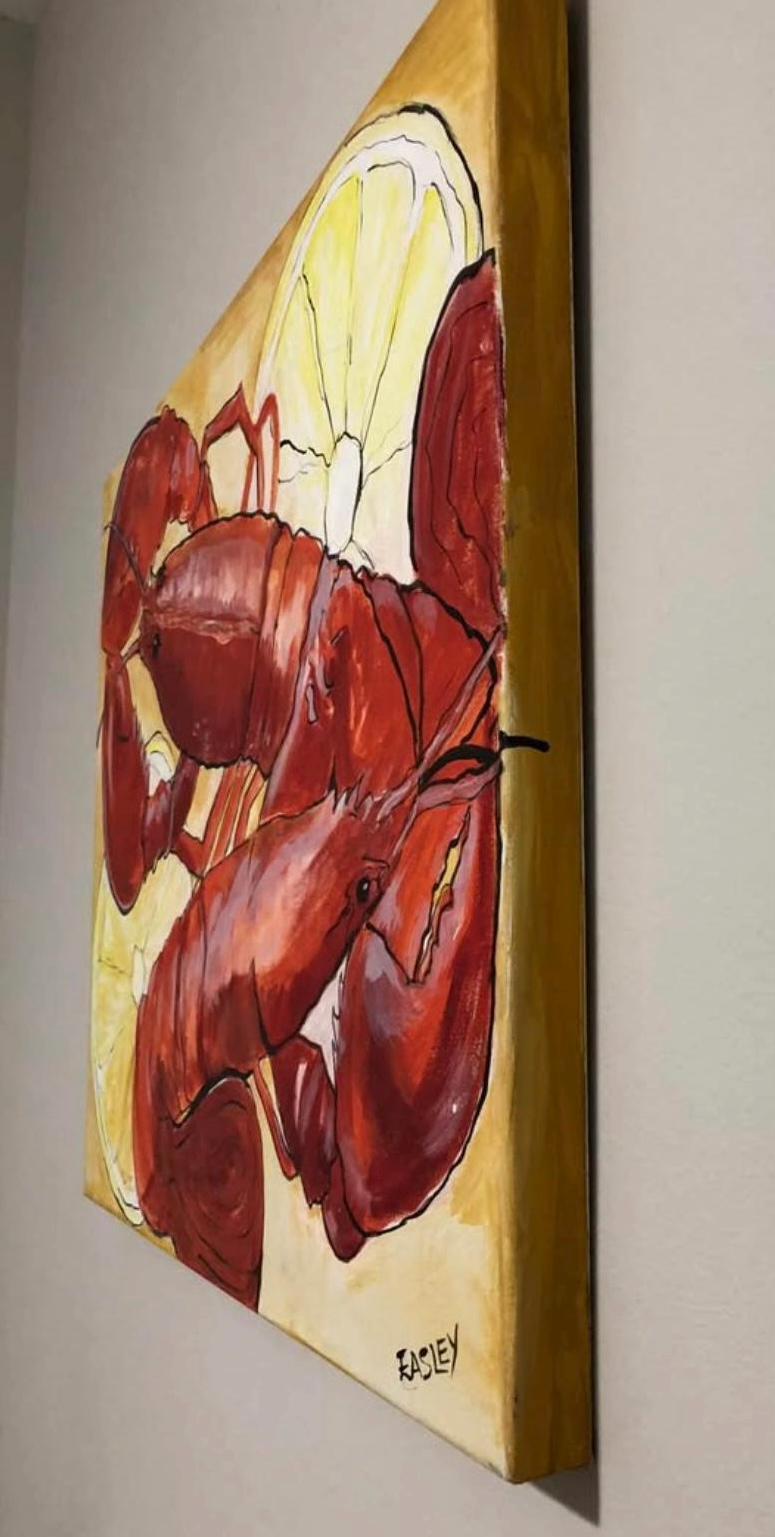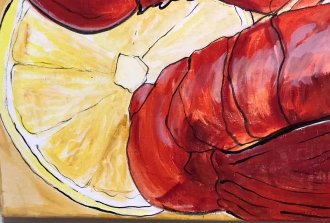 Lobster Lover? This one’s for you! “Lobster With Lemons” 24”x30” acrylic painting on a deep gallery wrapped canvas. Perfect to brightened up a beach cottage, ocean front property, a kitchen dining area, this whimsical lobster has lots of detail and brilliant color!