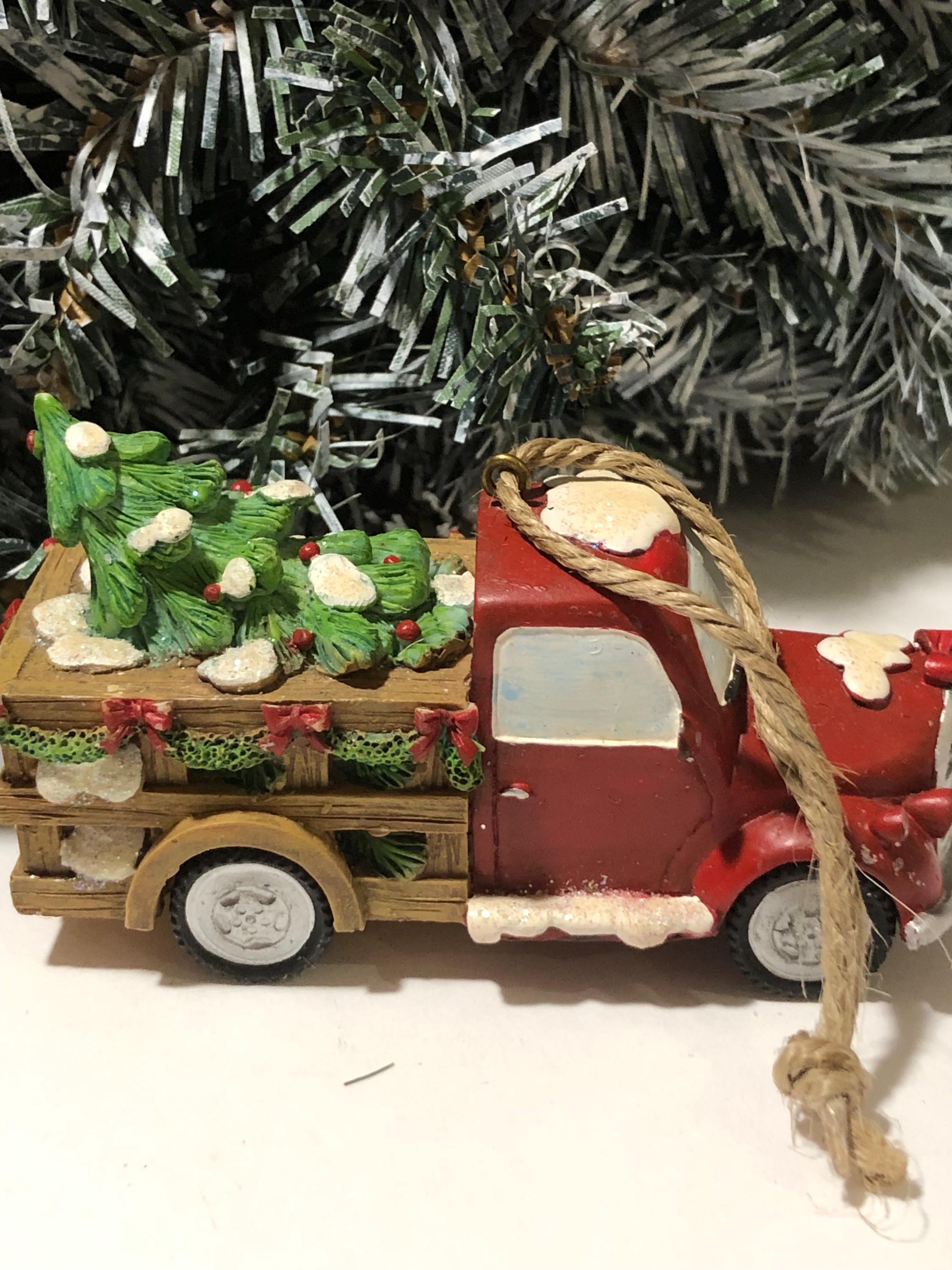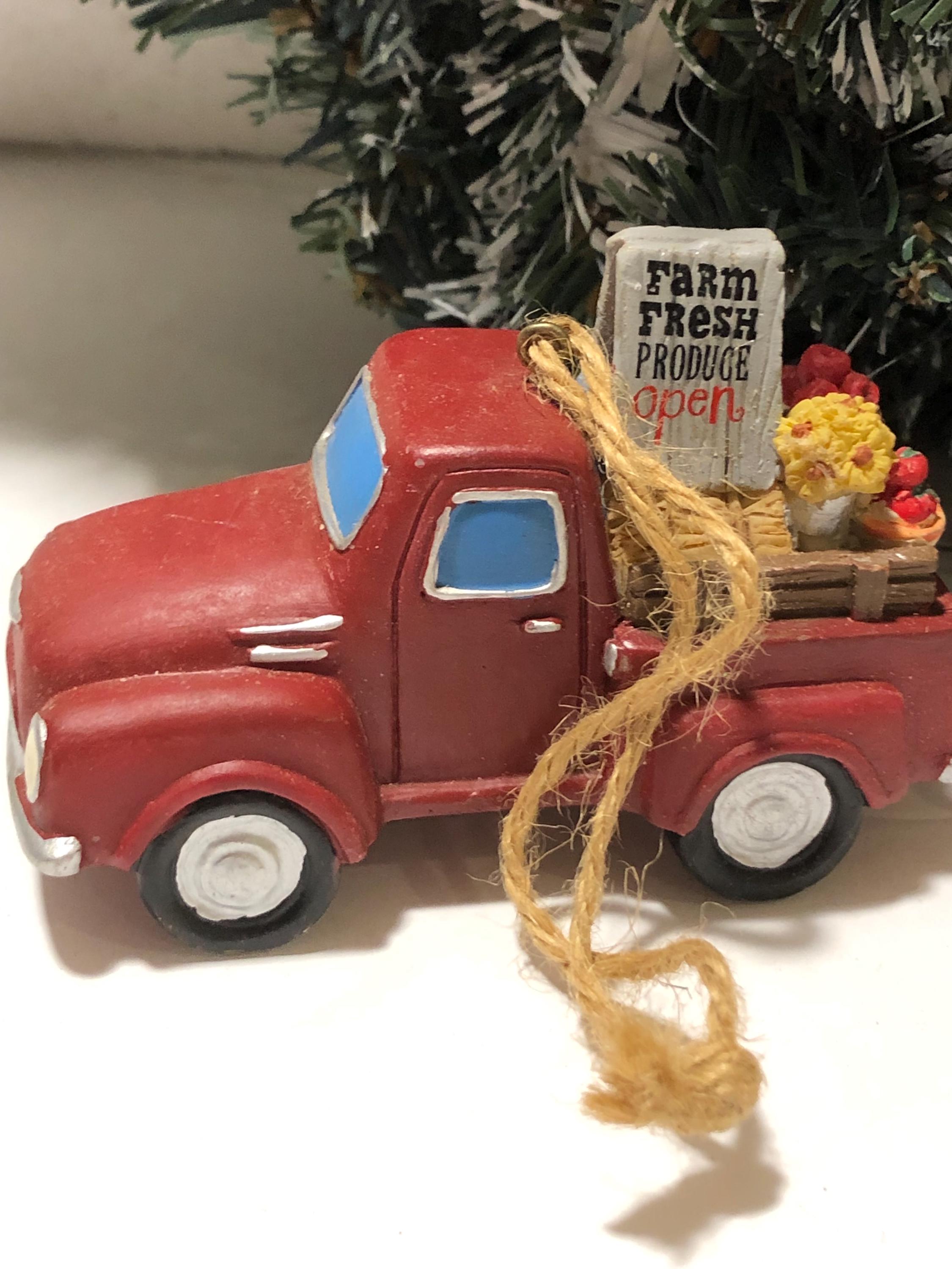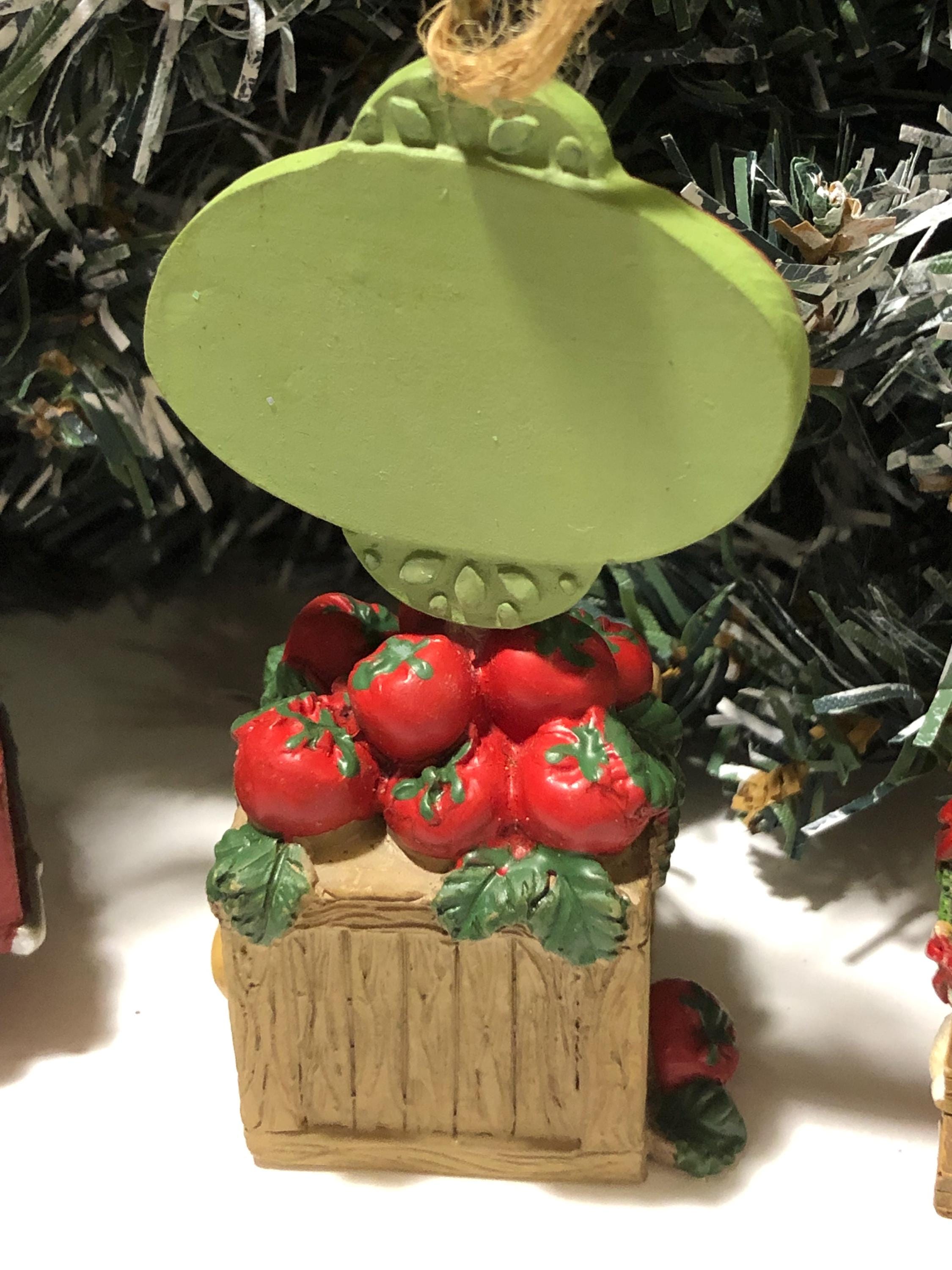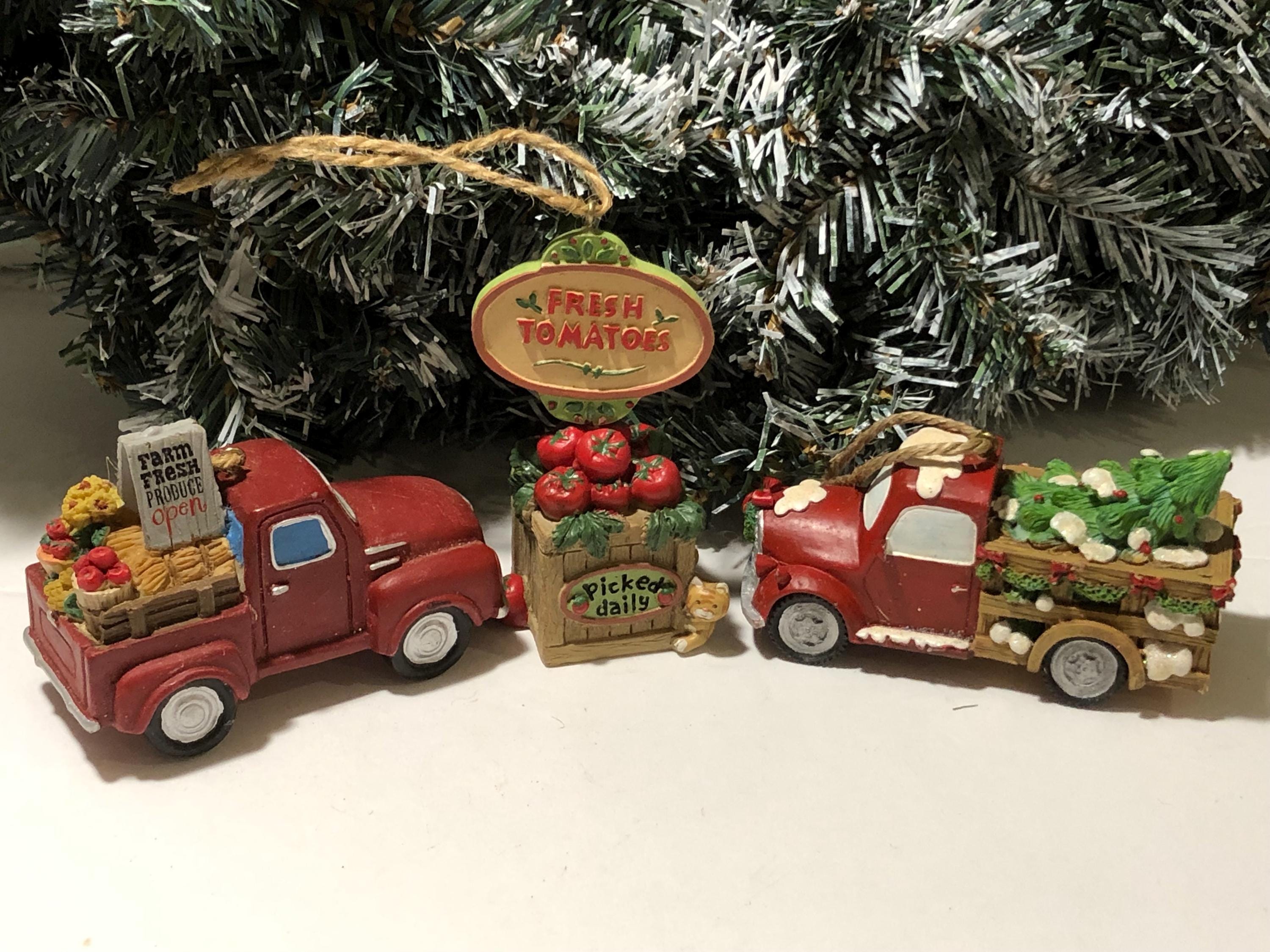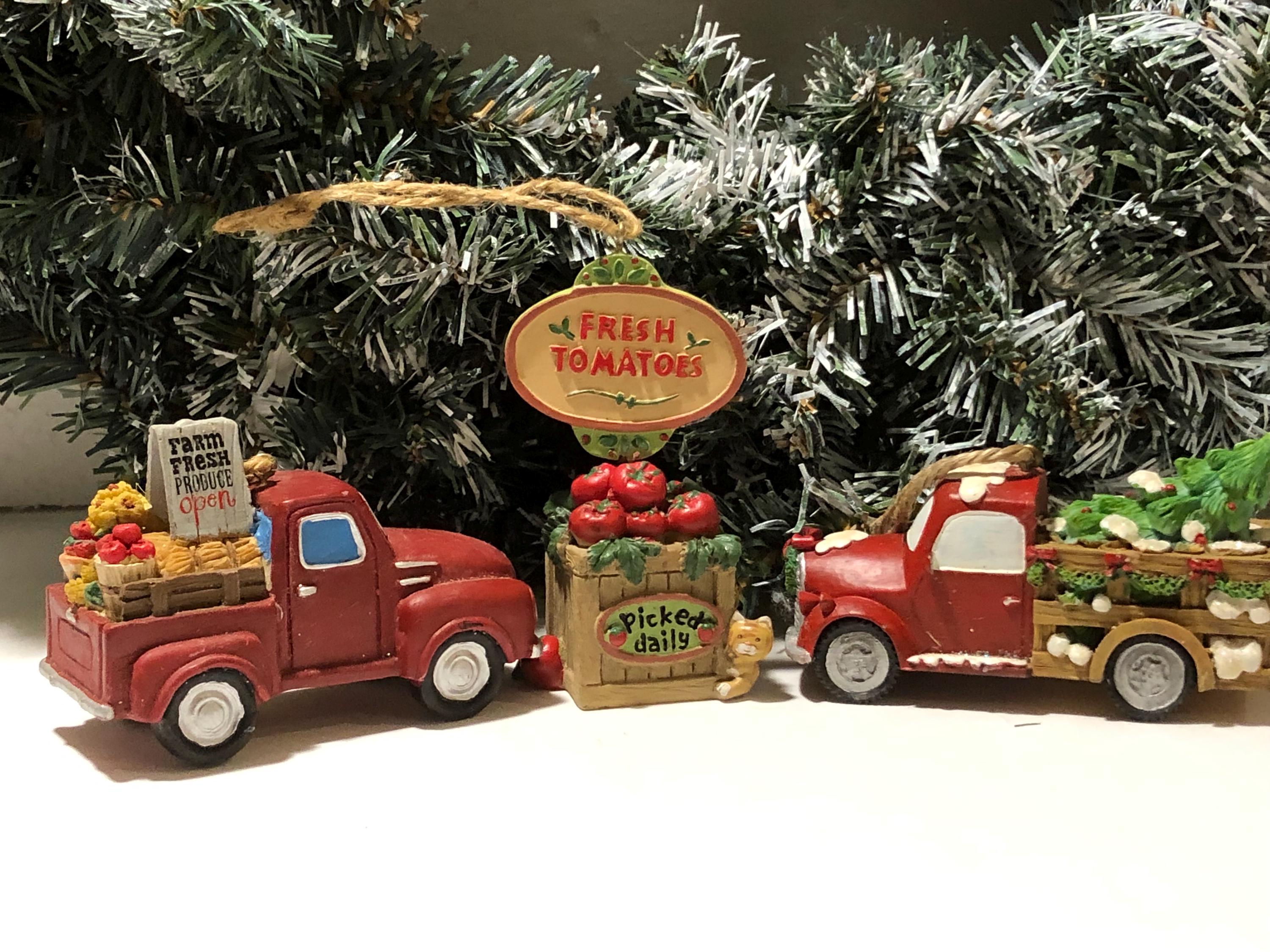 Christmas Village Ornaments featuring truck farmers and a vegetable stand.