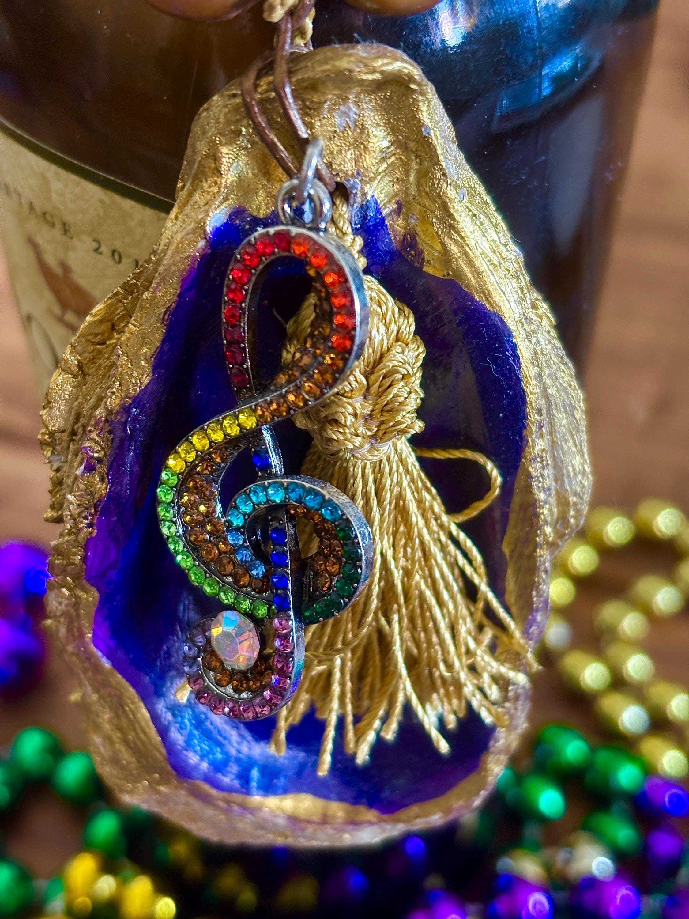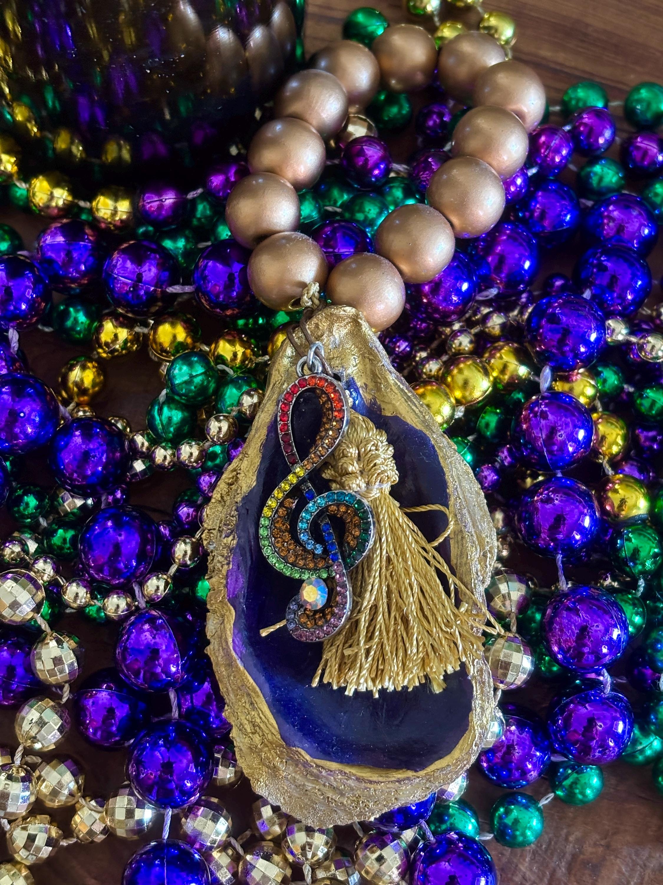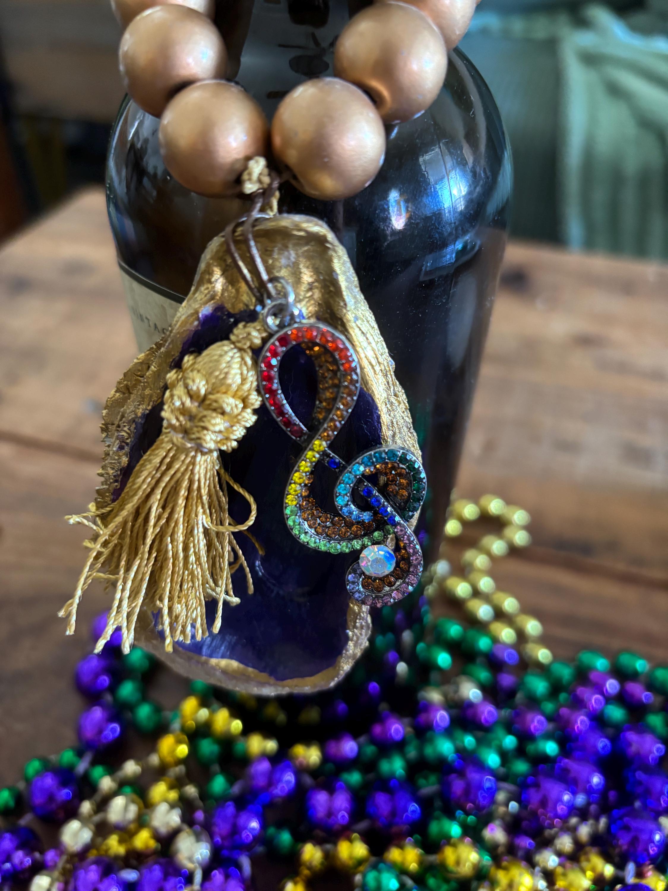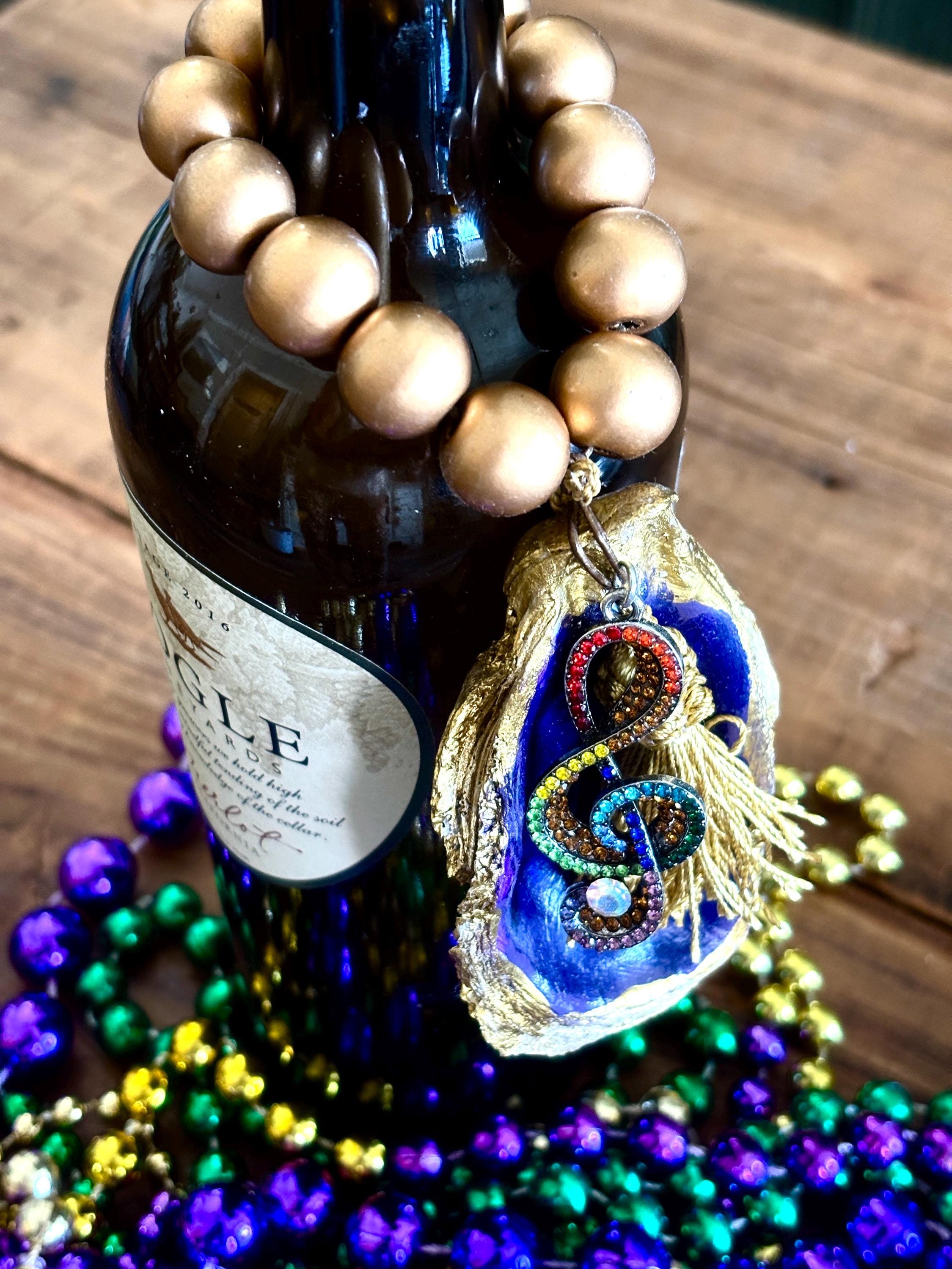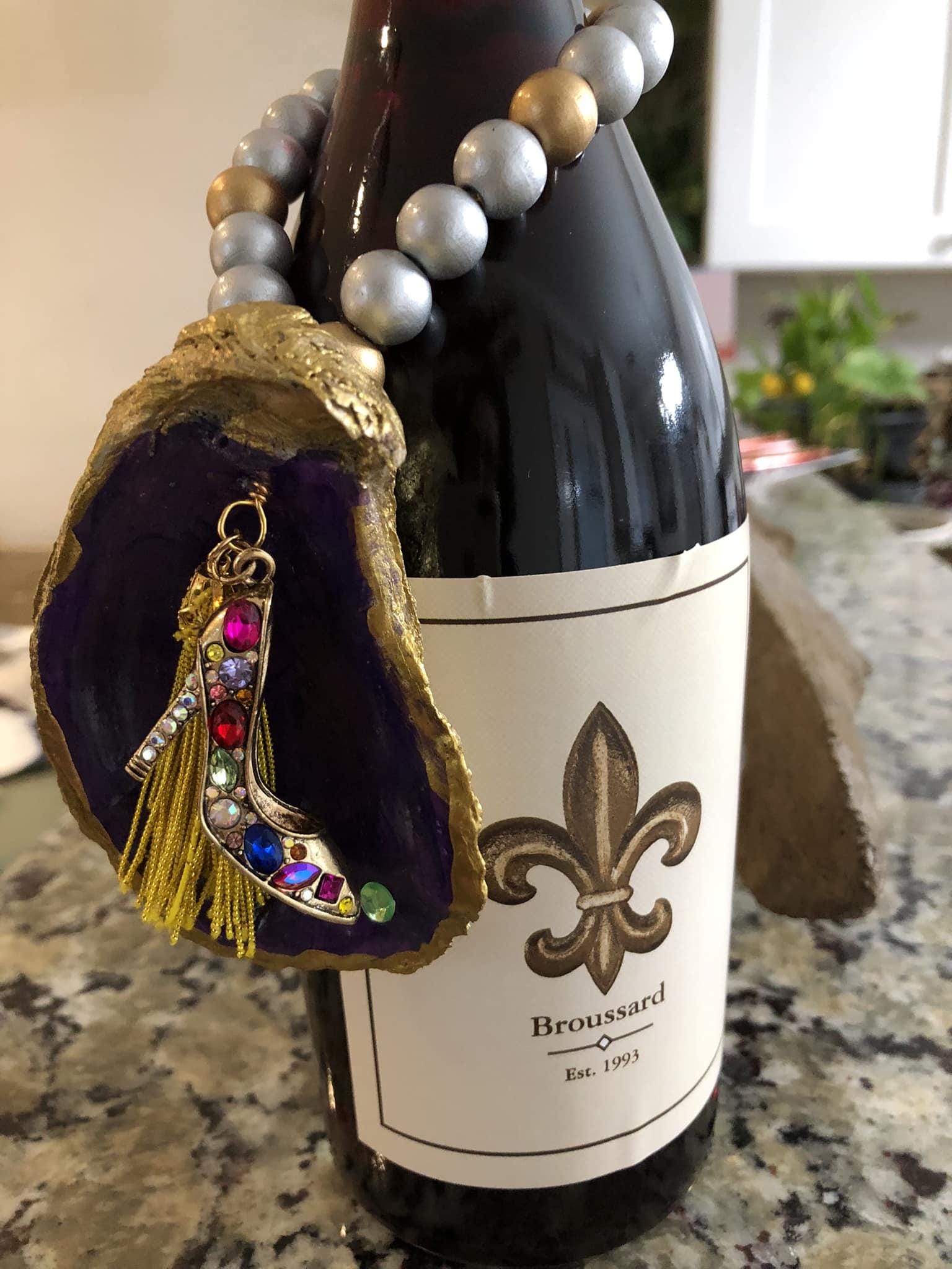 Oyster Shell Wine Braclet, embellished in Traditional Mardi Gras flair, Hand Painted and decorated with a high heeled shoe in the style of the Popular Krewe of Muse Mardi Gras throws. (Not affiliated with the New Orleans Krewe of Muse) Use as a wine bracelet, gift bag tag or just an accent piece, eye catching and timeless decor!