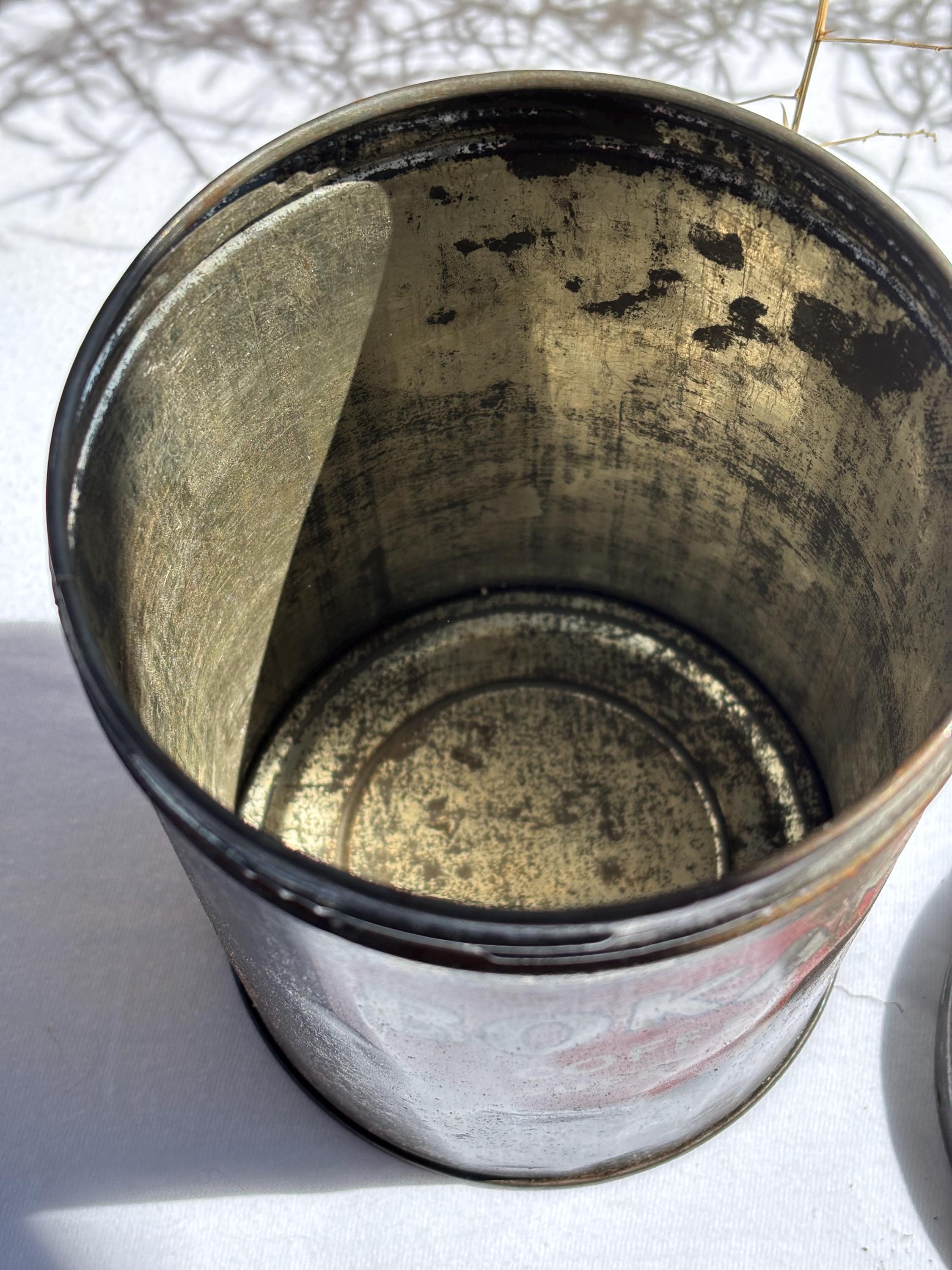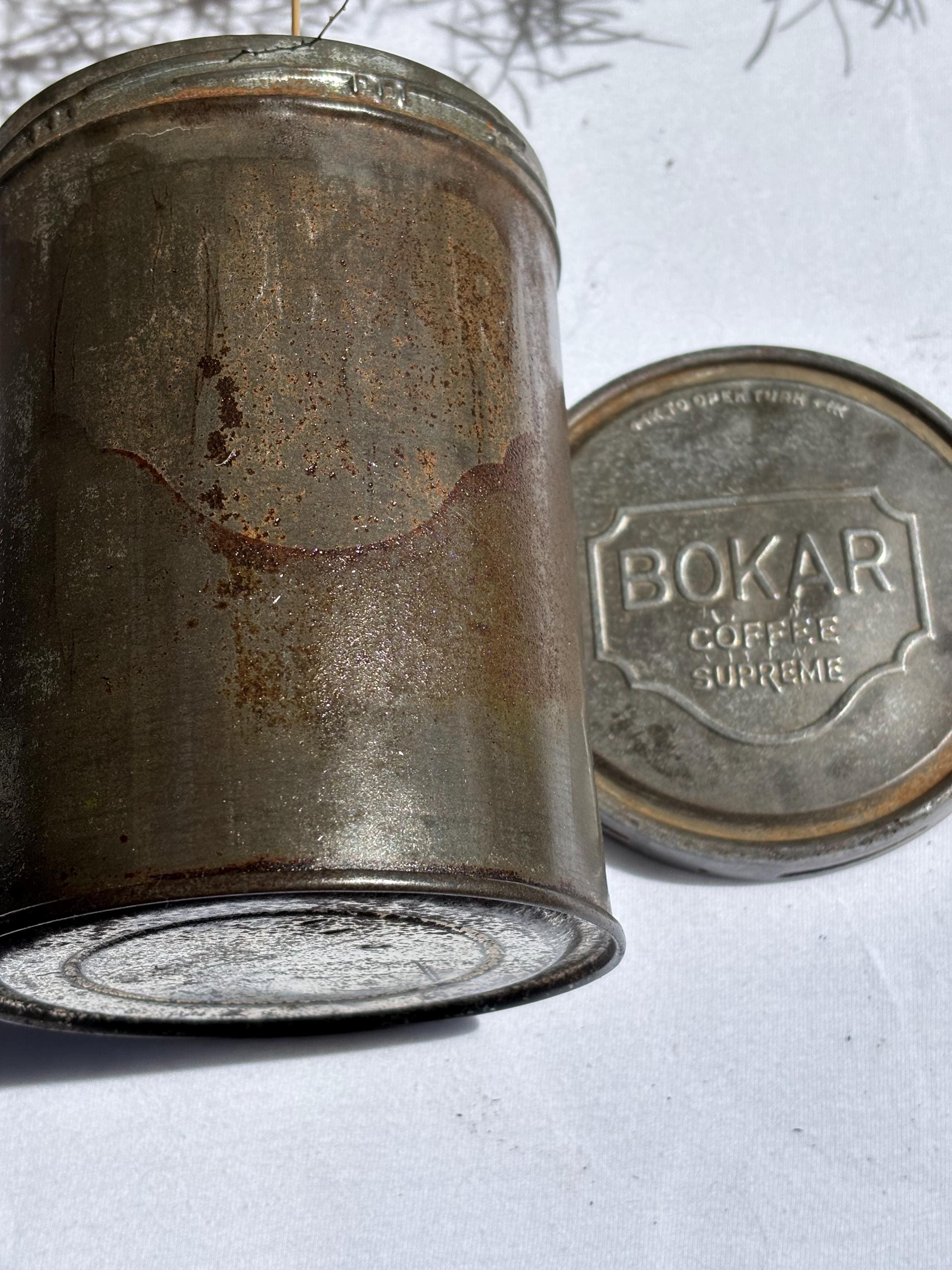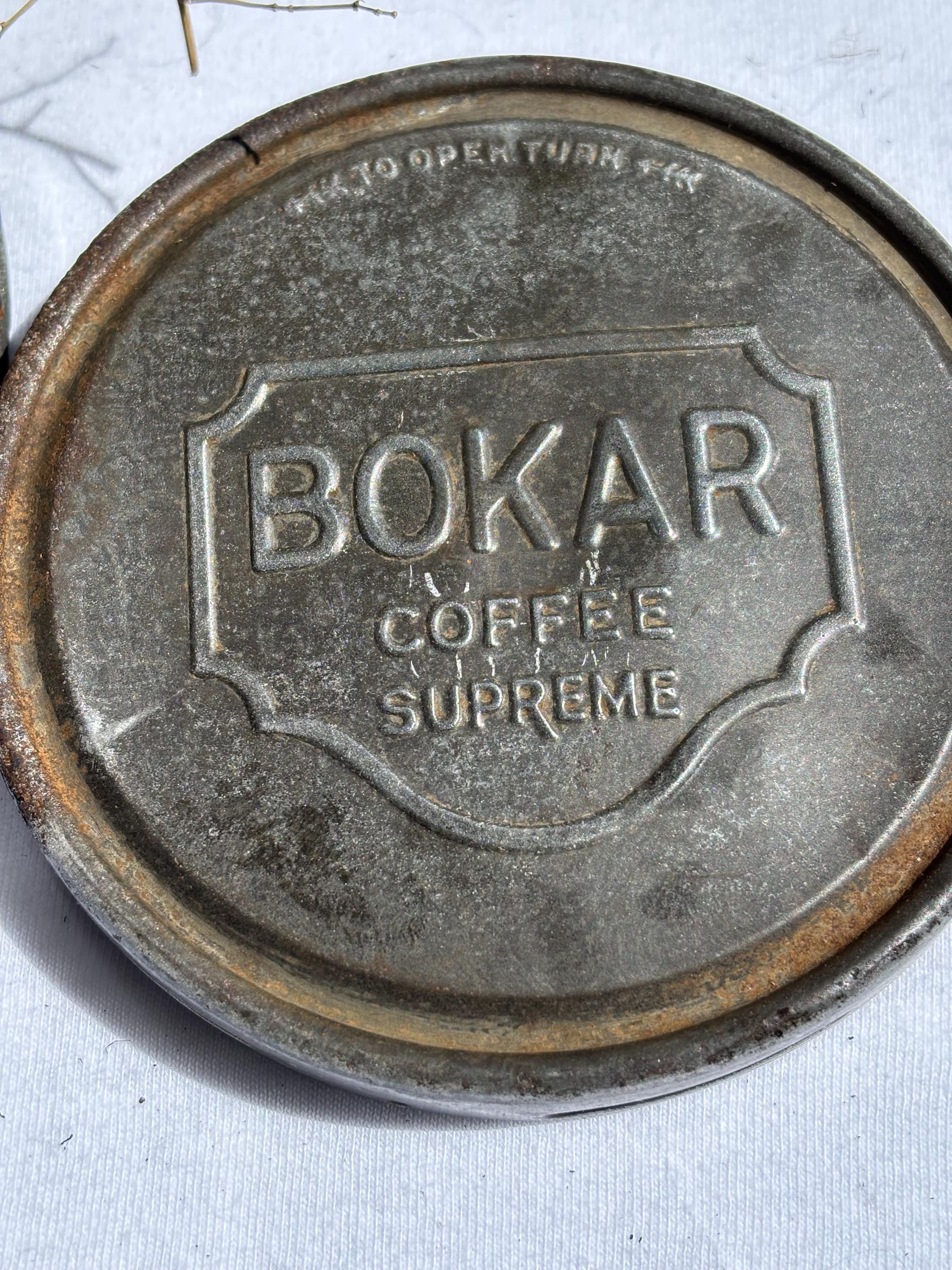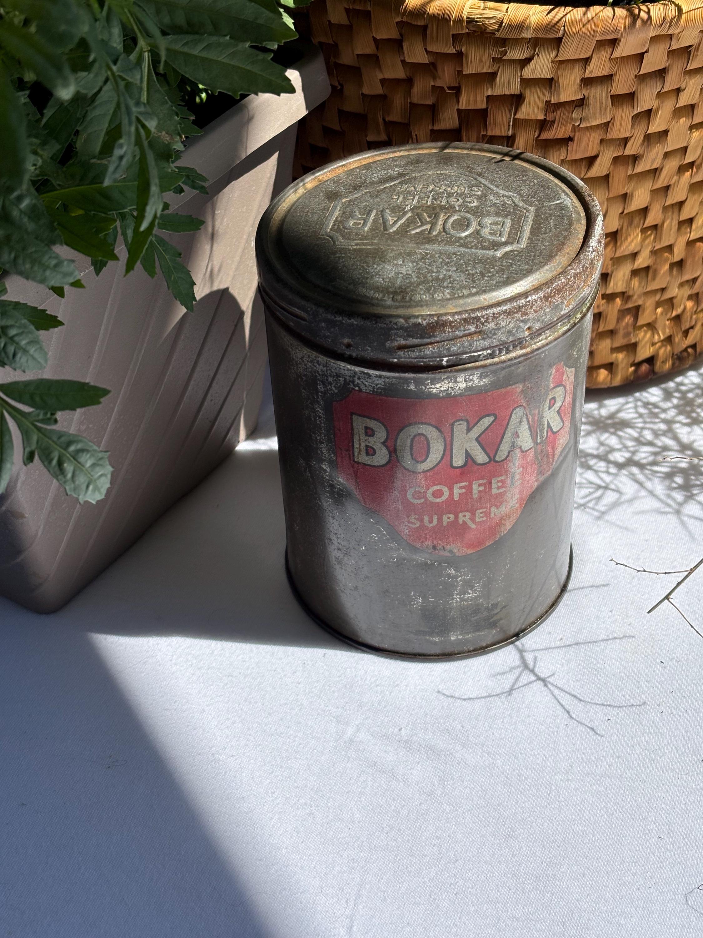Bokar Coffee Supreme 1 lb Coffee Tin measuring 5 3/4 “h by 4 1/4 “ d c1920’s Sold through A&P Grocery Stores. see photos for condition, it has been used with passion…A great piece for display or to add a splash of color. Farmhouse or country cottage compatible!