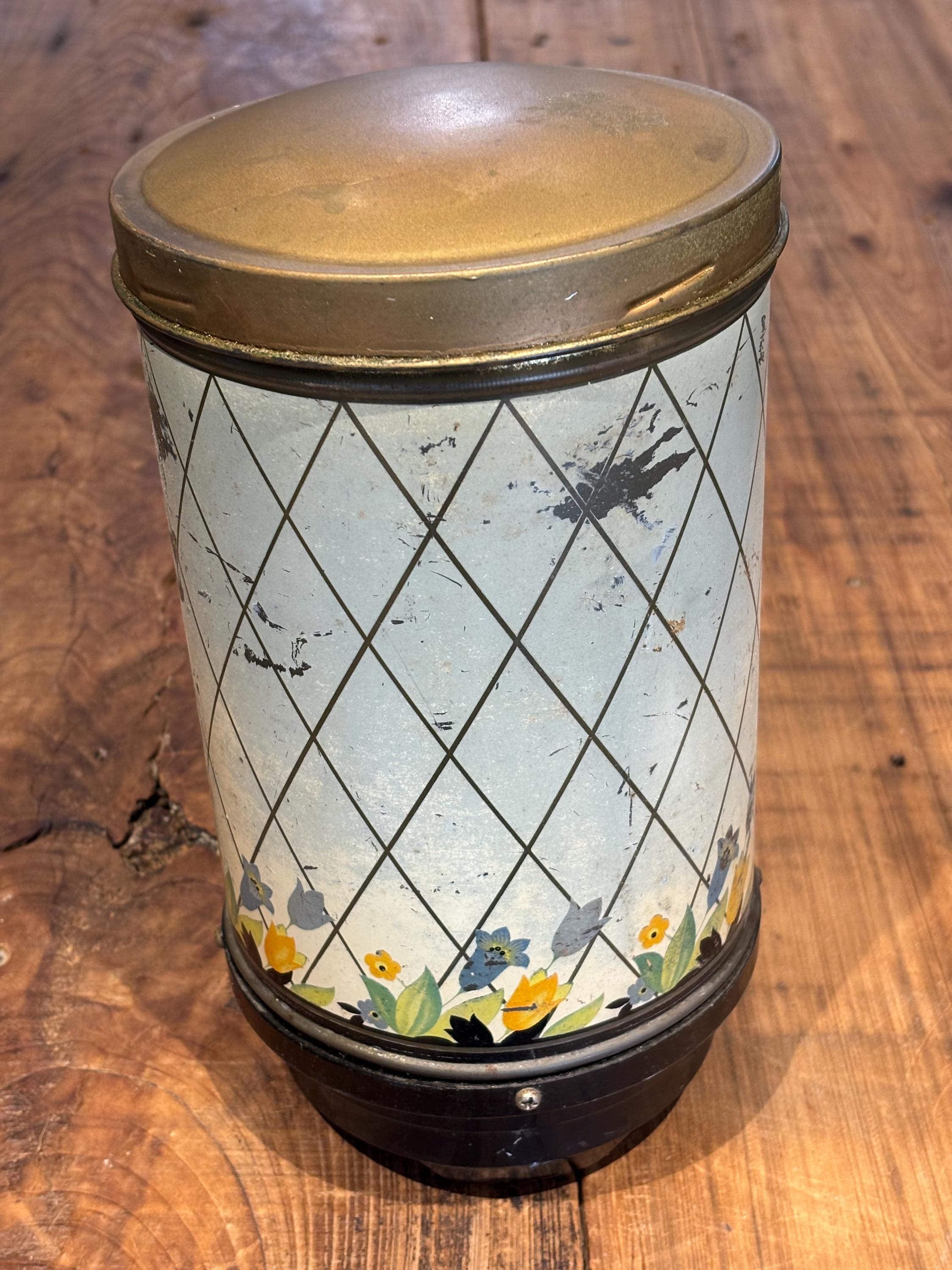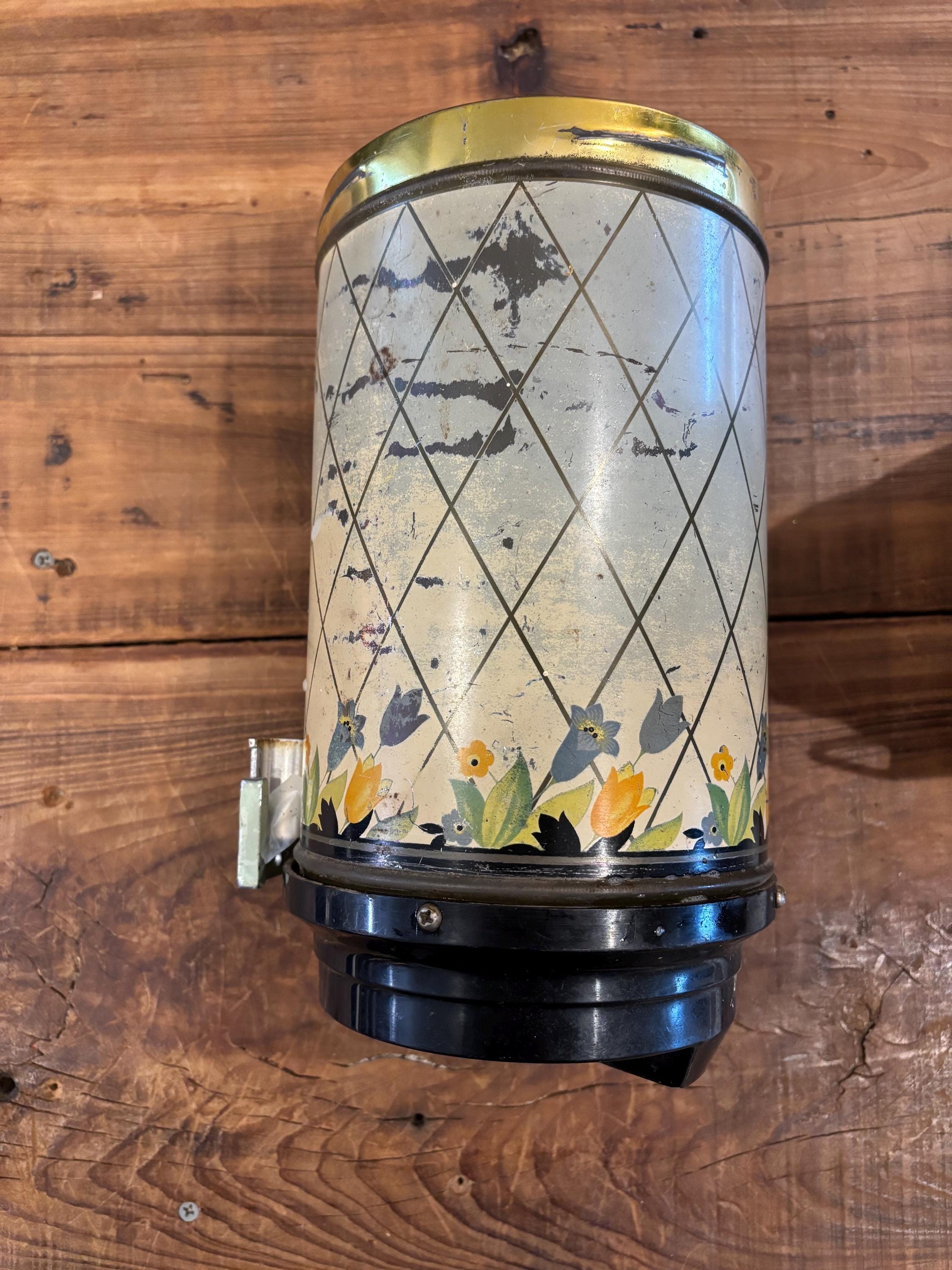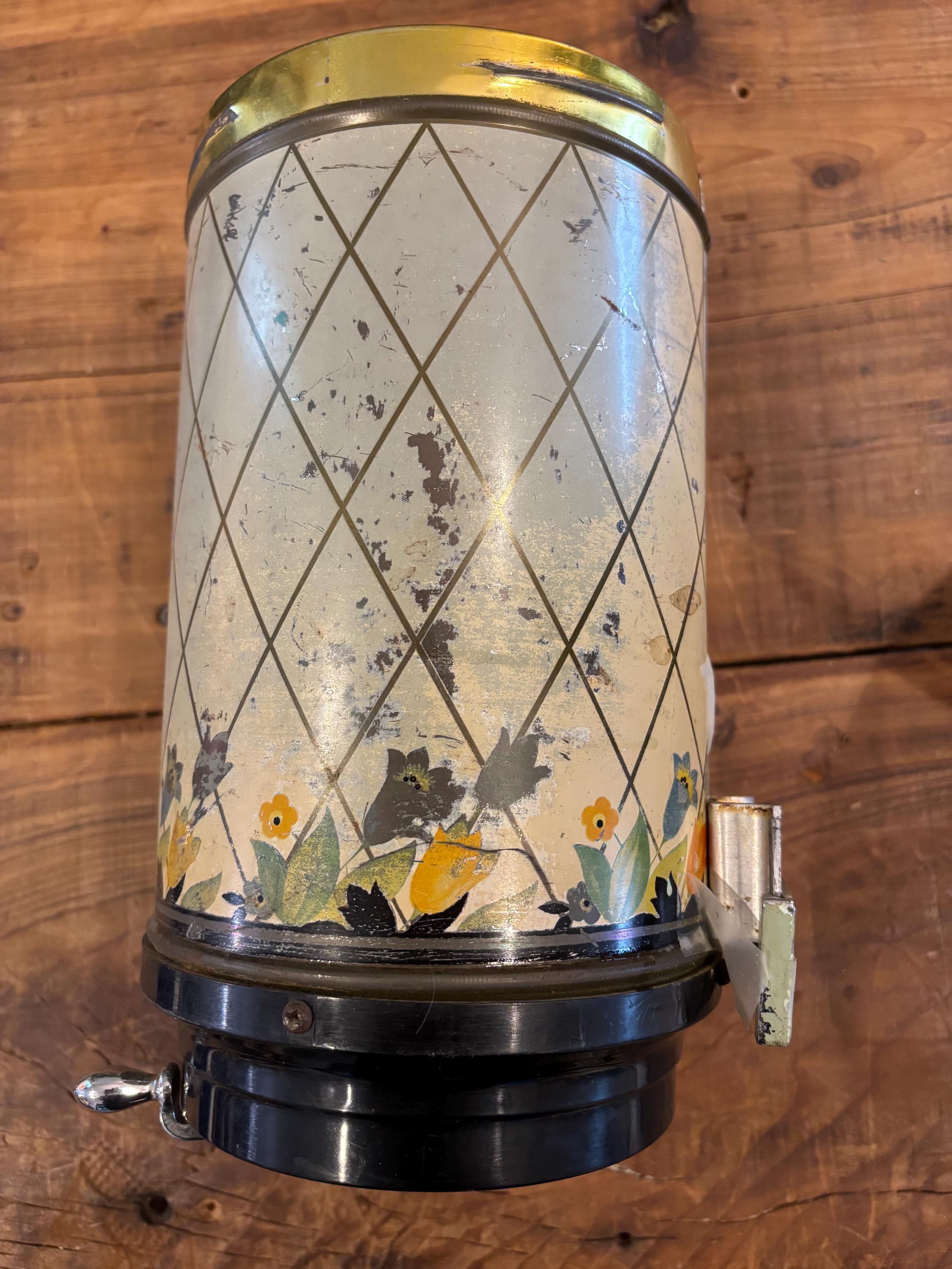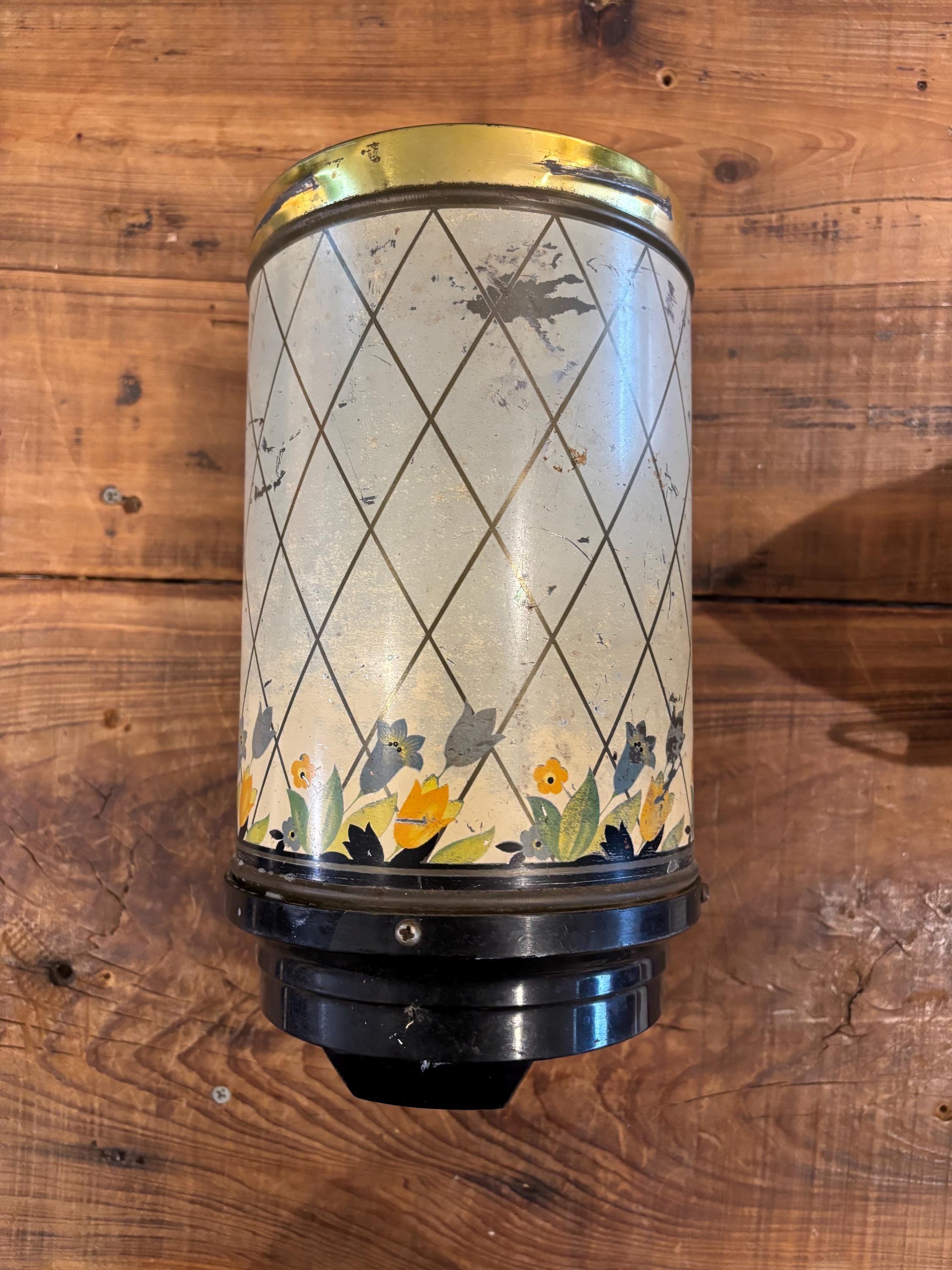 Crocus Metal Wall Mounted Coffee Dispenser, c 1930-40's often used as a companion piece with Hoosier Cabinets. Includes original mounting plates. This piece is 10" tall, 5" in diameter.