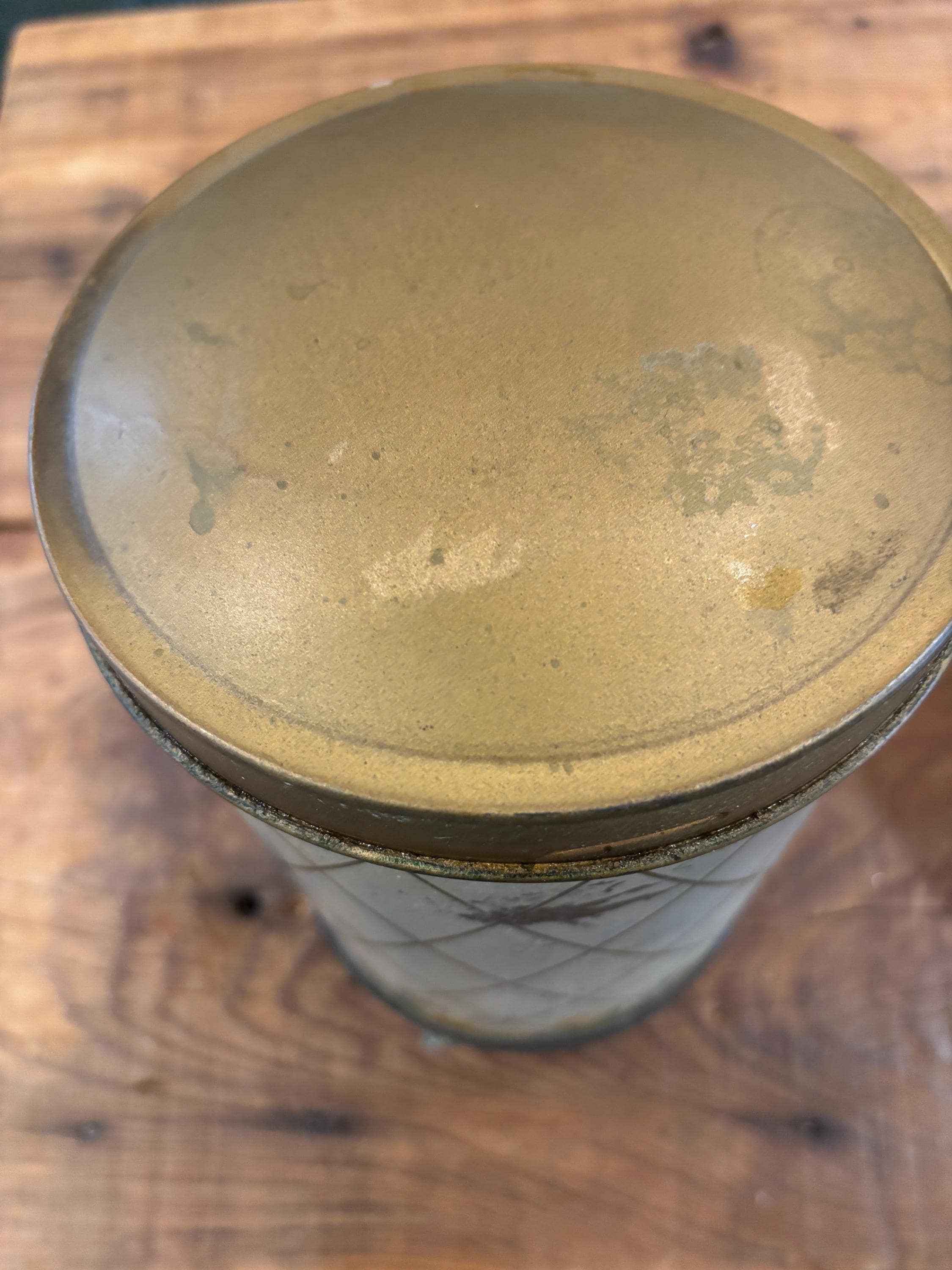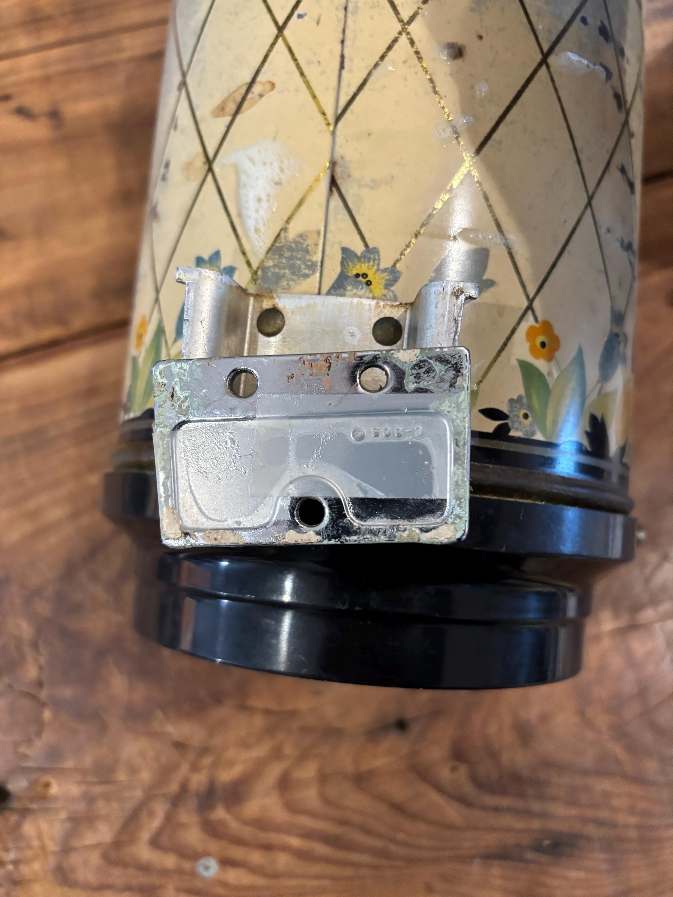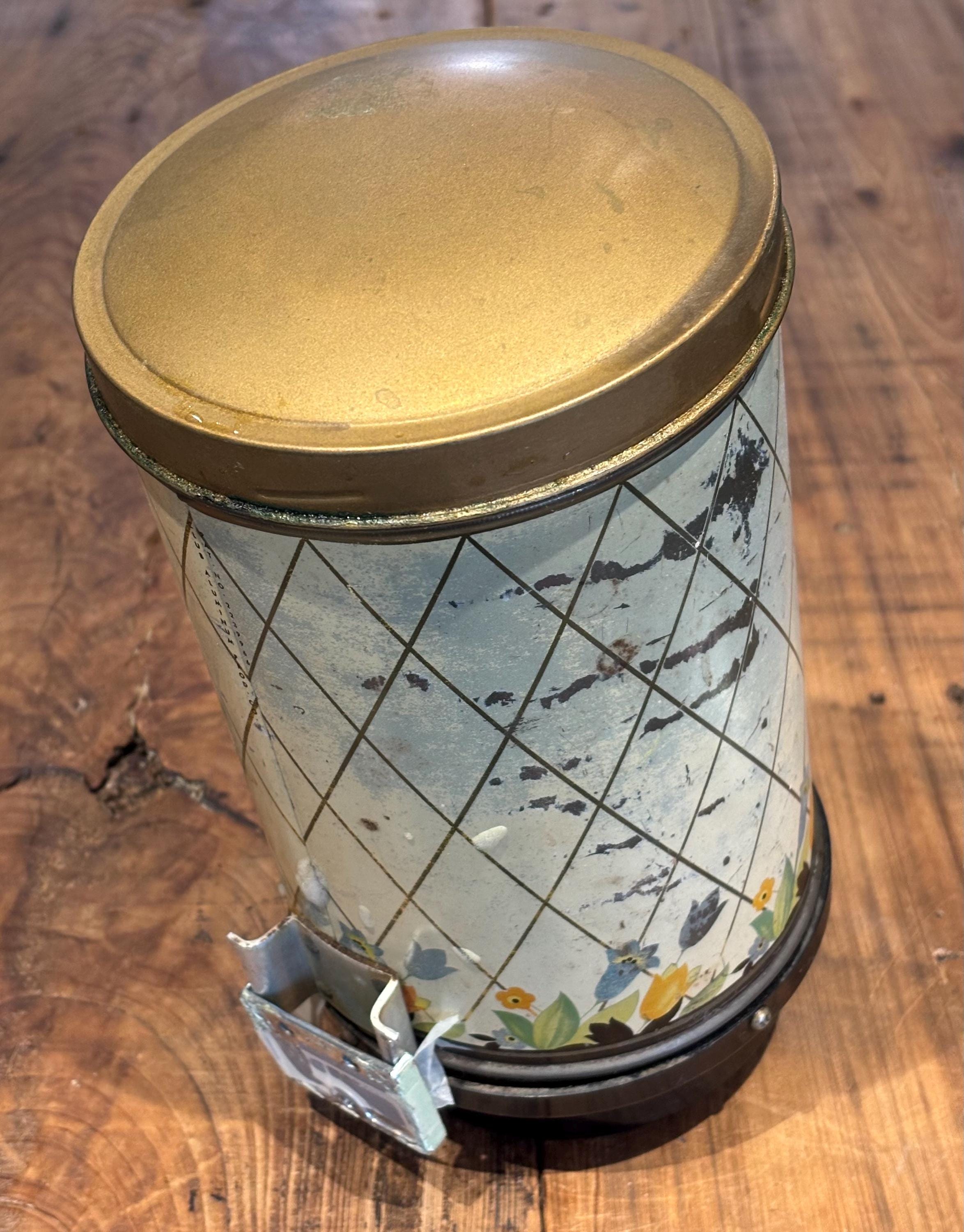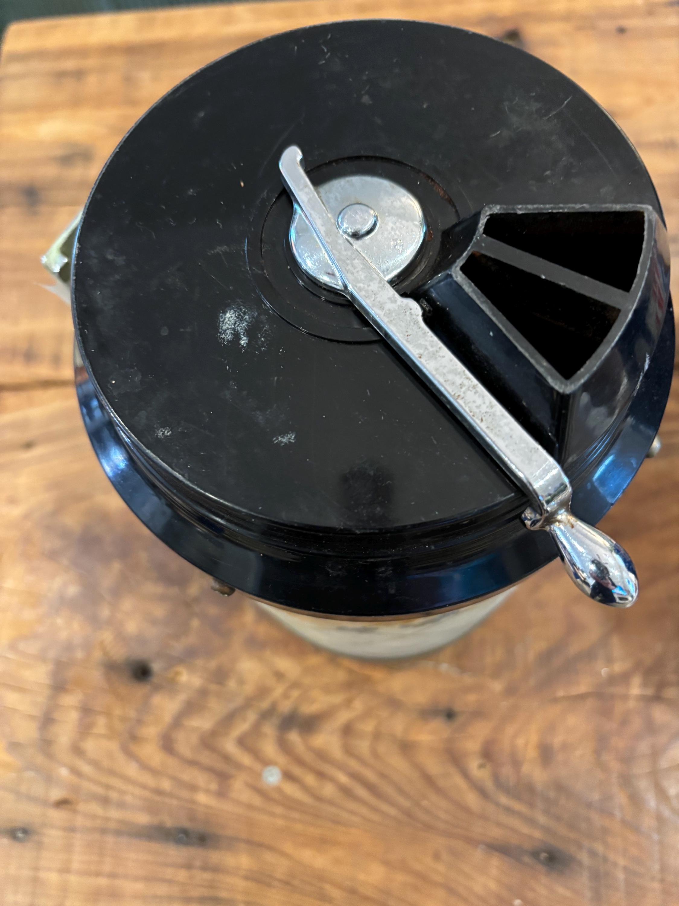Crocus Metal Wall Mounted Coffee Dispenser, c 1930-40's often used as a companion piece with Hoosier Cabinets. Includes original mounting plates. This piece is 10" tall, 5" in diameter.