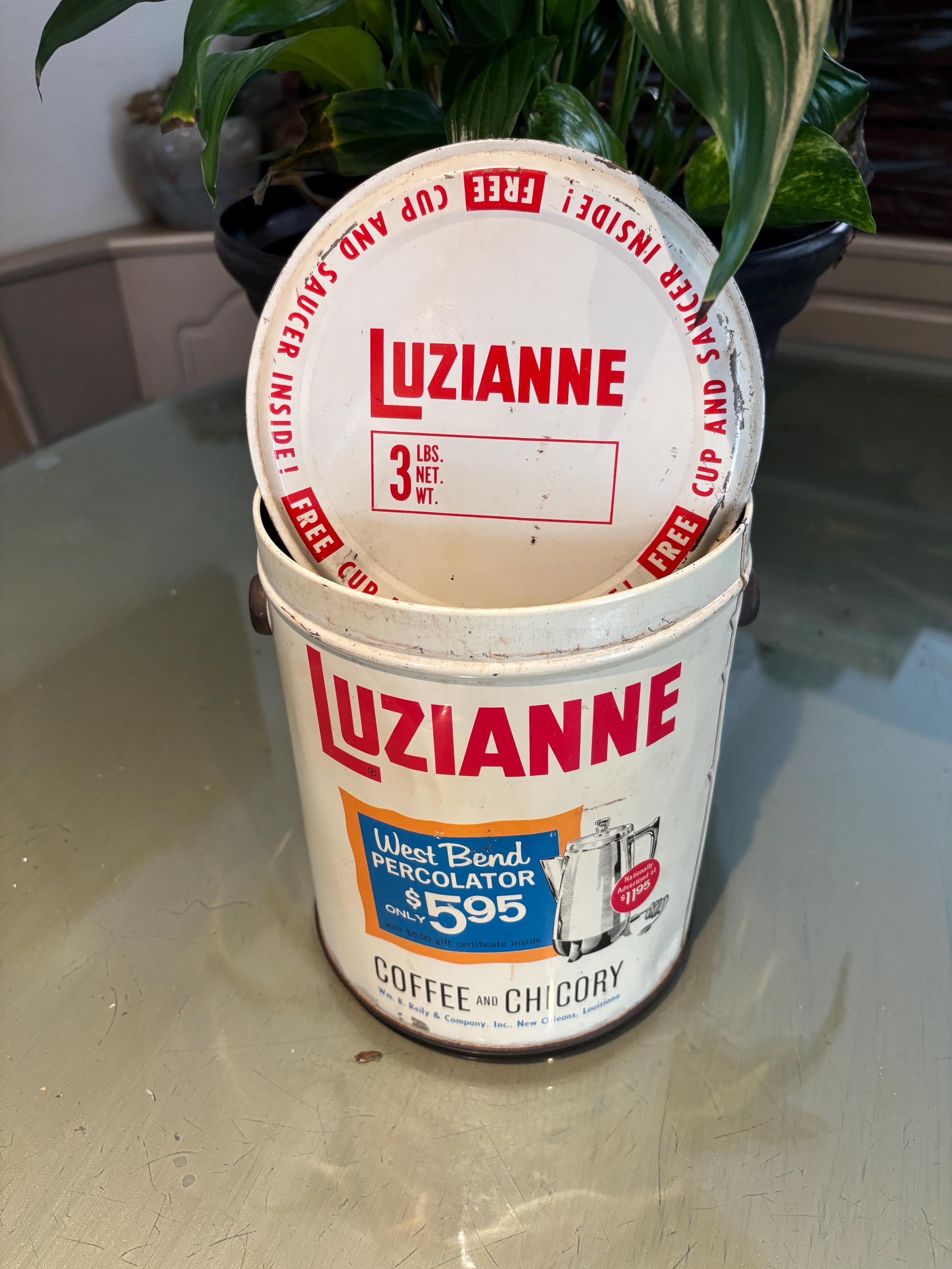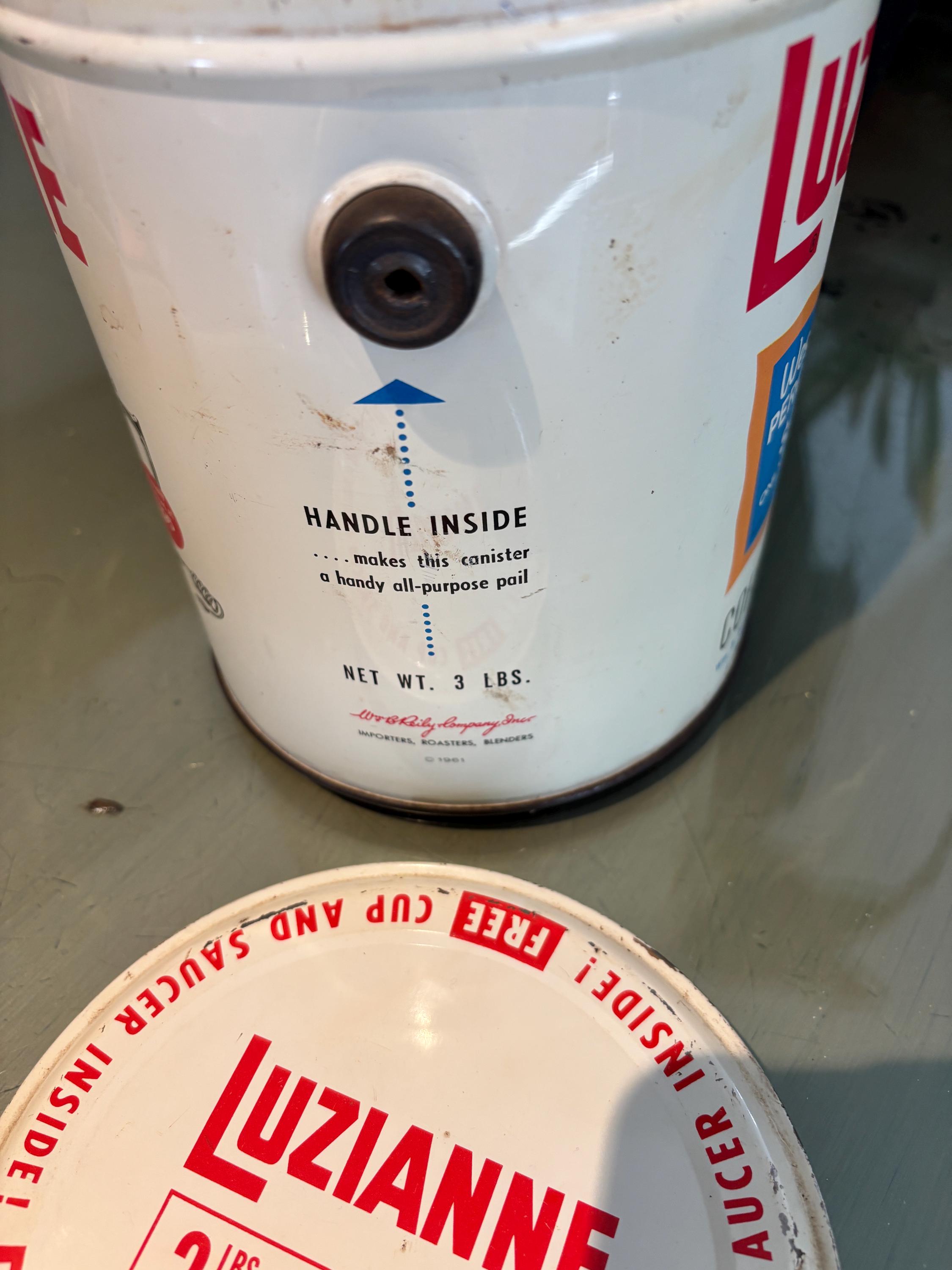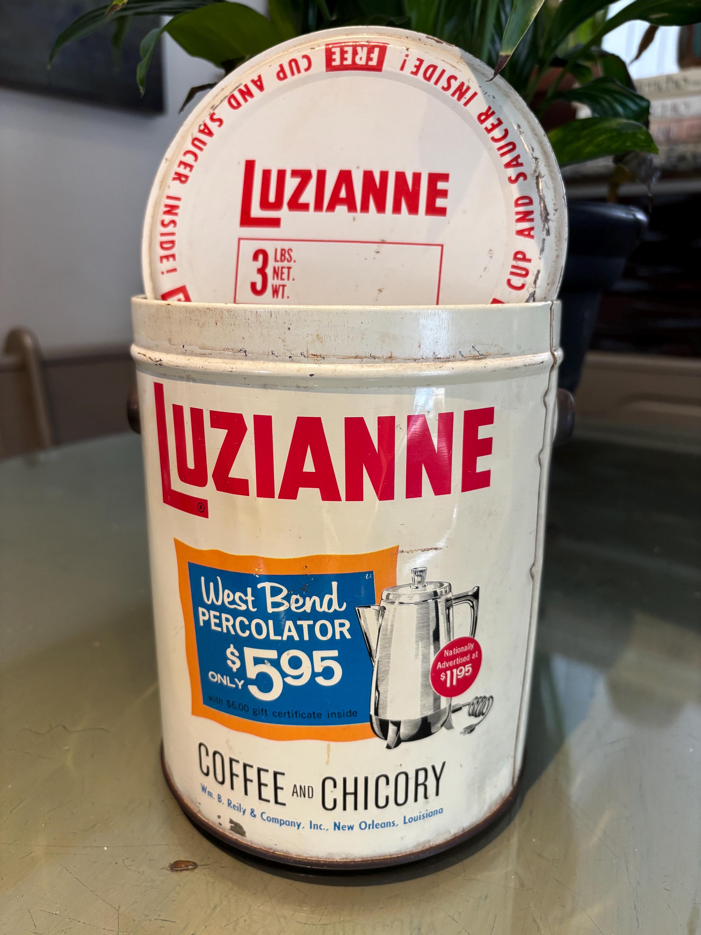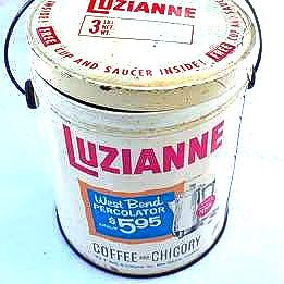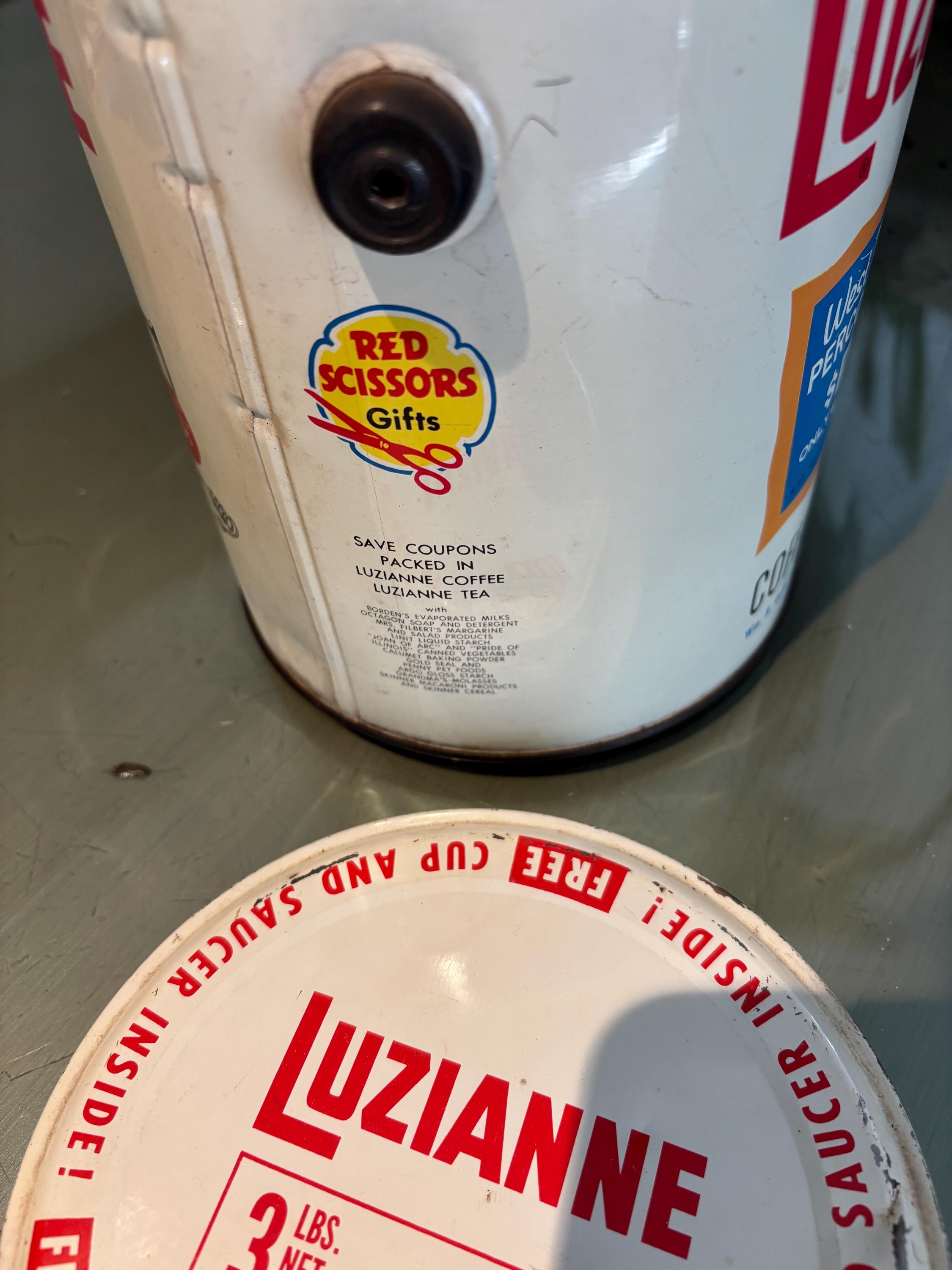 Luzianne Coffee Tin Canister 3lb White Lithographic Labeling. Logo offers West Blend Percolator and a "Blue Willow" cup and saucer (not included) C1950 Great Condition!