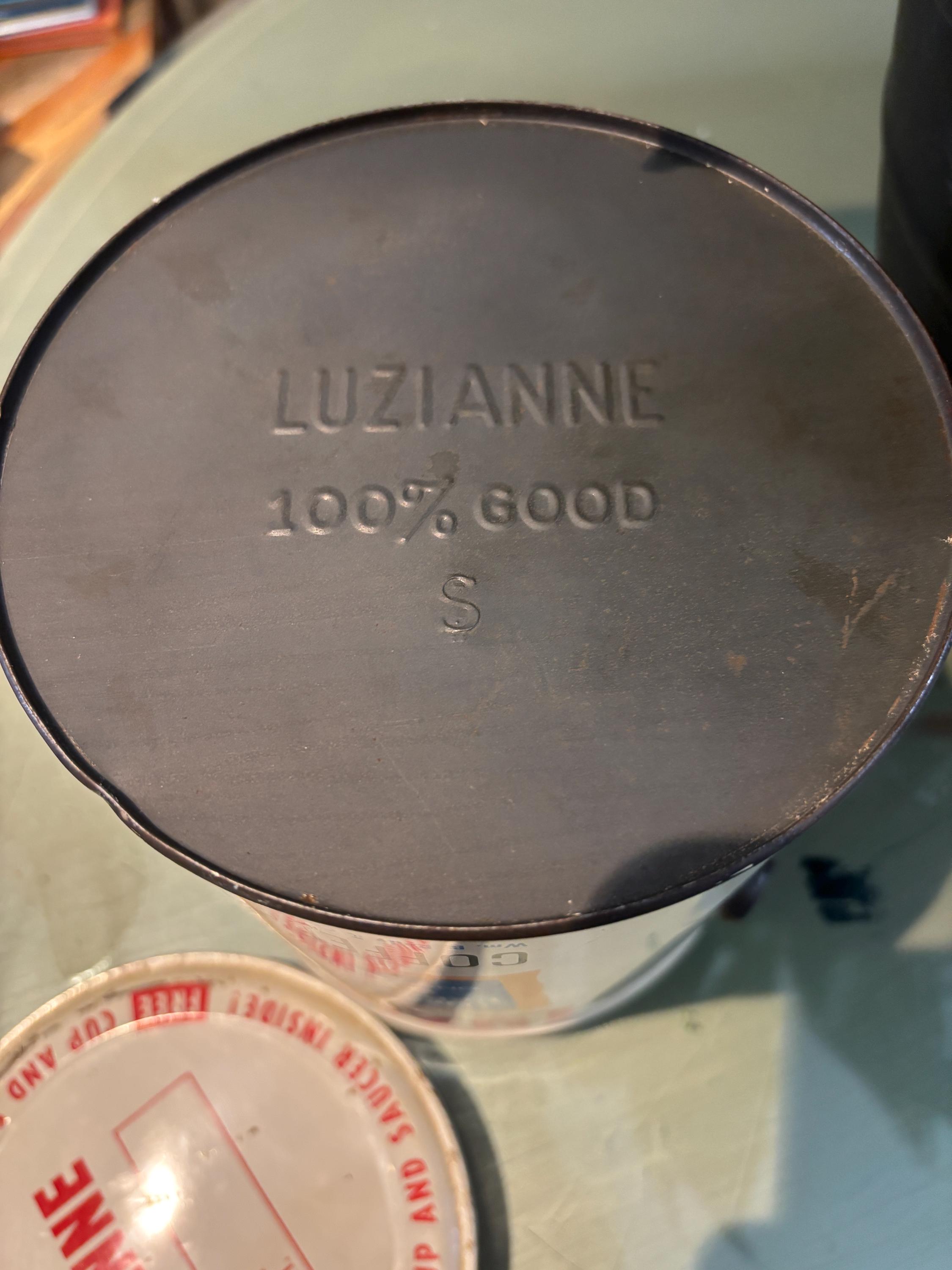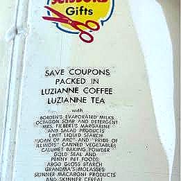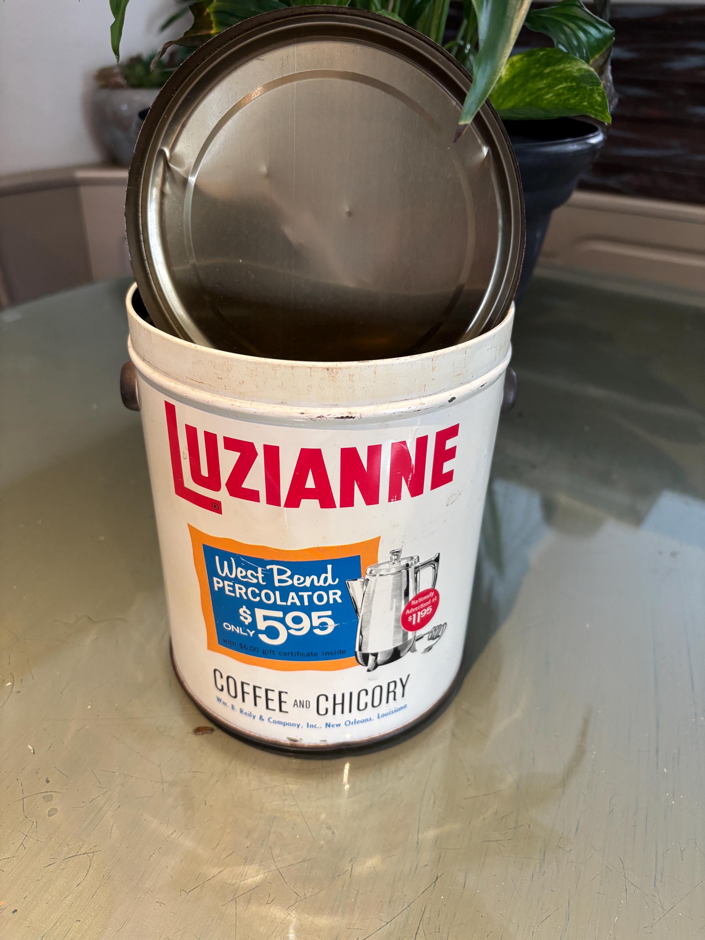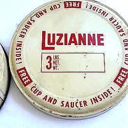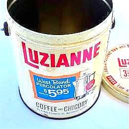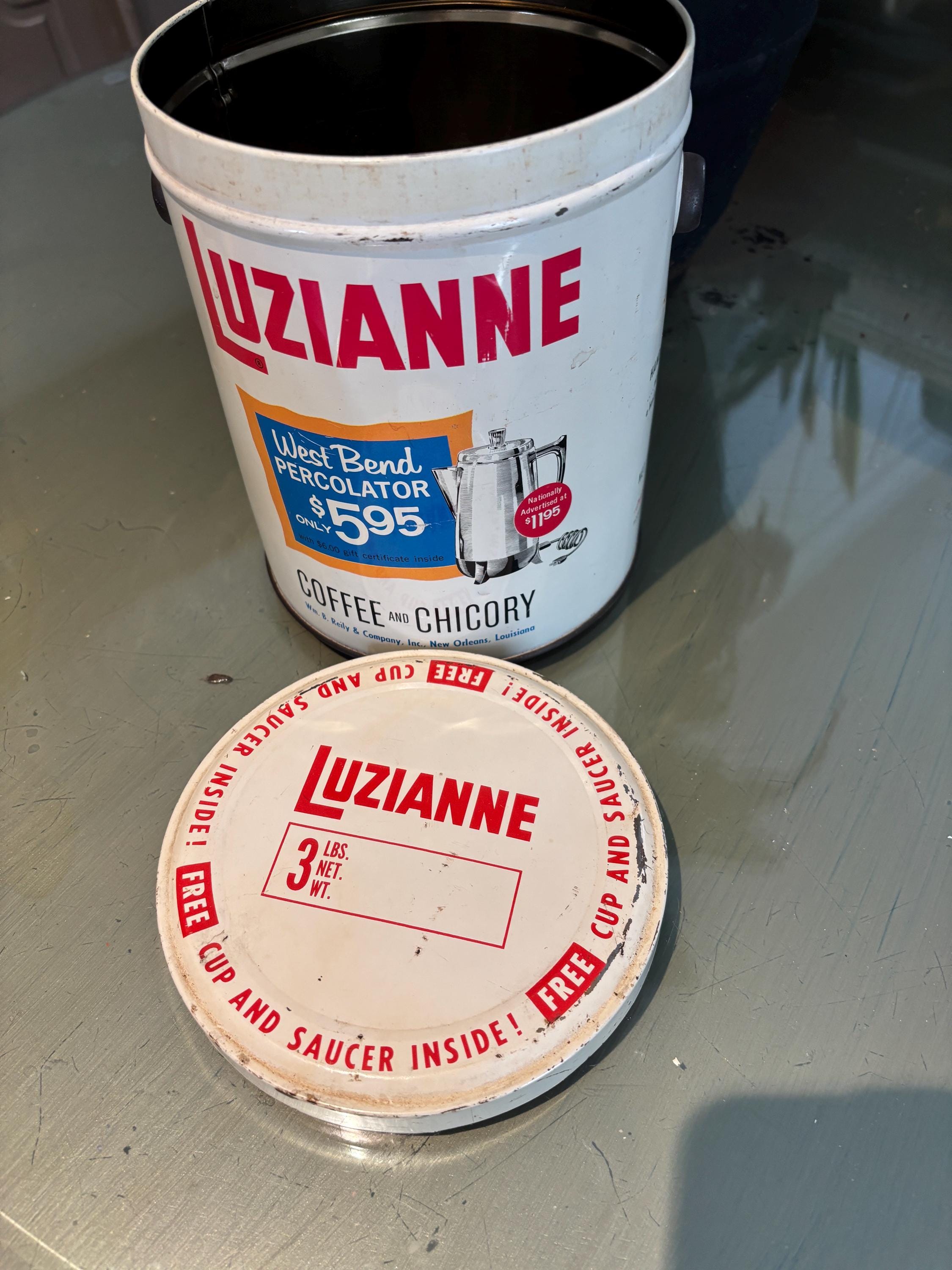 Luzianne Coffee Tin Canister 3lb White Lithographic Labeling. Logo offers West Blend Percolator and a "Blue Willow" cup and saucer (not included) C1950 Great Condition!