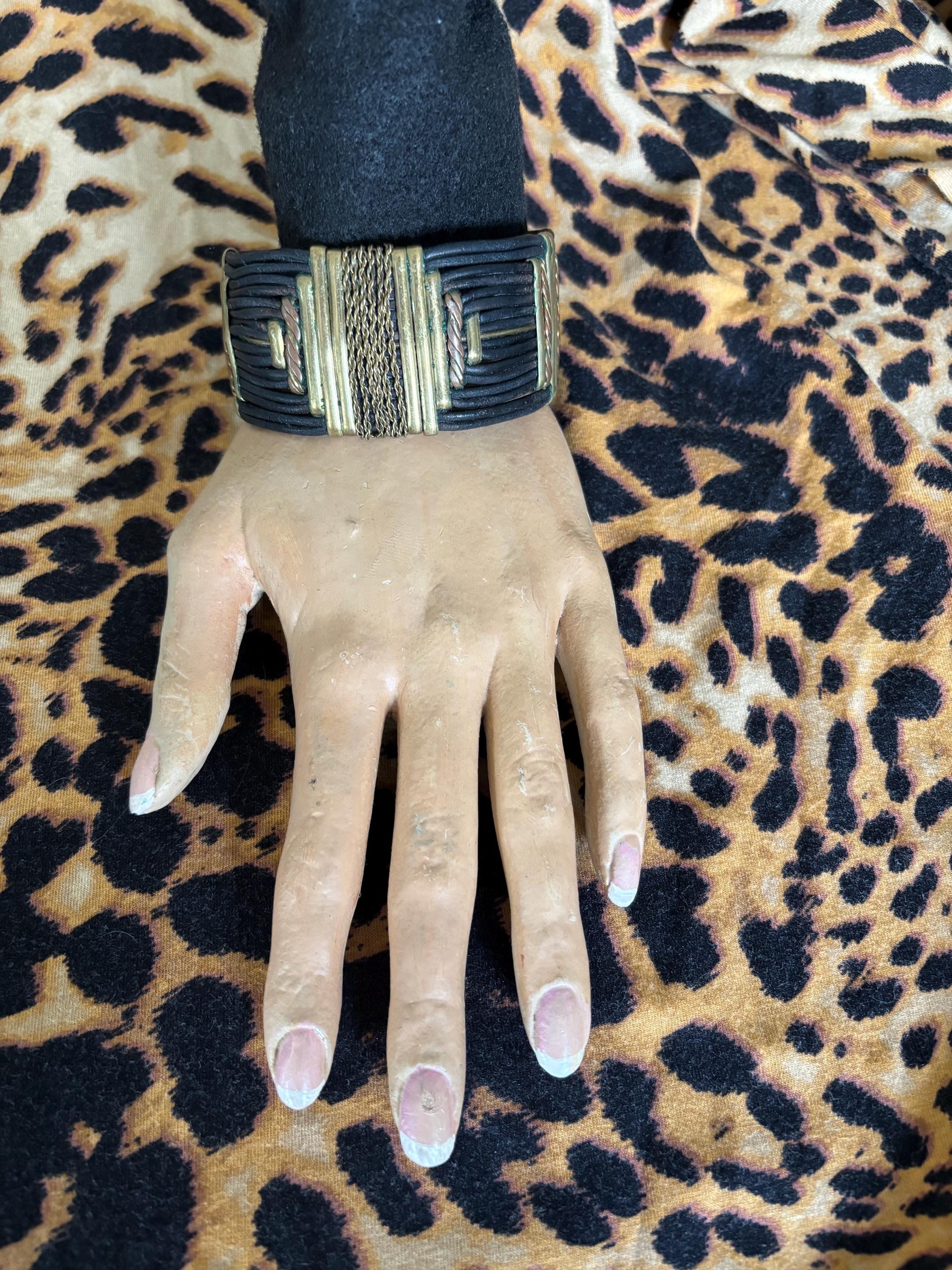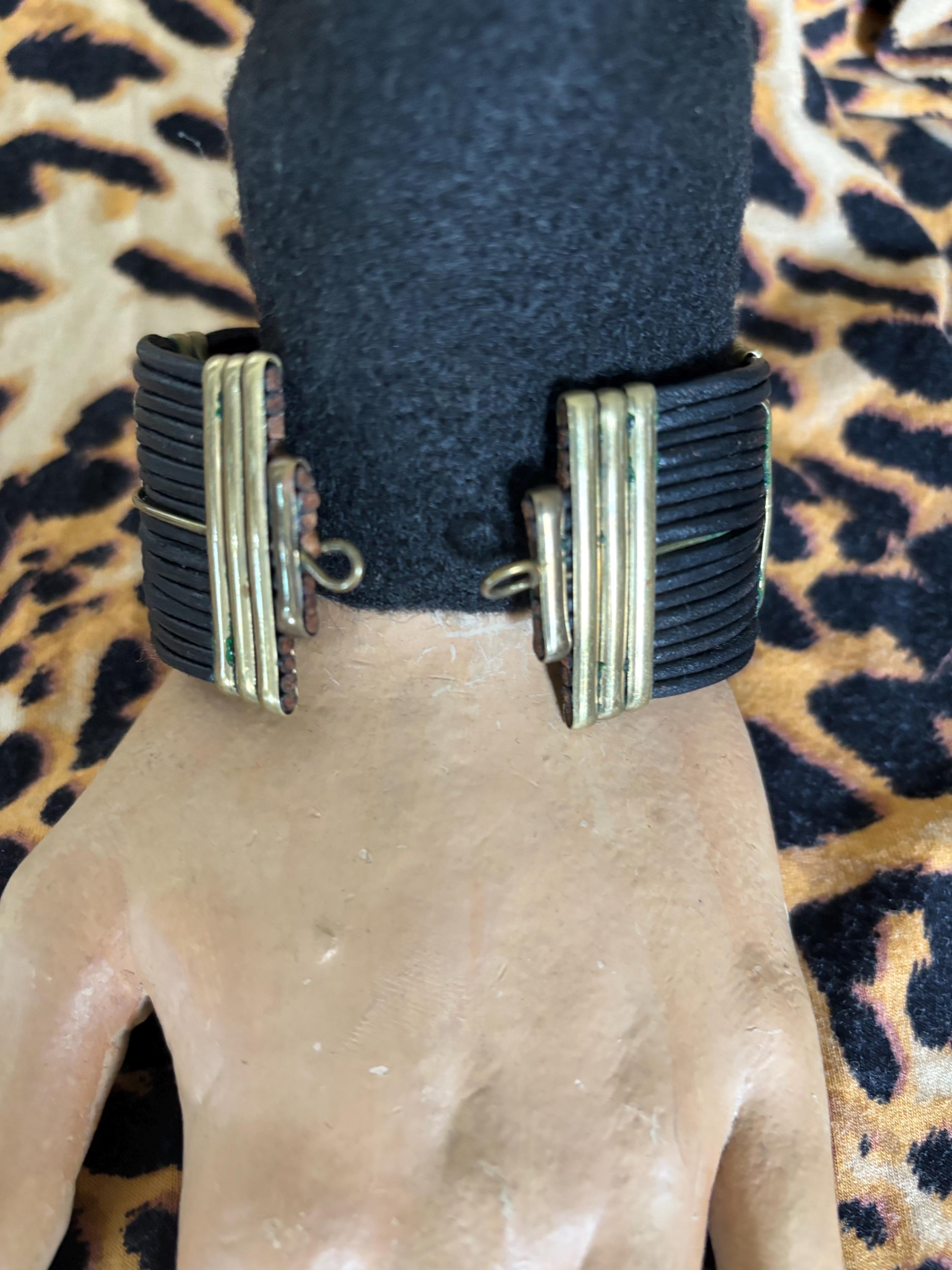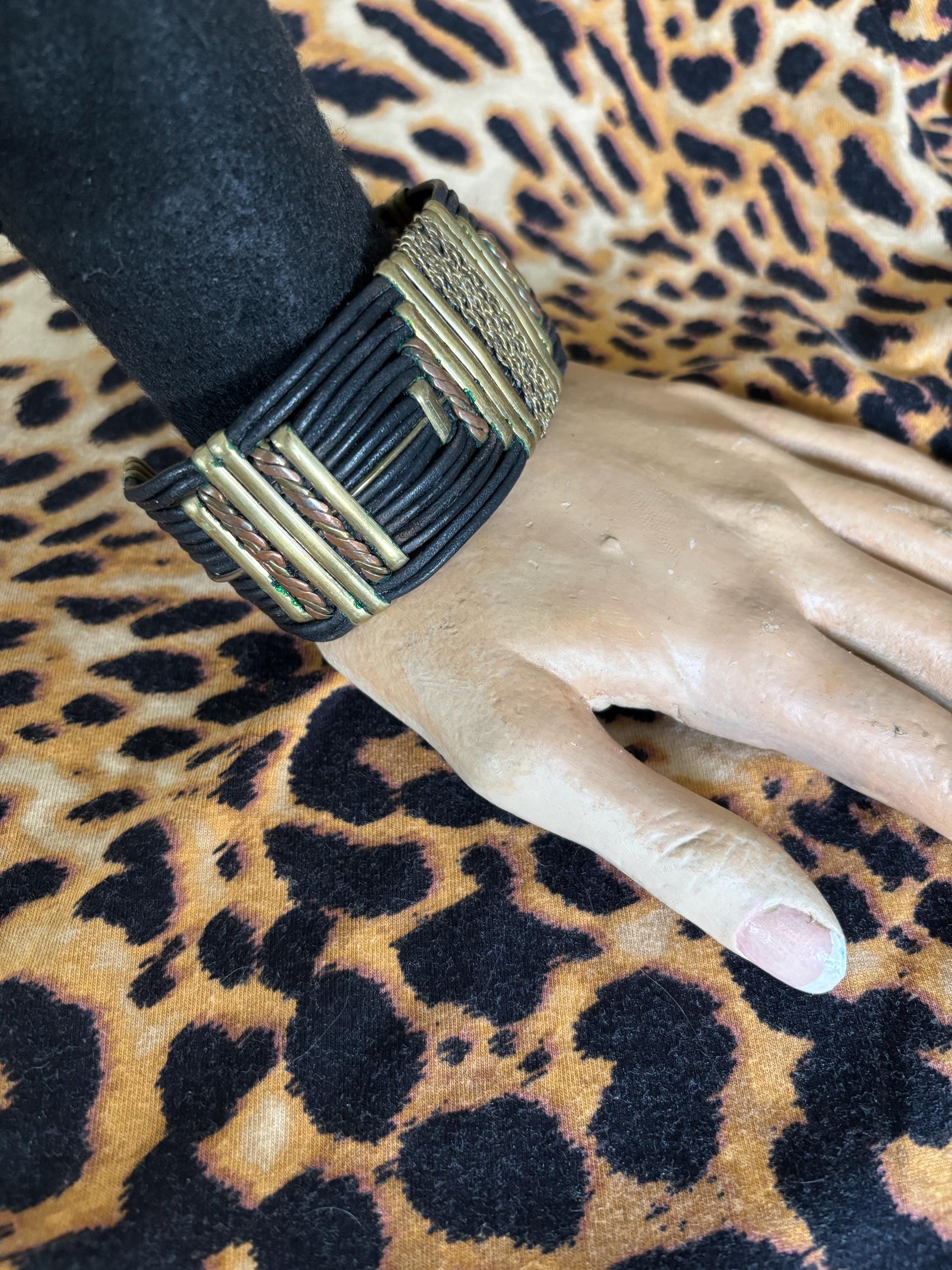 Leather cuff with brass and copper accents Offering this beautiful vintage Bohemian, Egyptian influenced cuff style bracelet in worn leather, copper and brass, by designer Alexis Kirk. Pre-loved with care, the bracelet measures 8” in circumference and is 1.5” wide, with a “c” hook closure.