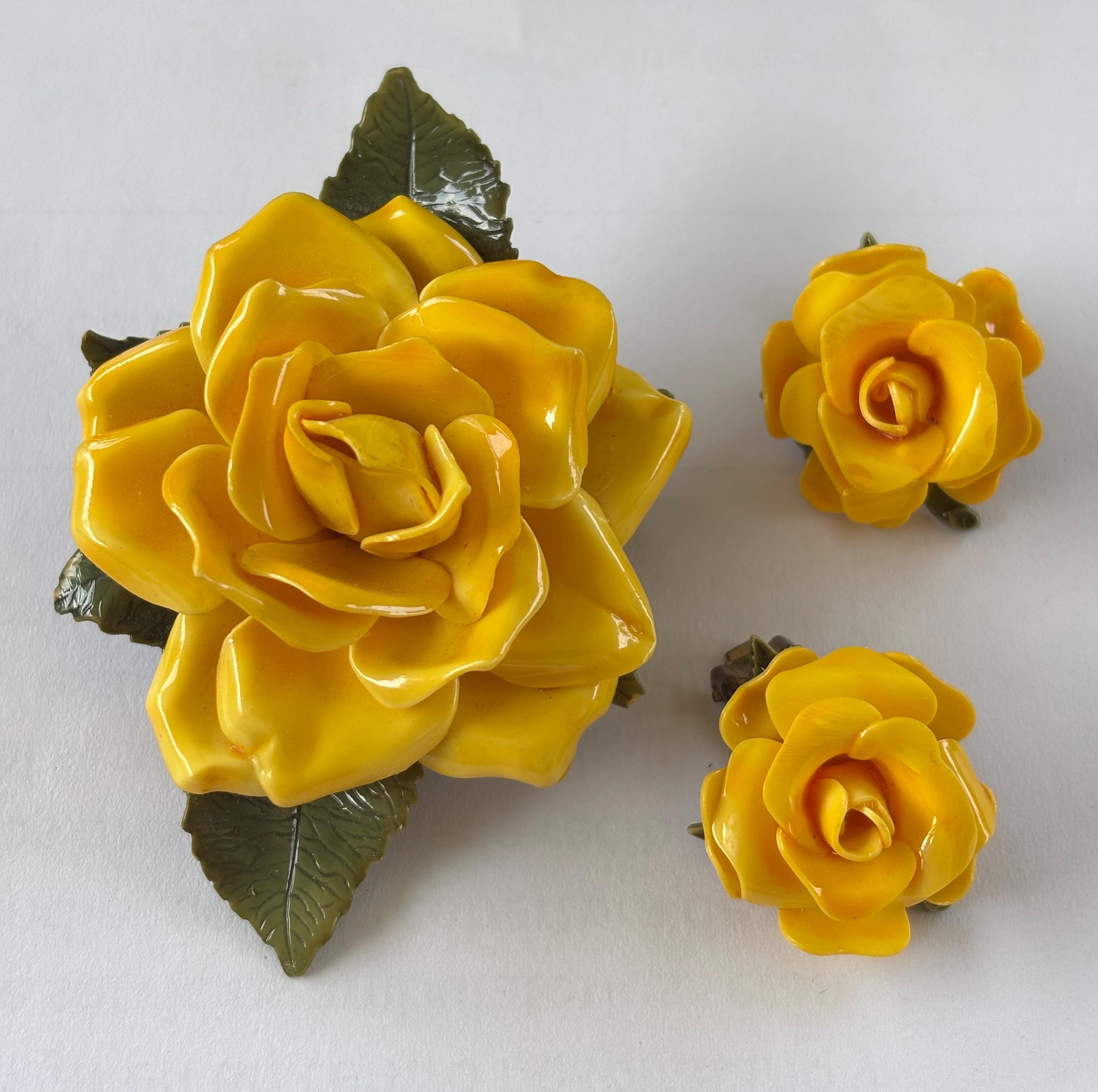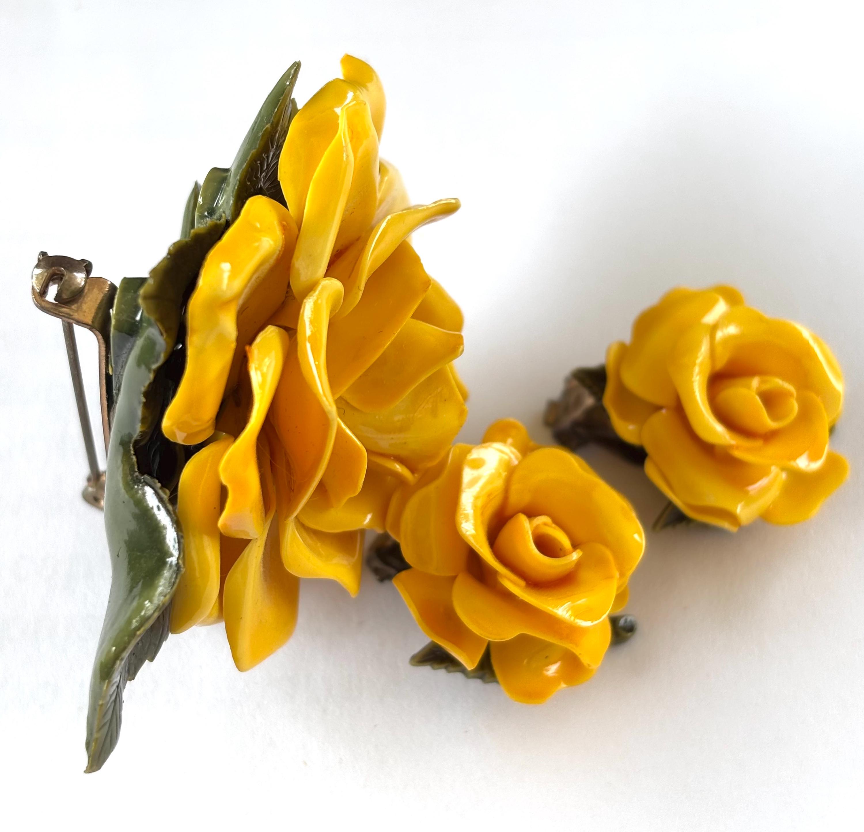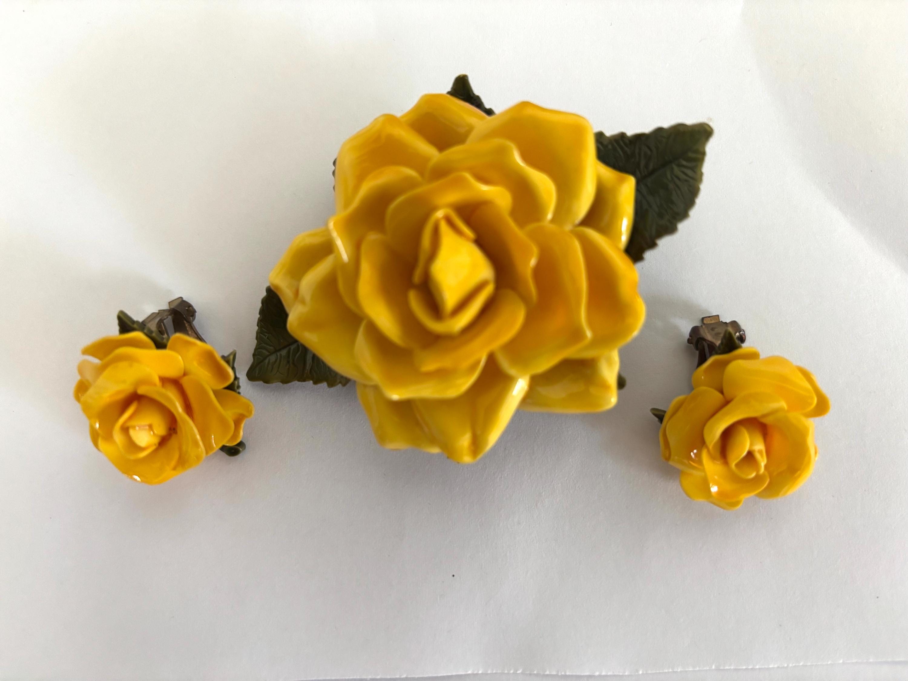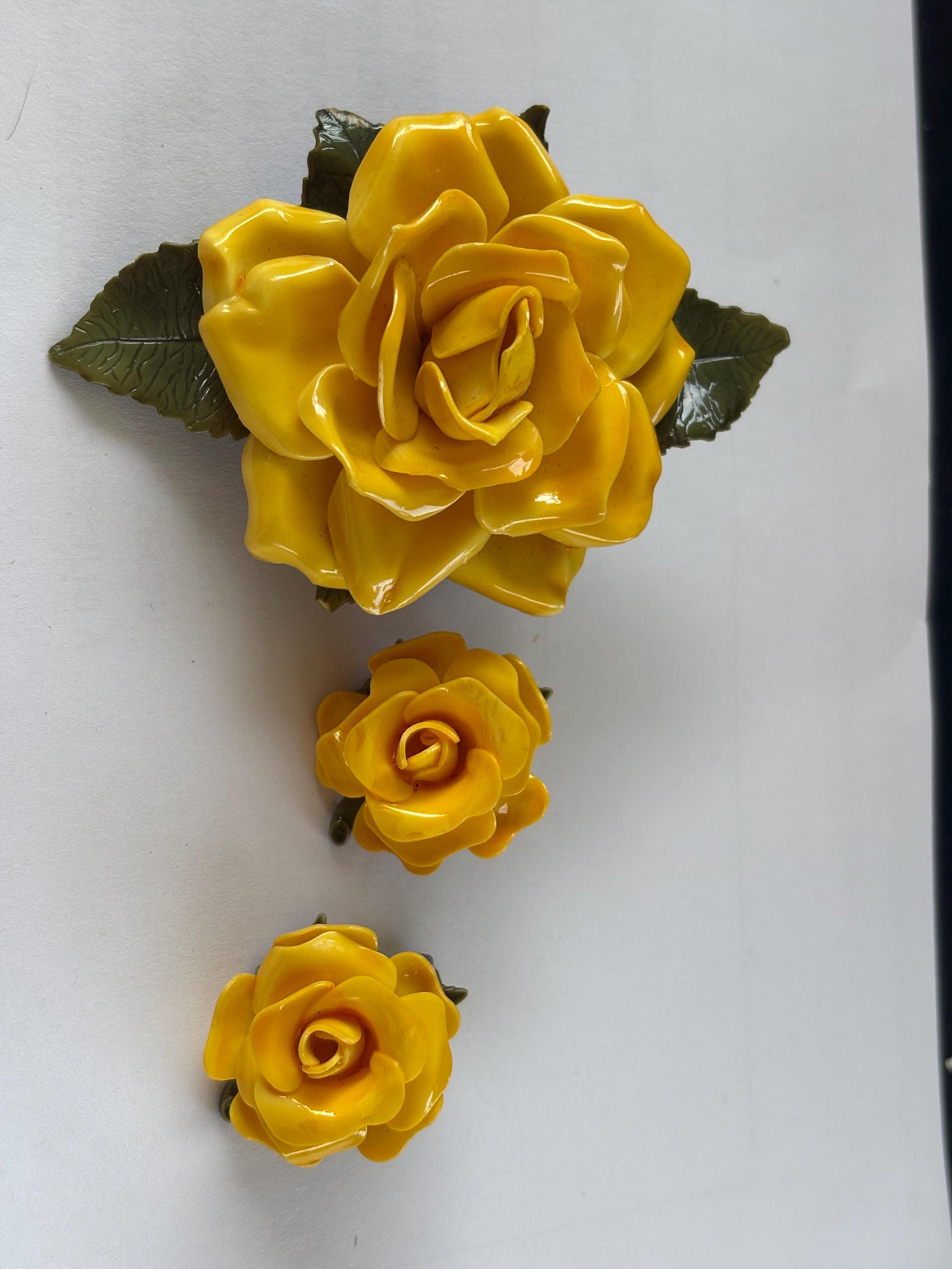 Pleased to offer this unsigned, beautifully executed Yellow Rose celluloid brooch with matching earrings. The brooch measures 3”H x 2” W and the earrings are 1” wide. Simple, elegant and classy the yellow rose, in modern contexts, symbolizes joy, happiness, and friendship, making it a suitable gift for friends, family, and colleagues to convey warmth and appreciation. Excellent condition and an unusual statement piece to accent your attire.