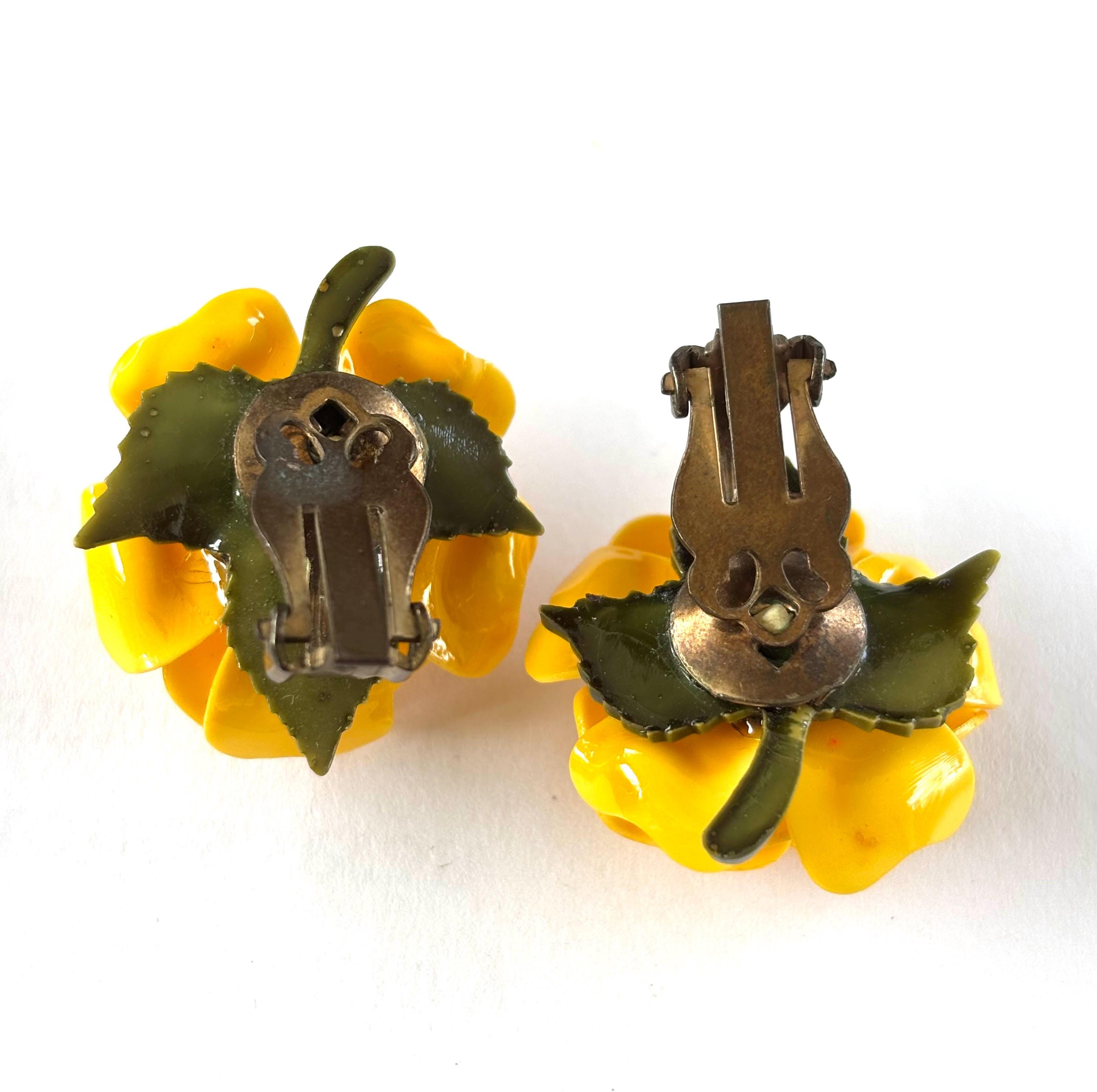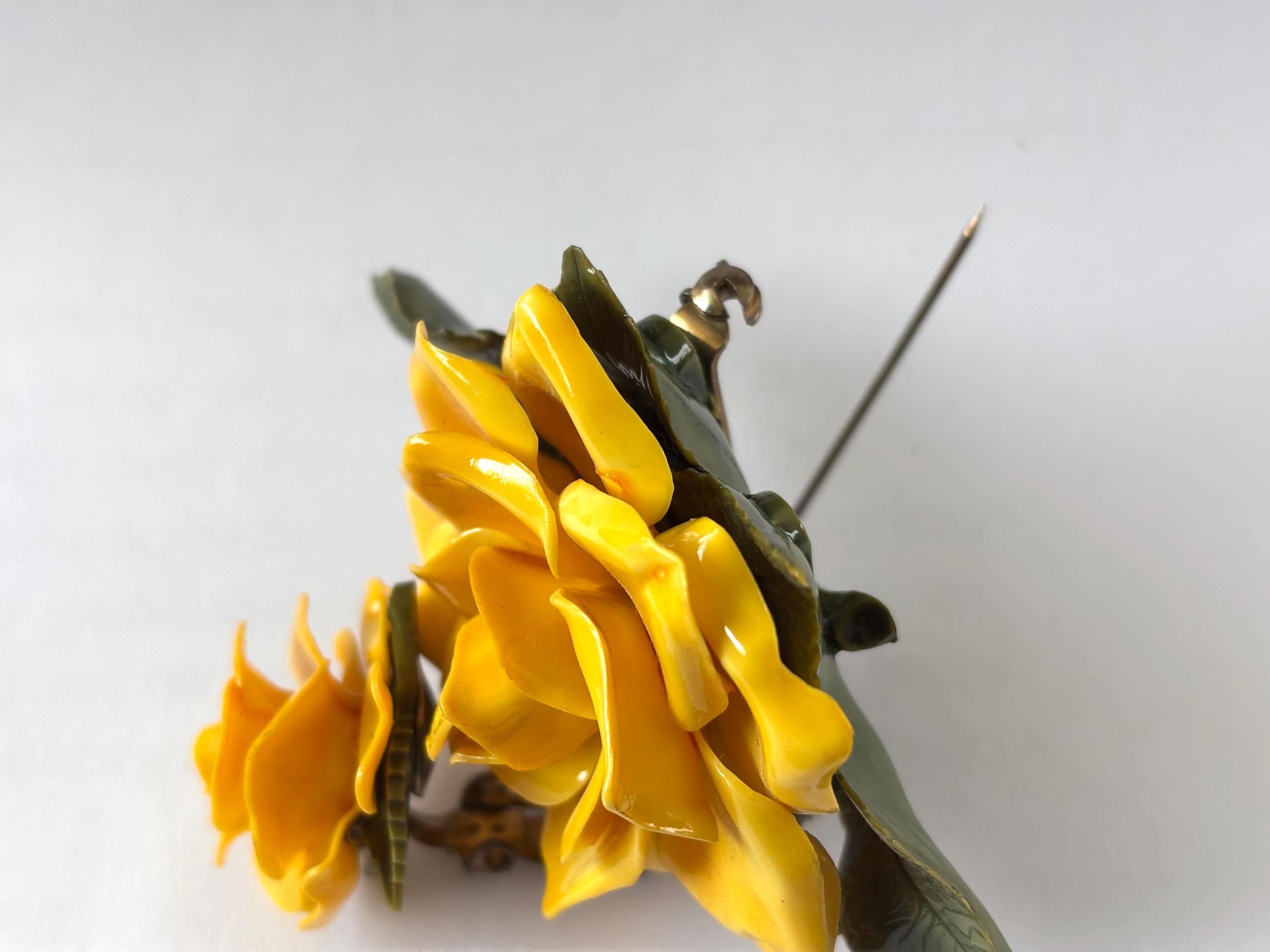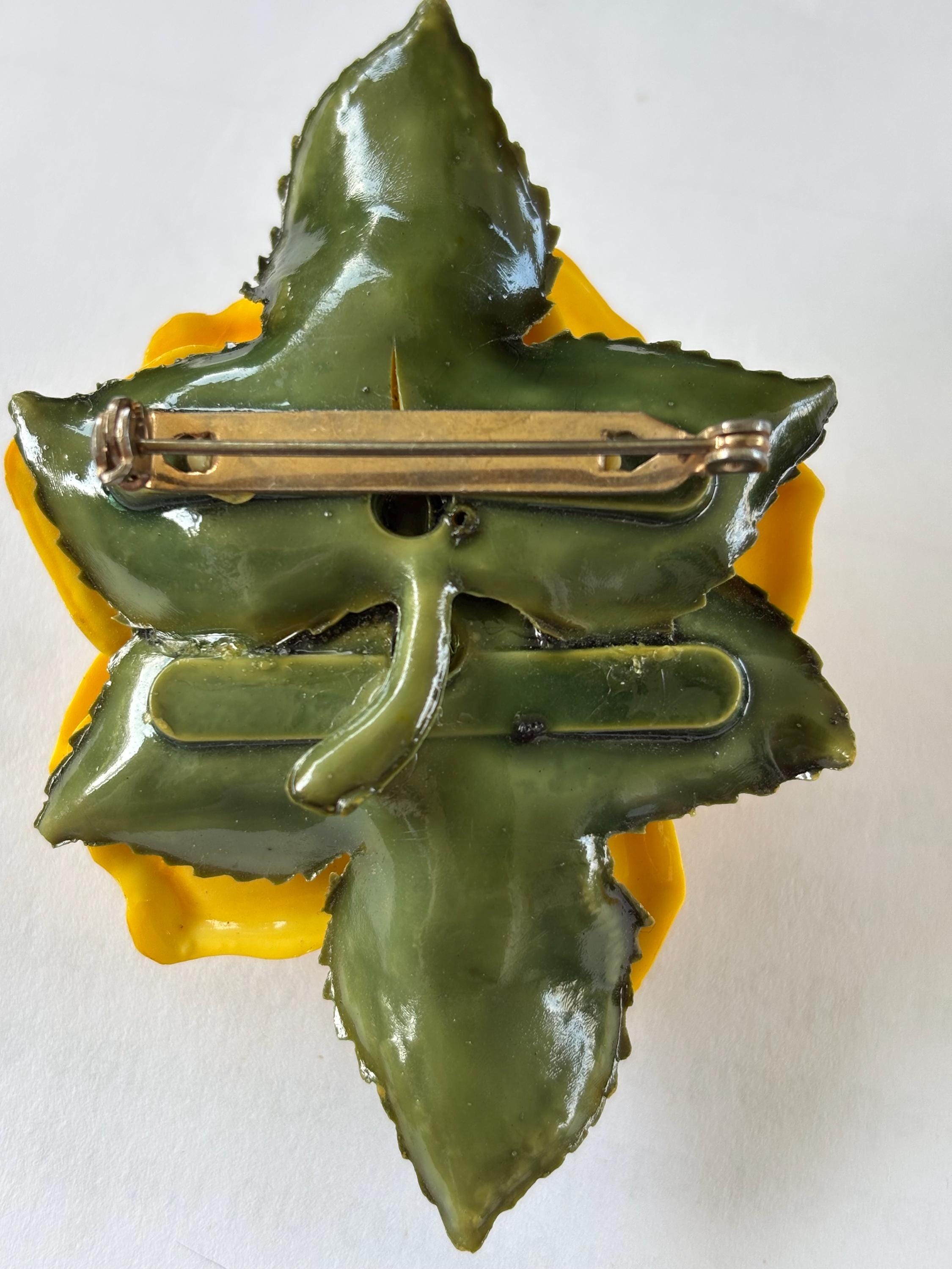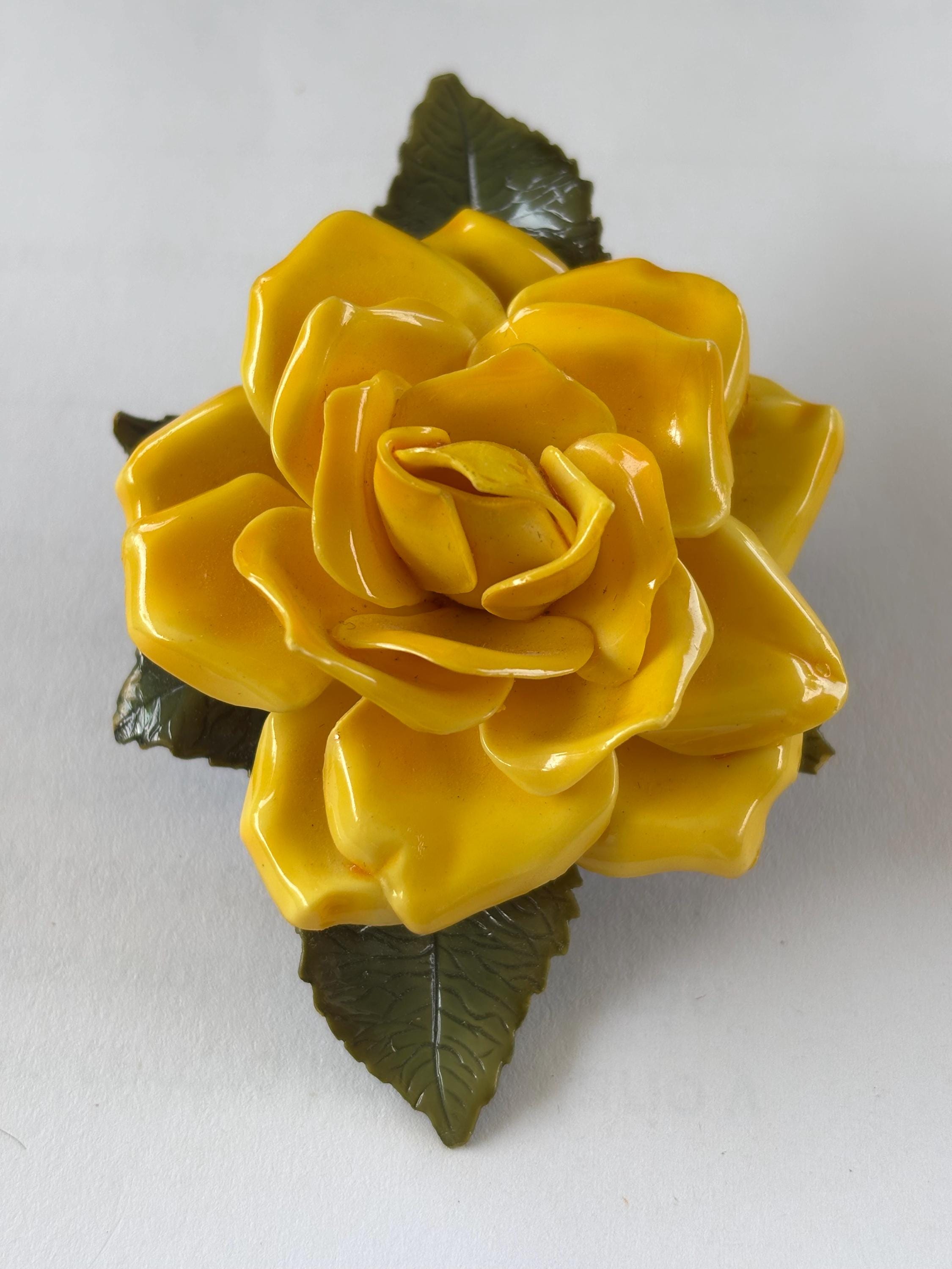 Pleased to offer this unsigned, beautifully executed Yellow Rose celluloid brooch with matching earrings. The brooch measures 3”H x 2” W and the earrings are 1” wide. Simple, elegant and classy the yellow rose, in modern contexts, symbolizes joy, happiness, and friendship, making it a suitable gift for friends, family, and colleagues to convey warmth and appreciation. Excellent condition and an unusual statement piece to accent your attire.