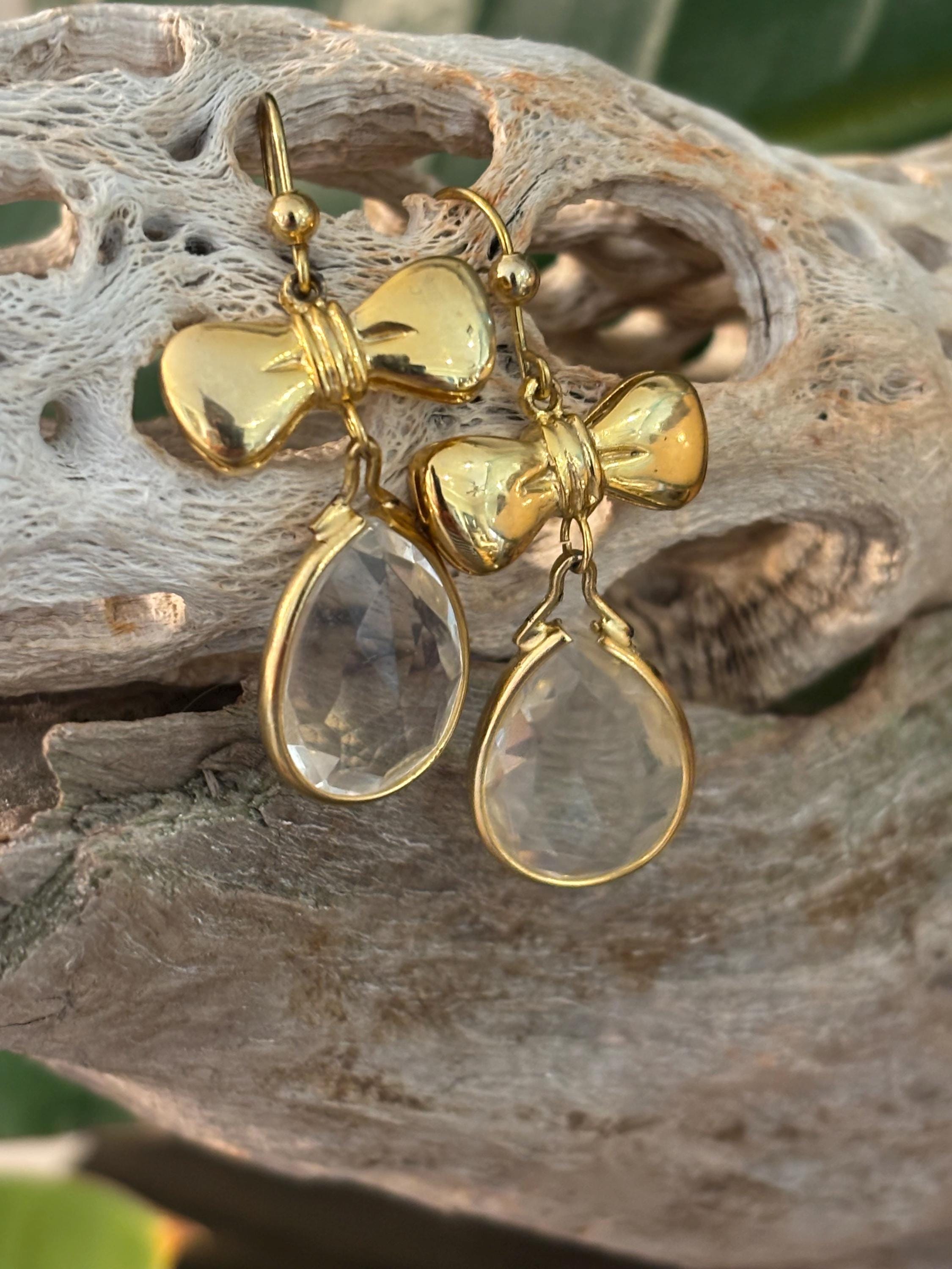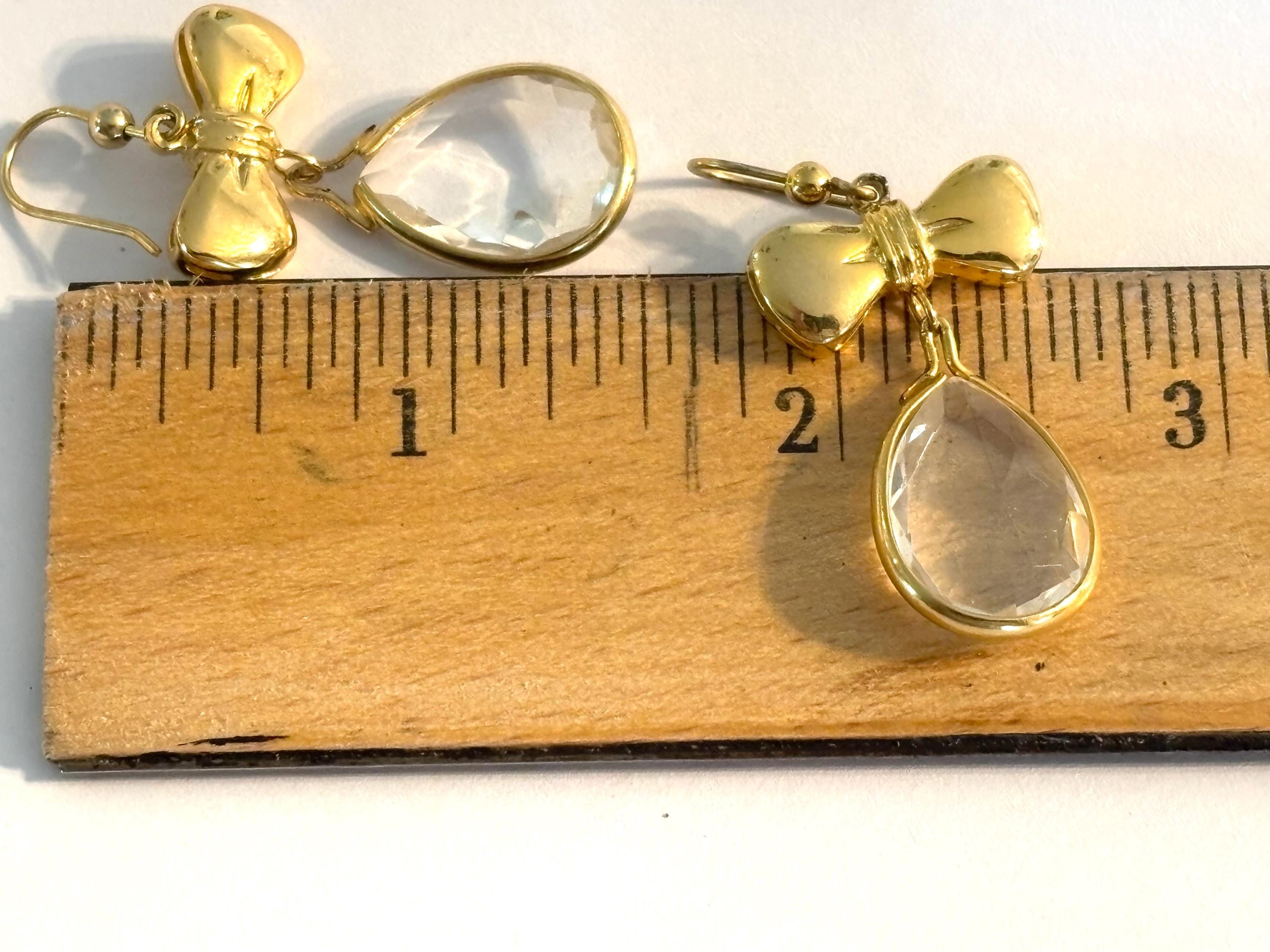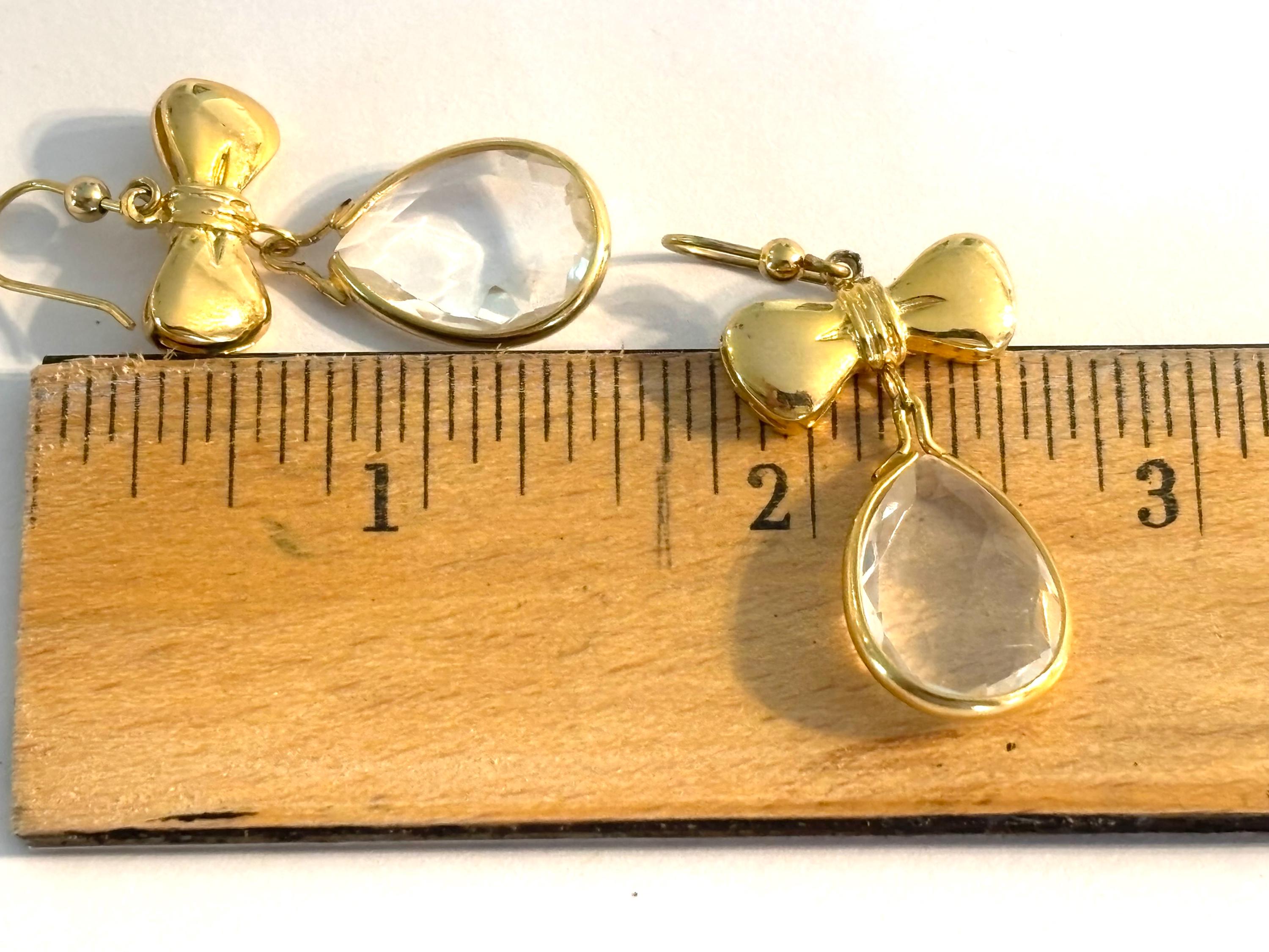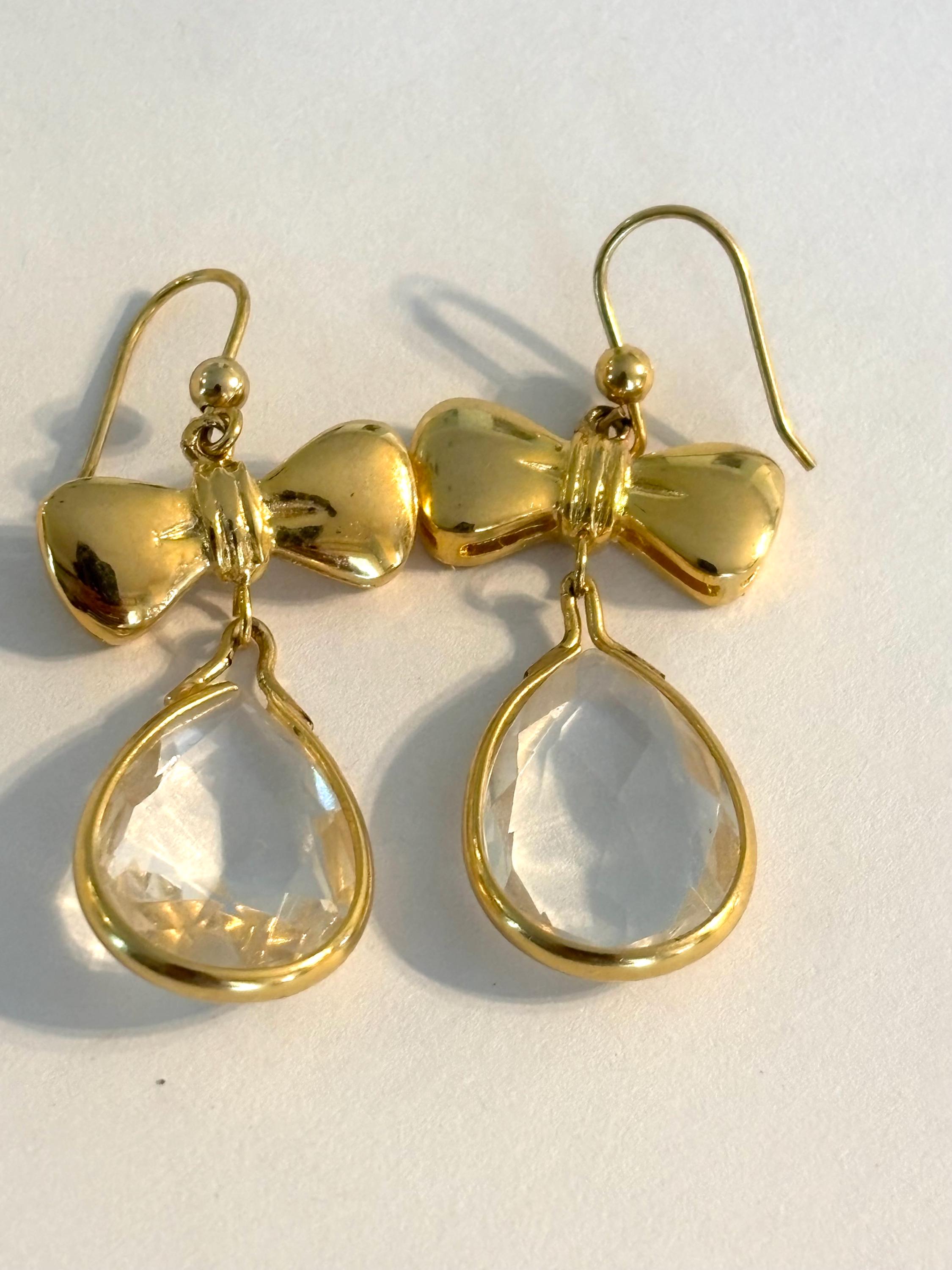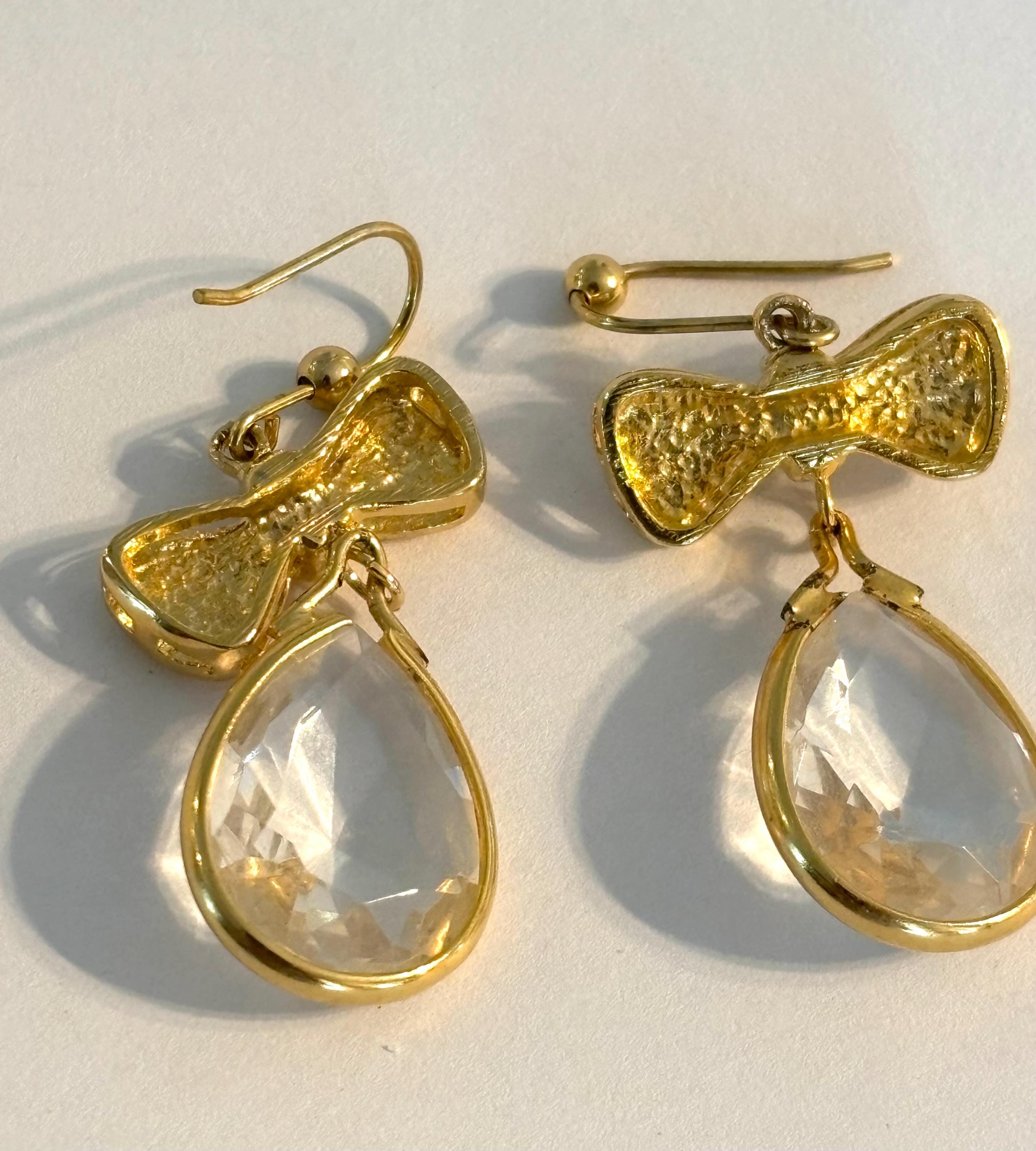 Vintage Bow Tie with Clear Teardrop Fadhion Earrings in a Gold tone finish, Fish Hook Wire Closure, Vintage 1980' -90' these are stunning. (see photos). The resurgence in Gold Tone jewelry for the past few years and these earrings are an investment in the "never out of style wardrobe accent jewelry! Simple and classic design , wear with your favorite little black dress or a casual top with trousers, dressed up or down, this one will not disappoint - it is truly a timeless piece! Details: Gold Tone Metal