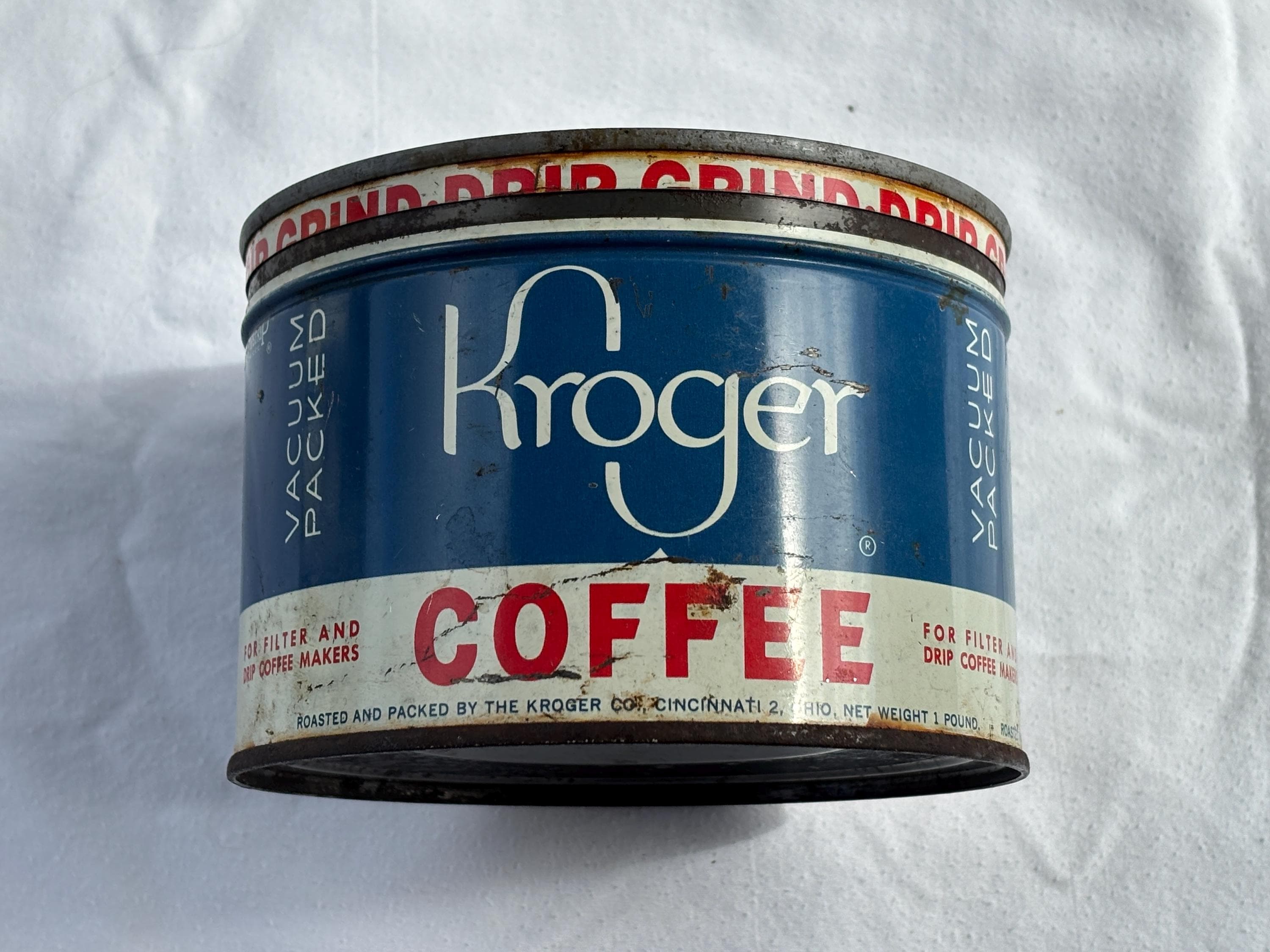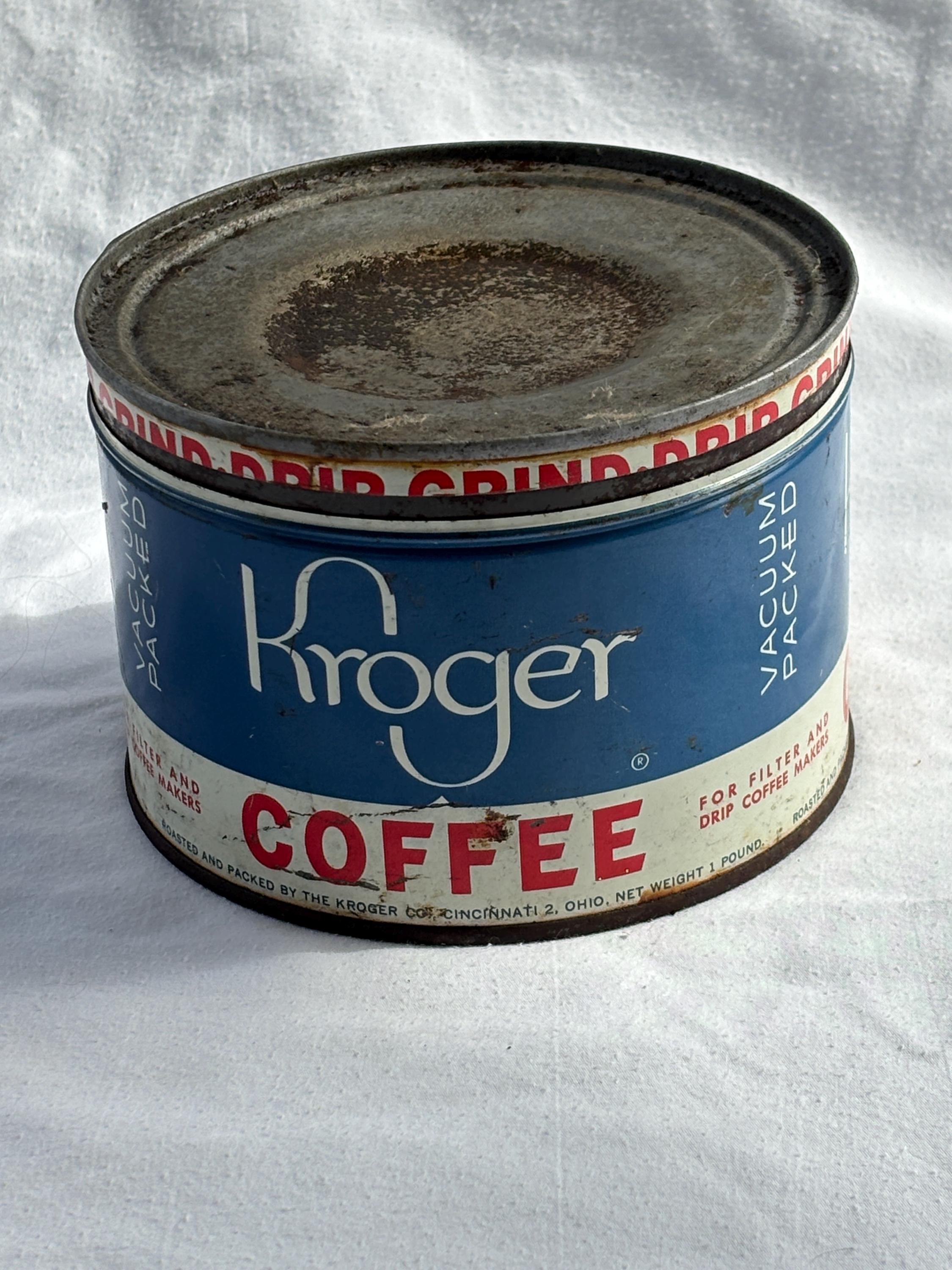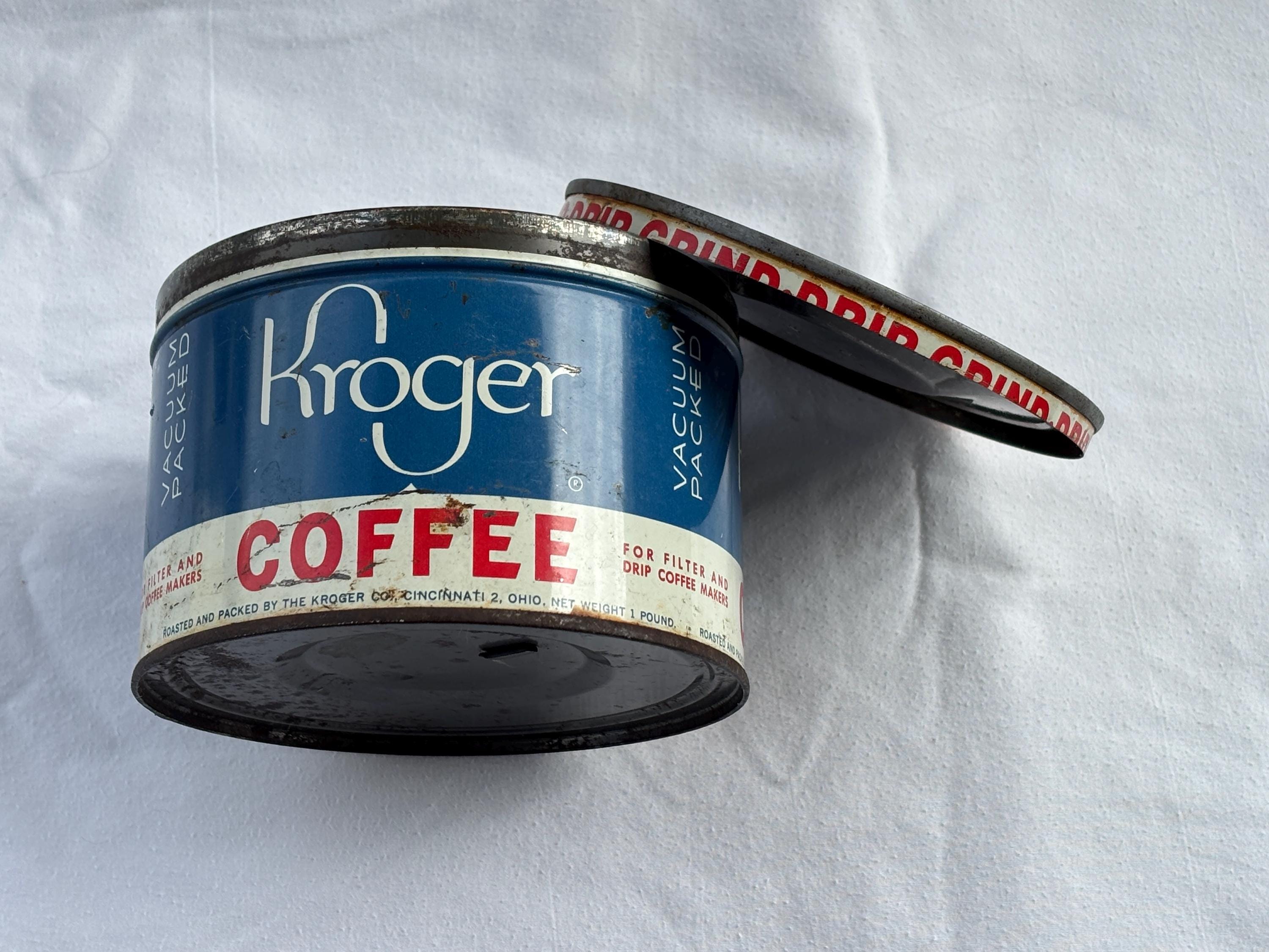 Vintage Coffee Collectible... Kroger Coffee Tin a product of the Kroger Company, Cincinnati, Ohio. The graphics are really good' minimum wear and minor scratches, some oxidation on the key wind lid. This tin measures 3.5" high 5" diameter, c1945-50's