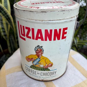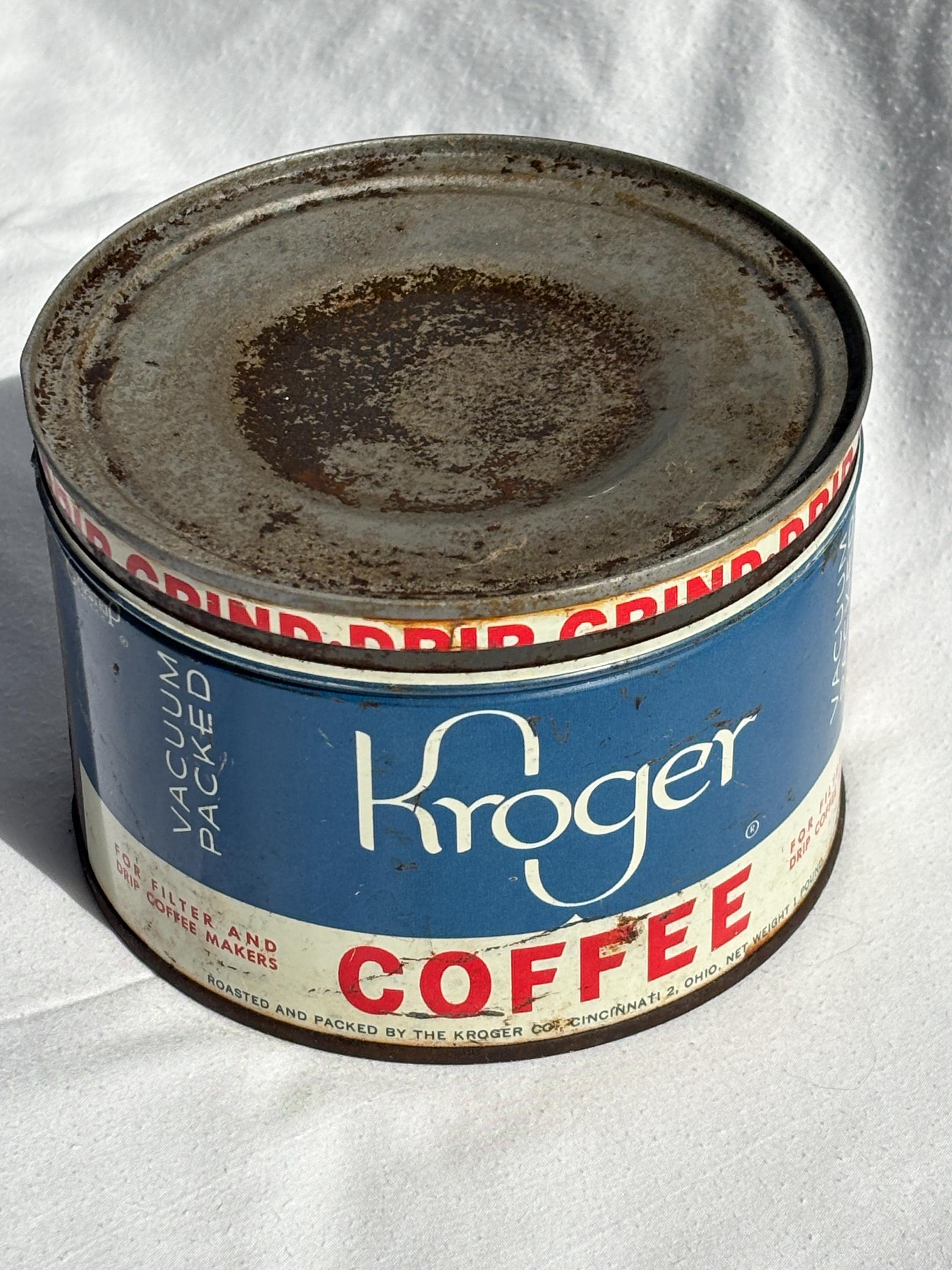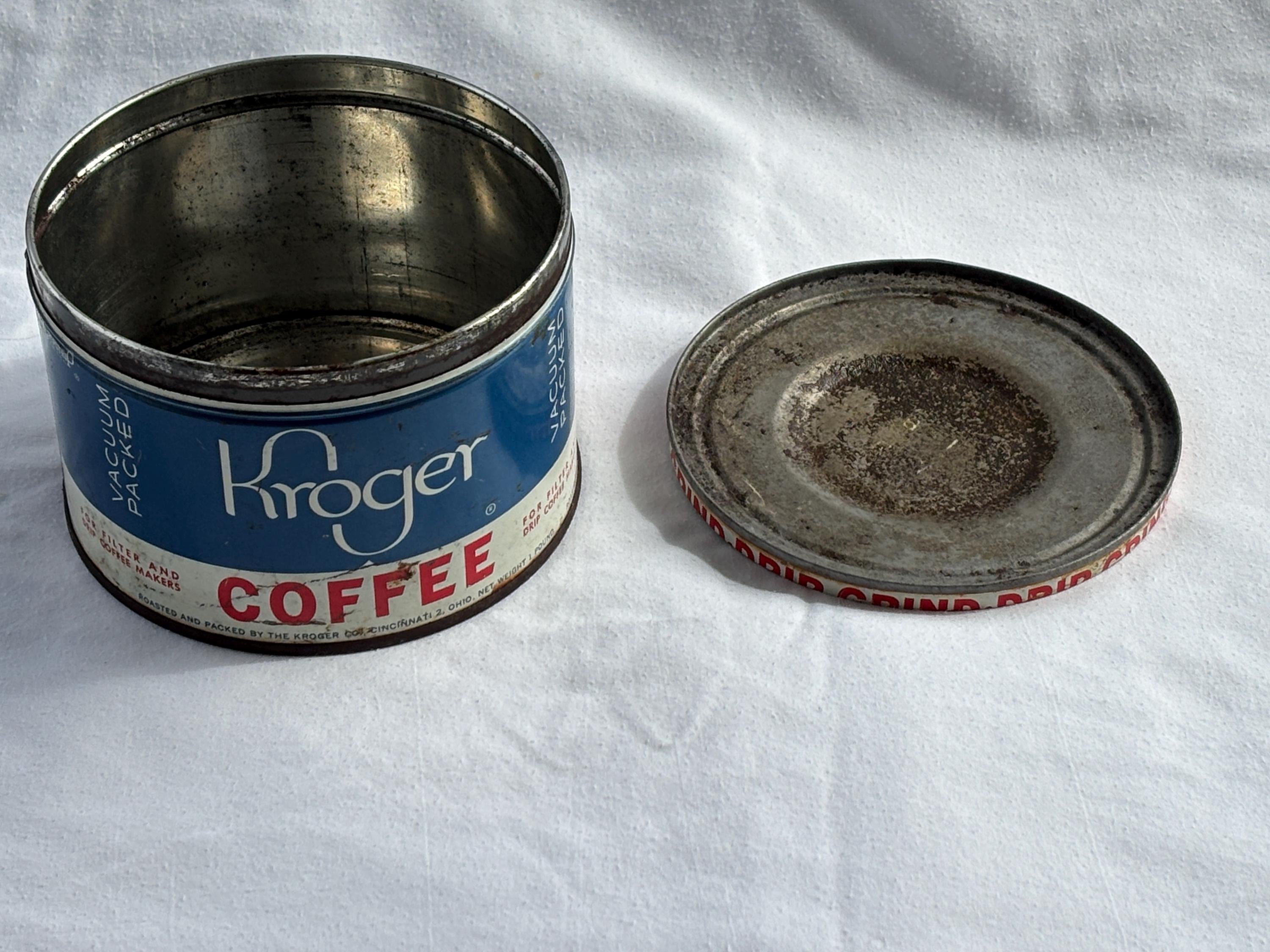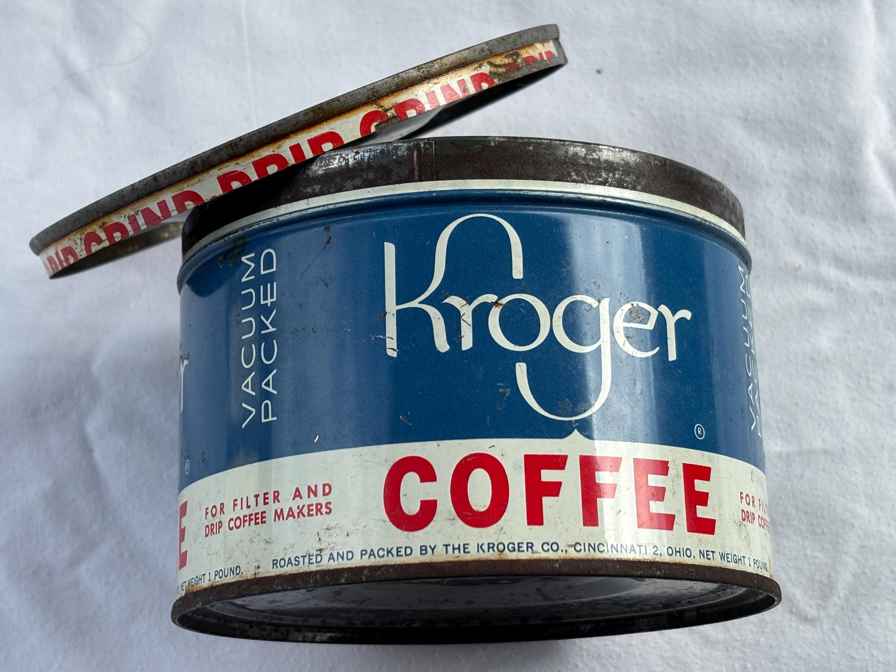Vintage Coffee Collectible... Kroger Coffee Tin a product of the Kroger Company, Cincinnati, Ohio. The graphics are really good' minimum wear and minor scratches, some oxidation on the key wind lid. This tin measures 3.5" high 5" diameter, c1945-50's